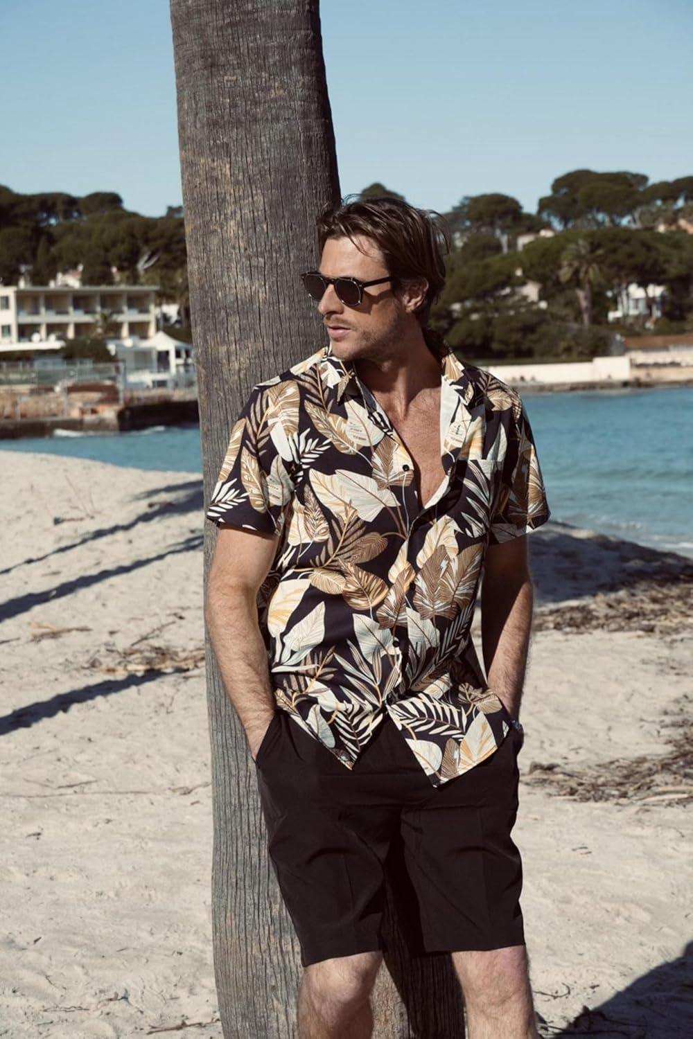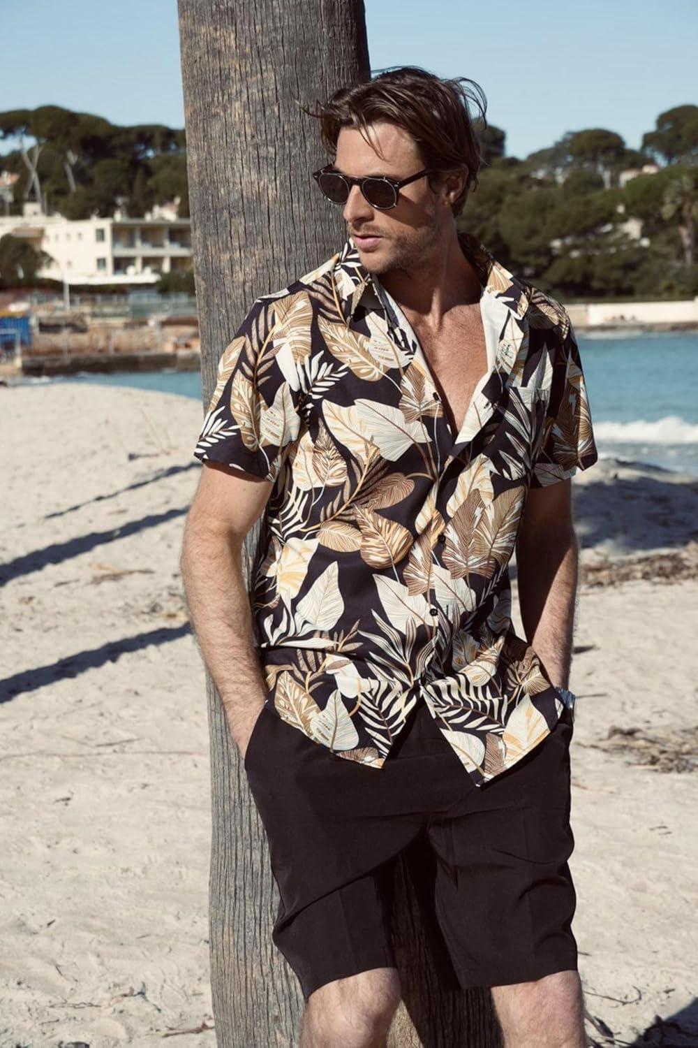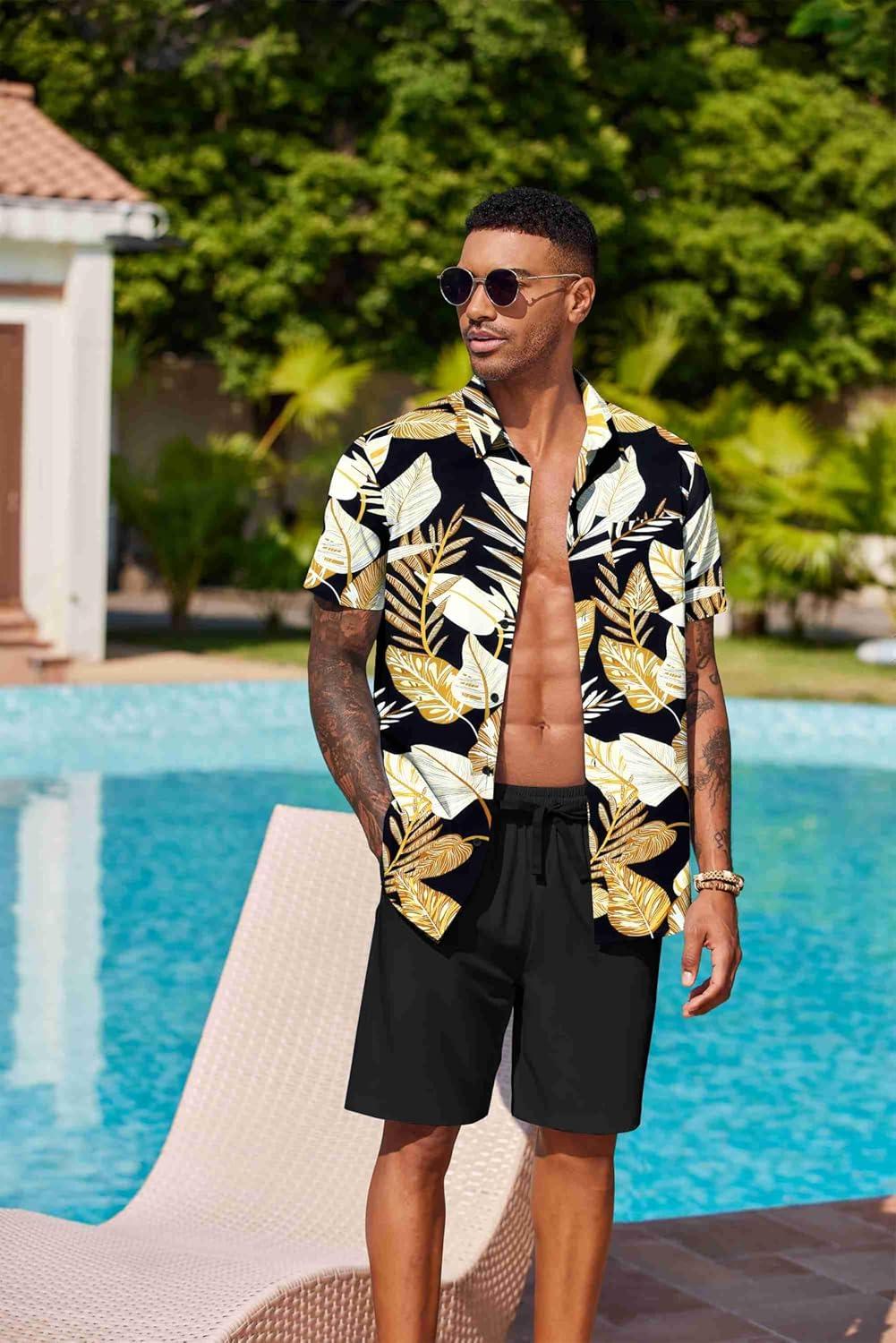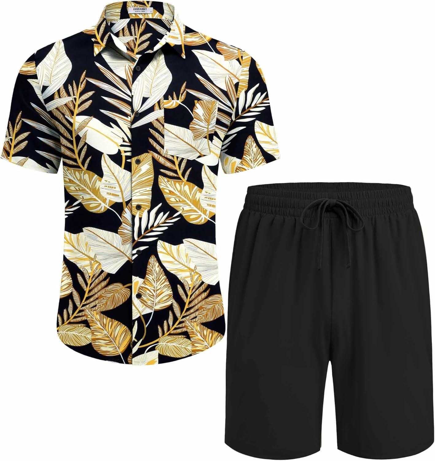 COOFANDY Men’s Hawaiian 2 Piece Outfits Summer Beach Matching Set Short Sleeve Floral Shirts and Shorts(Palm Leaf Black)