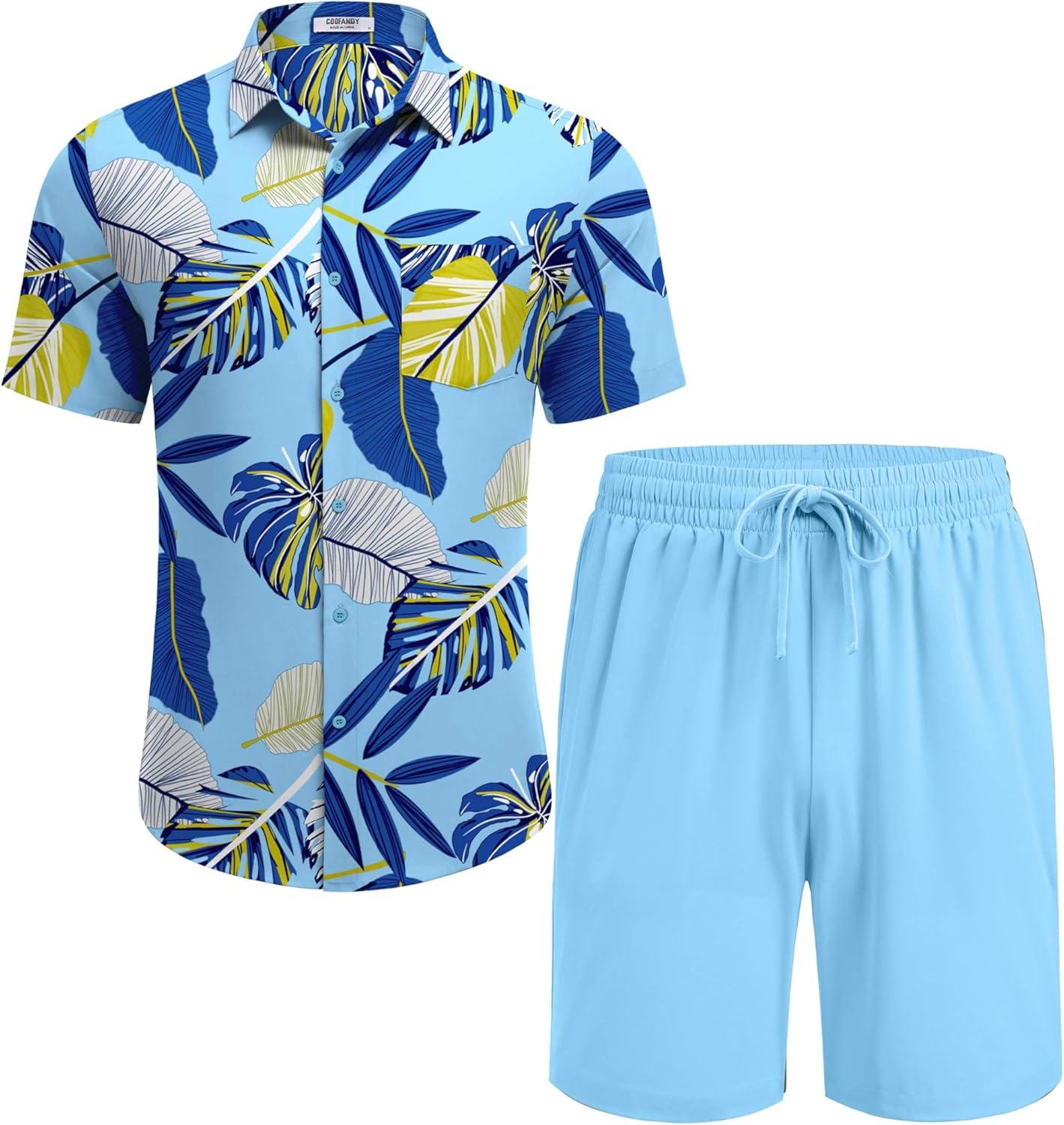 COOFANDY Men’s Hawaiian 2 Piece Outfits Summer Beach Matching Set Short Sleeve Floral Shirts and Shorts(Palm Leaf Blue)