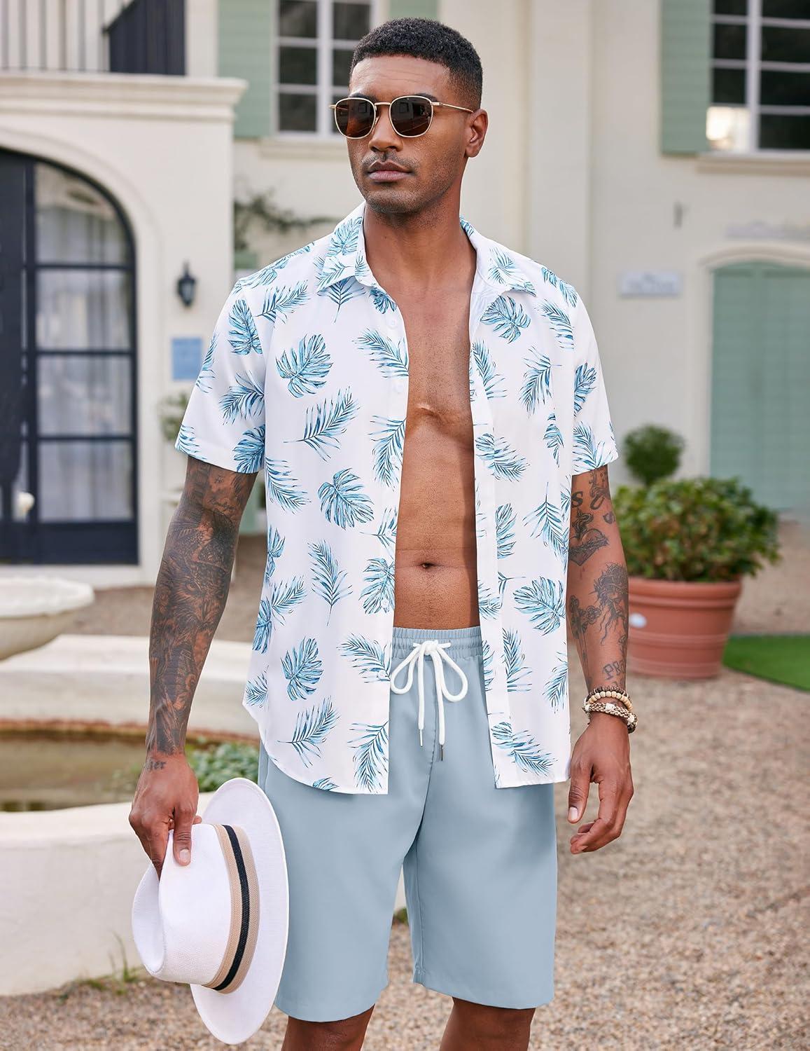 COOFANDY Men’s Hawaiian Beach Shorts Elastic Waist Drawstring Lightweight Summer Casual Shorts with Pocket(White&green Palm Tree)