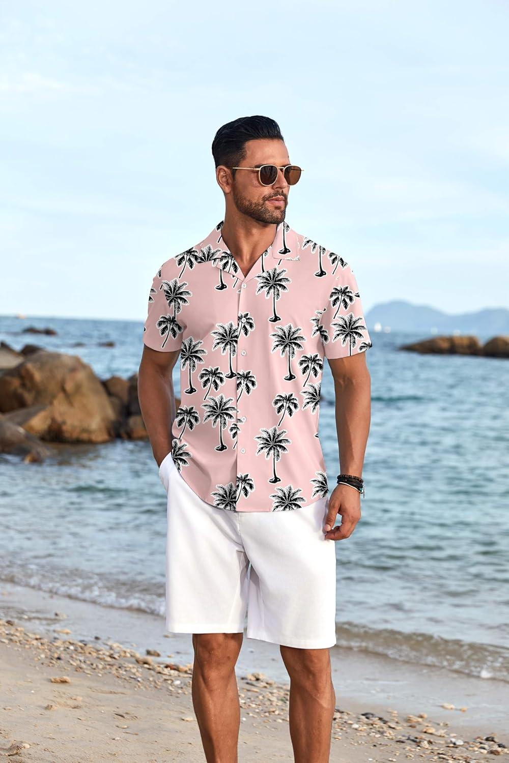 COOFANDY Men’s Hawaiian Floral Shirts Short Sleeve Button Down Shirts Tropical Summer Beach Shirts(Coconut Tree-pink)