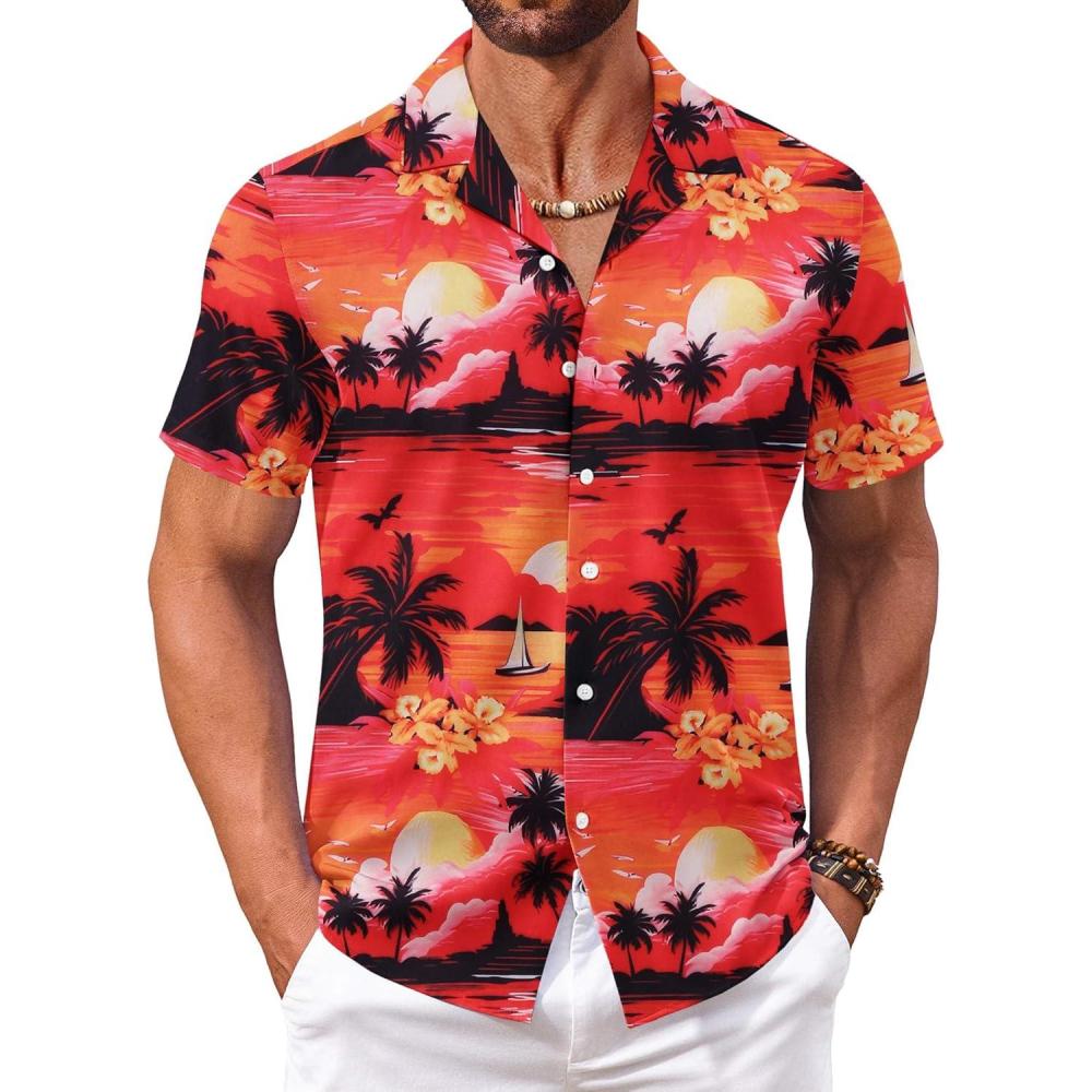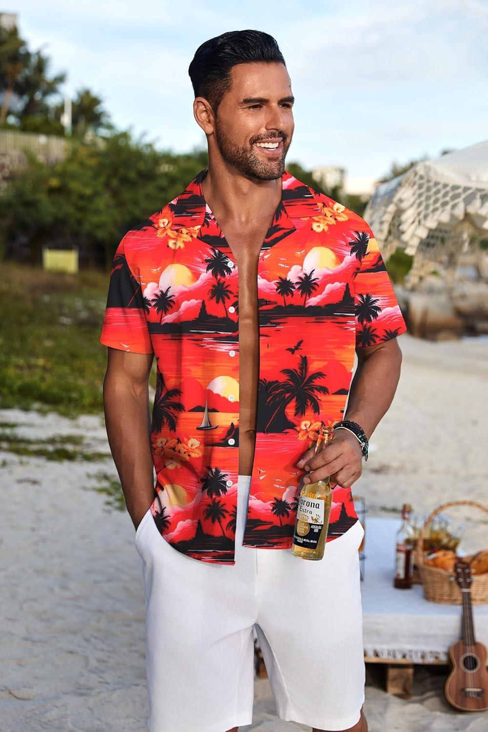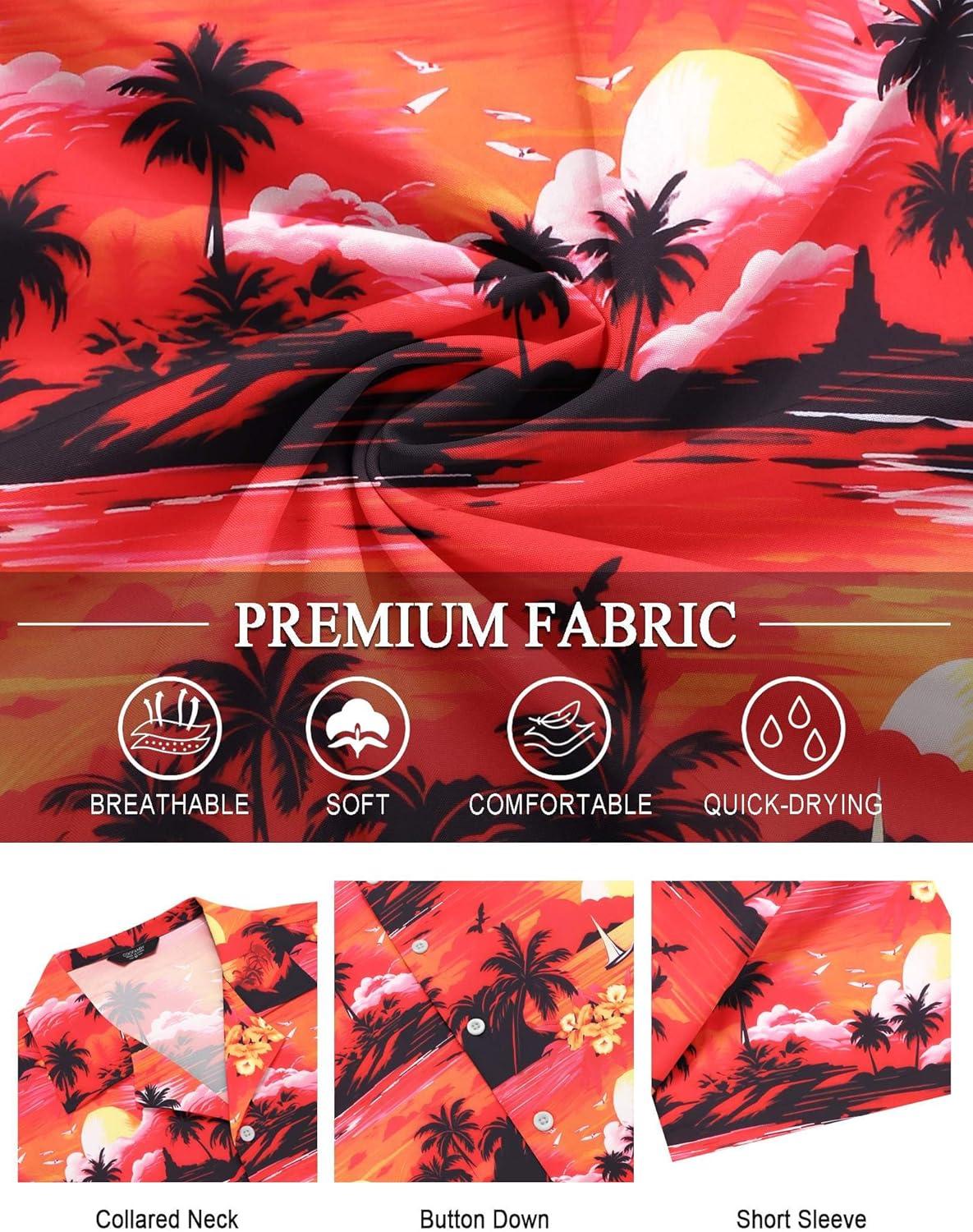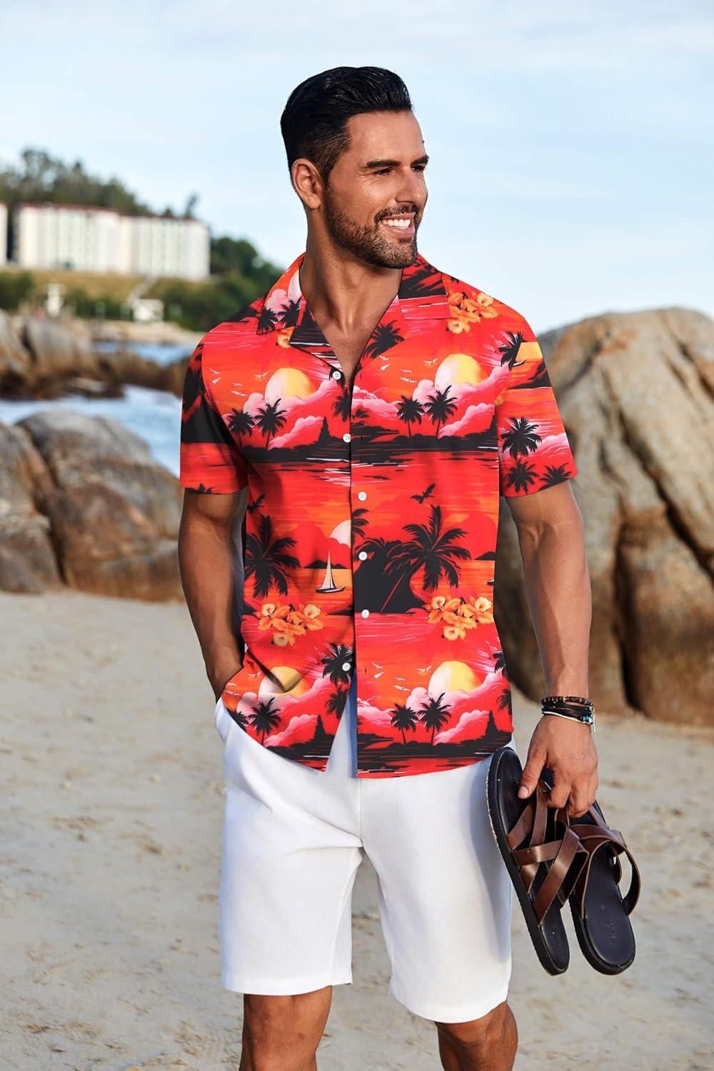 COOFANDY Men’s Hawaiian Floral Shirts Short Sleeve Button Down Shirts Tropical Summer Beach Shirts(Island Sunset-orange Red)