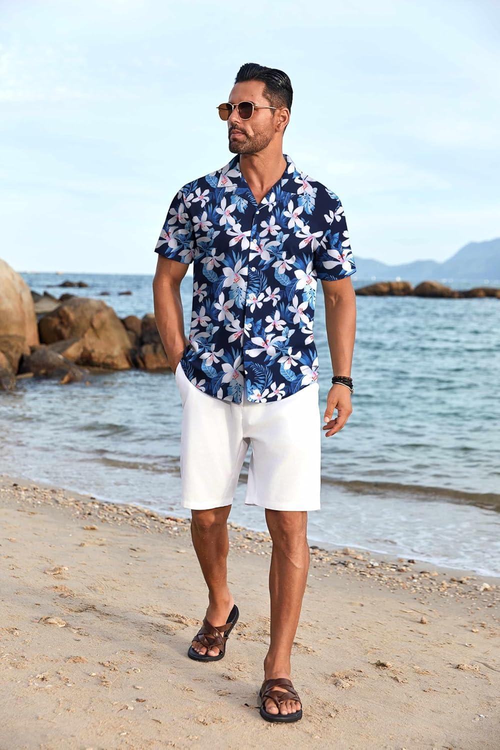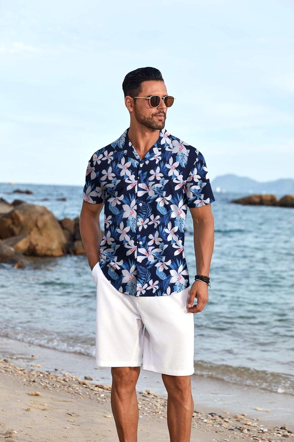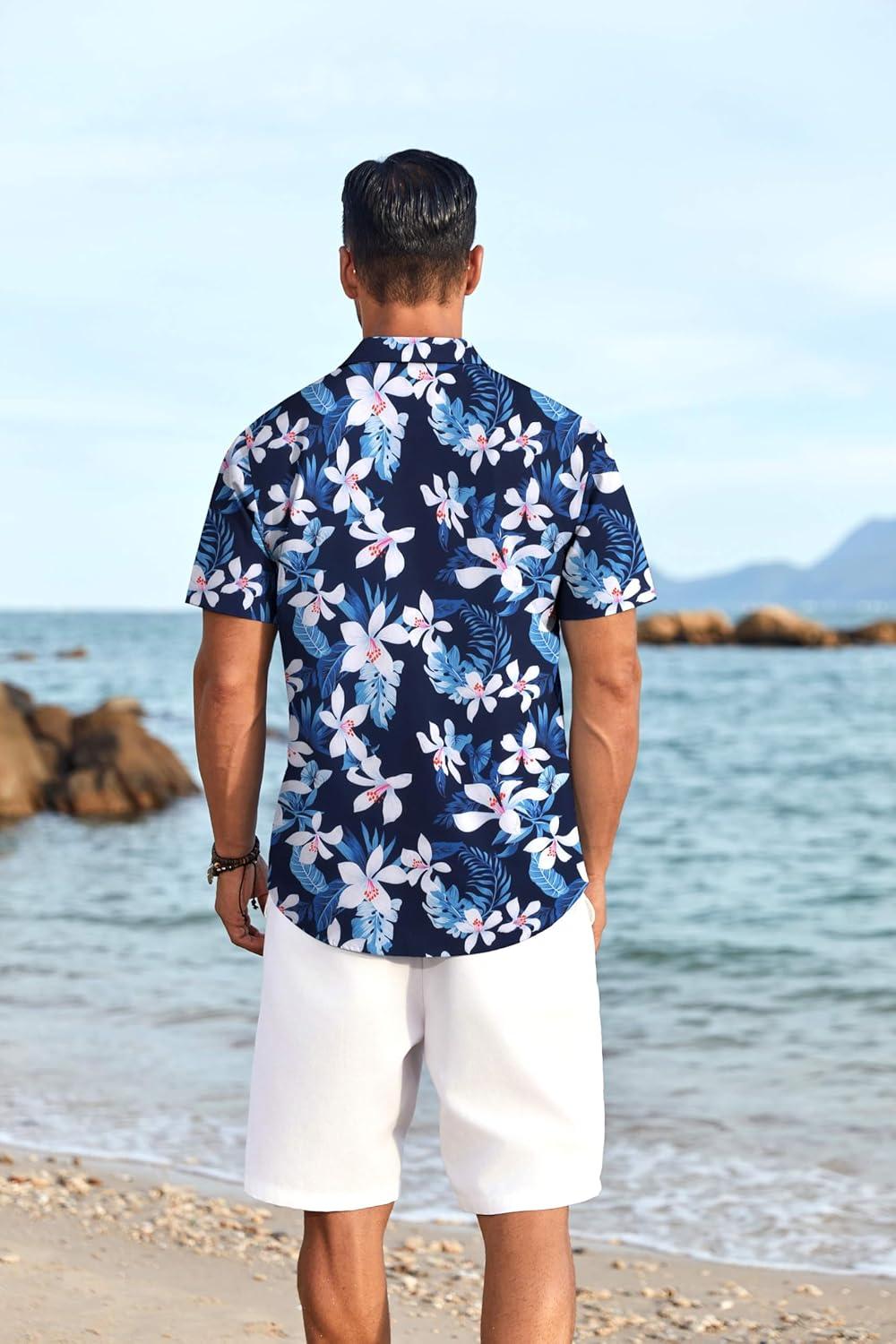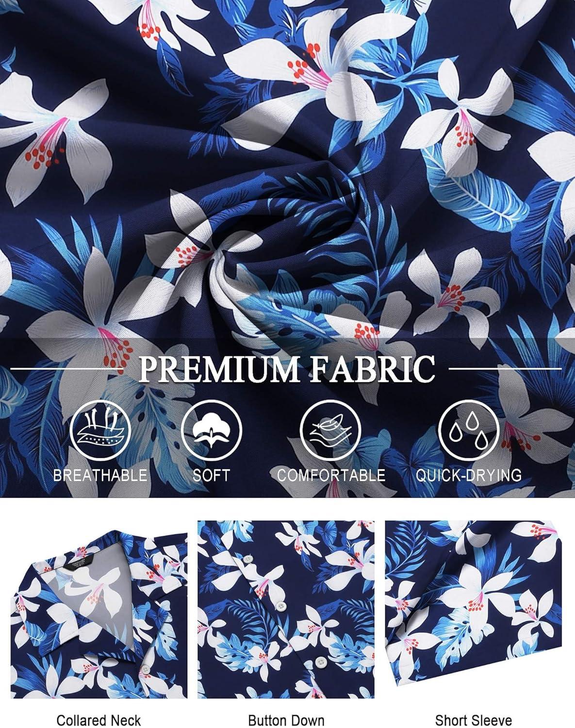 COOFANDY Men’s Hawaiian Floral Shirts Short Sleeve Button Down Shirts Tropical Summer Beach Shirts(White Floral-navy)