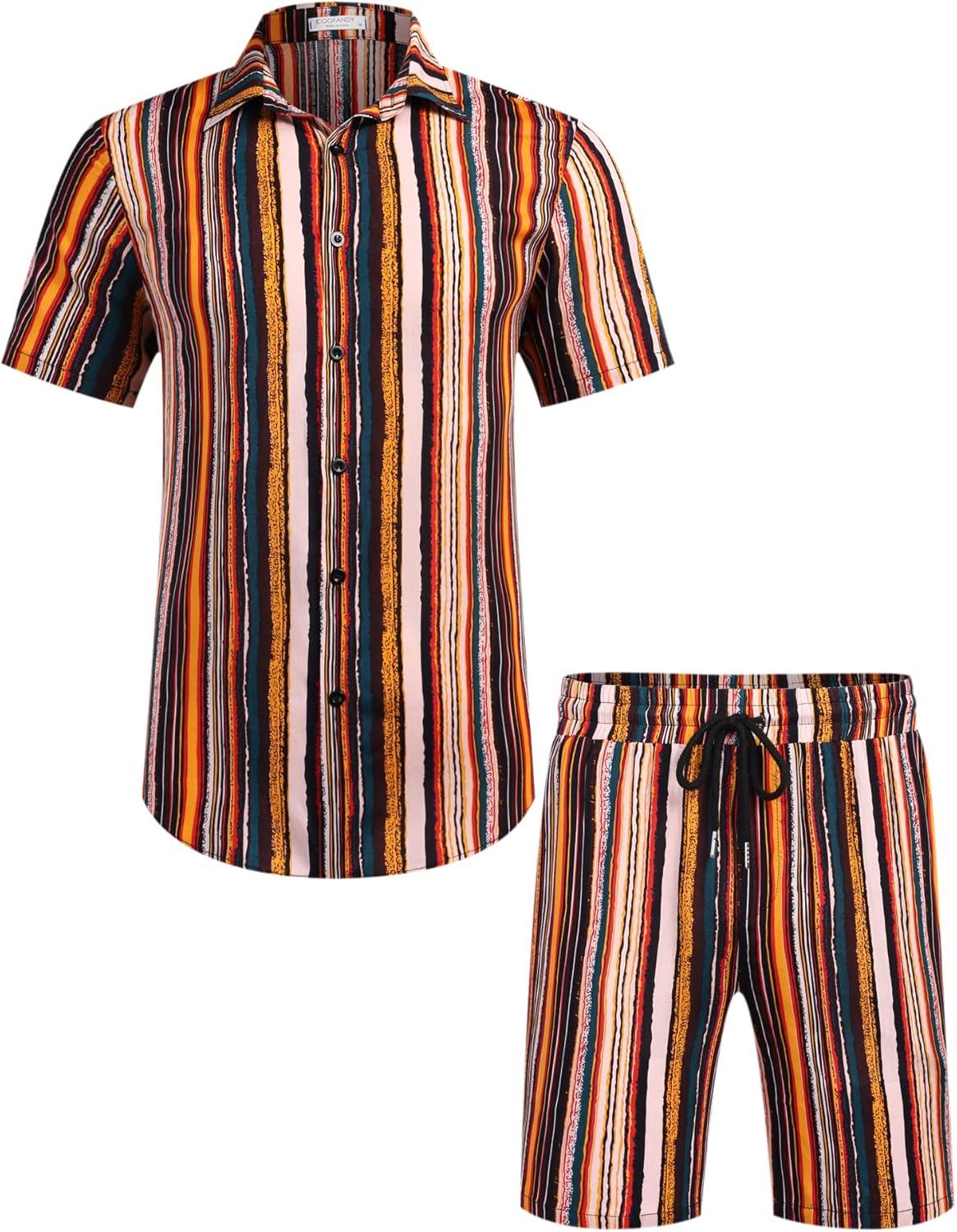 COOFANDY Men's Hawaiian Matching Set Summer Beach 2 Piece Outfits Flower Button Down Shirts and Shorts Vacation Outfits(Multicolor Stripes)