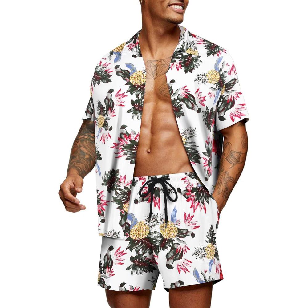 COOFANDY Men's Hawaiian Matching Set Summer Beach 2 Piece Outfits Flower Button Down Shirts and Shorts Vacation Outfits(Pineapple Flower)