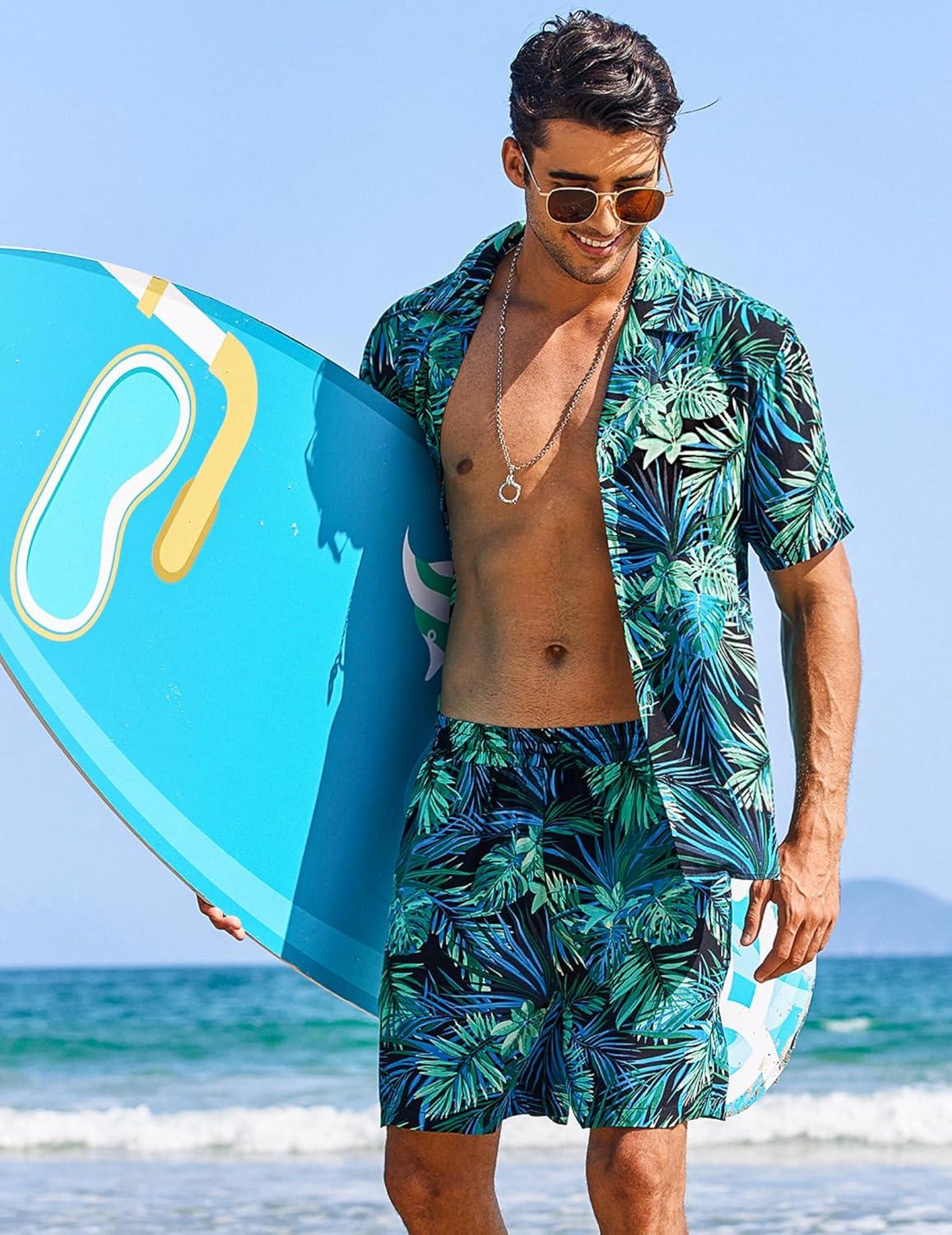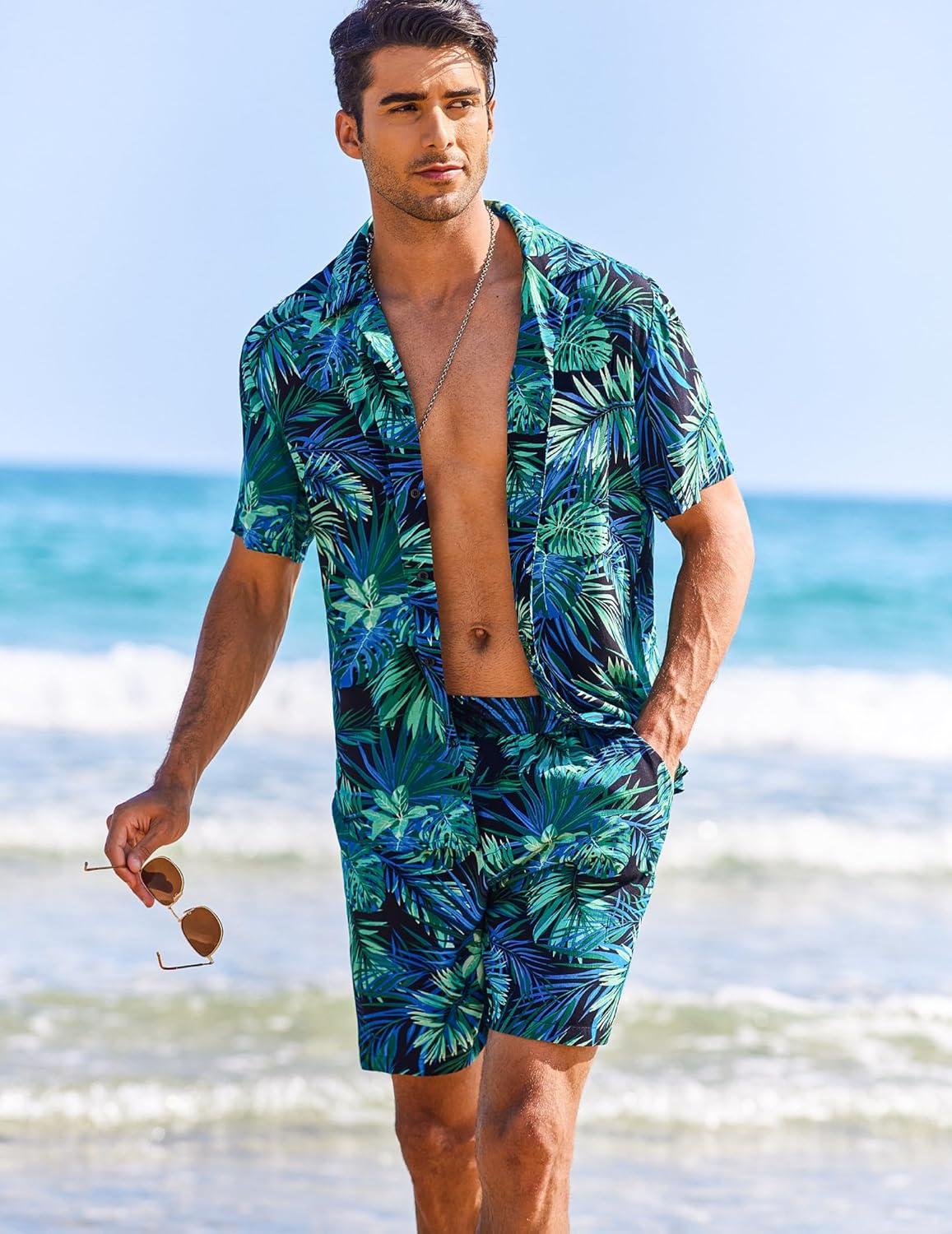 COOFANDY Men’s Hawaiian Matching Shirt and Shorts Set Summer Beach 2 Piece Outfits Short Sleeve Cuban Shirts and Shorts(Leaves-blue)