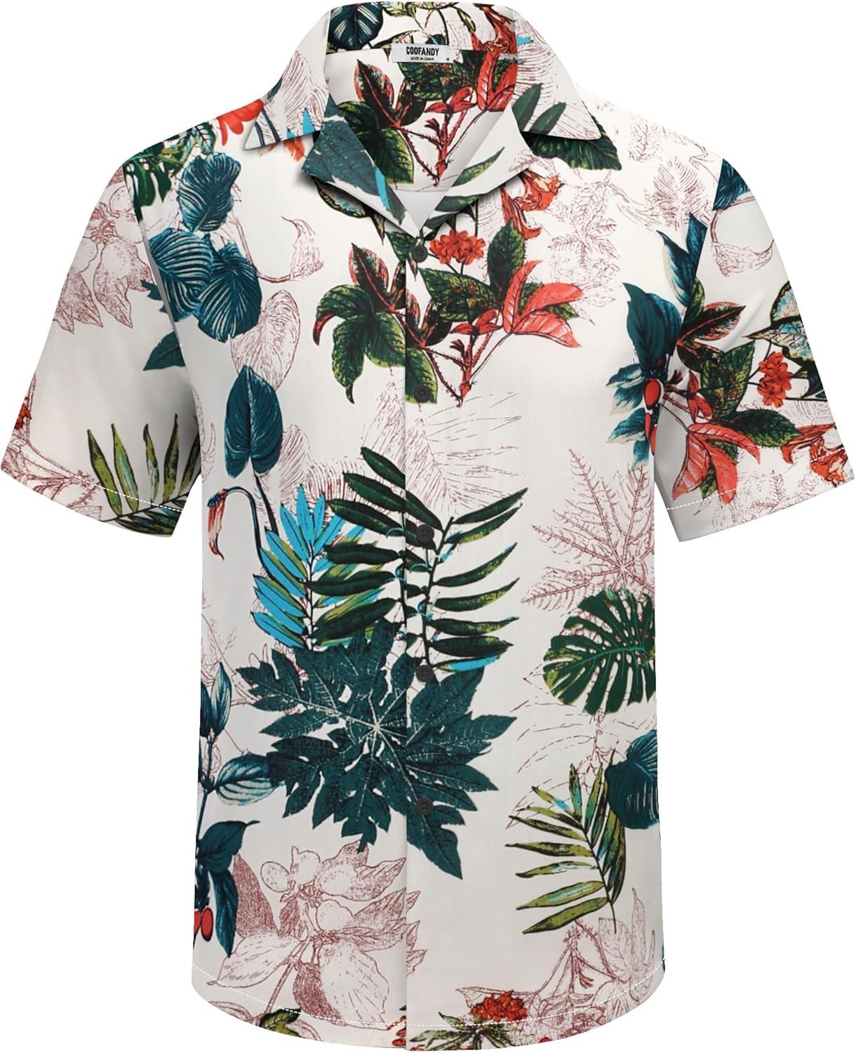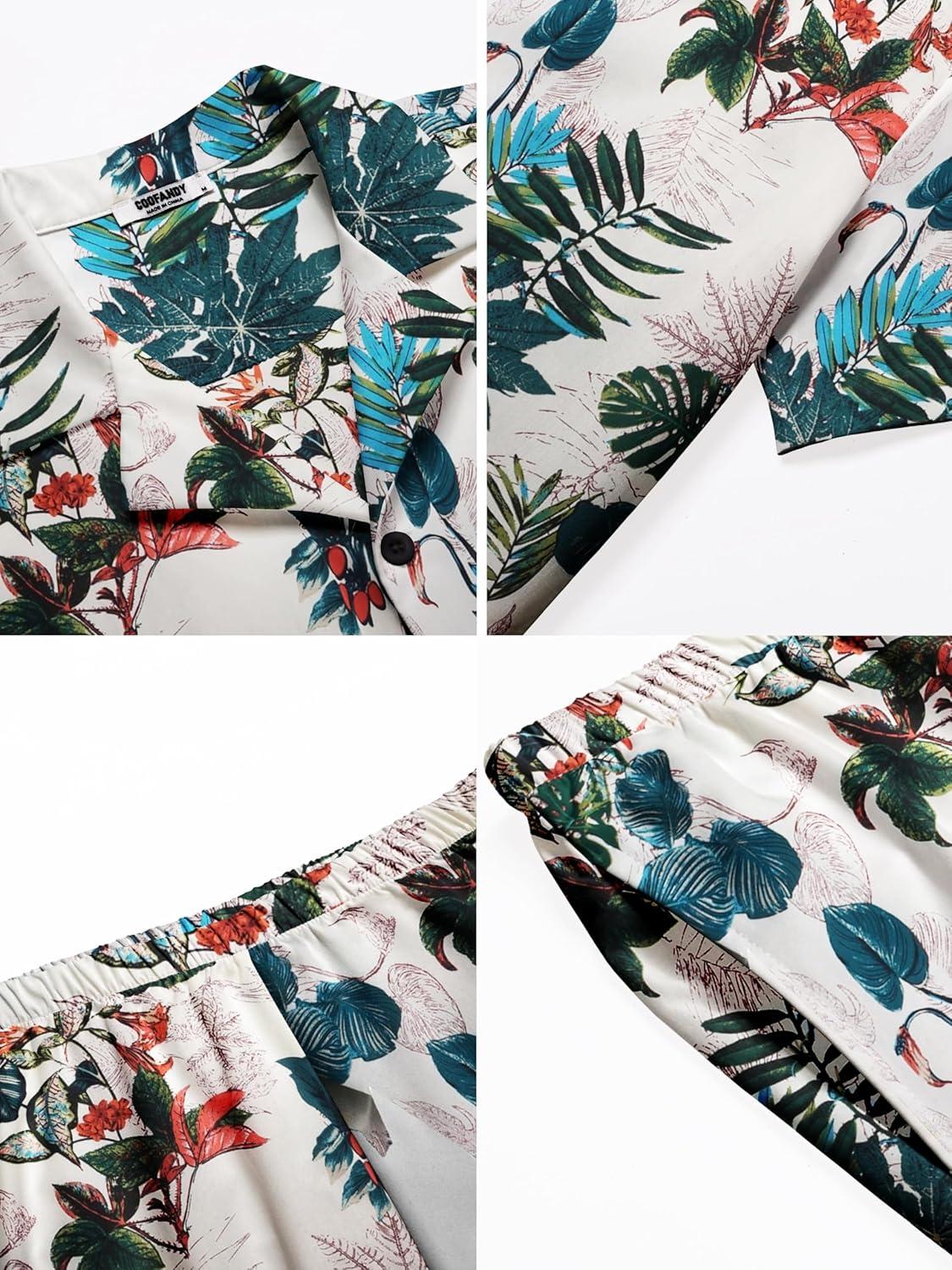 COOFANDY Men's Hawaiian Matching Shirt and Shorts Set Summer Beach 2 Piece Outfits Short Sleeve Cuban Shirts and Shorts(Leaves-white)