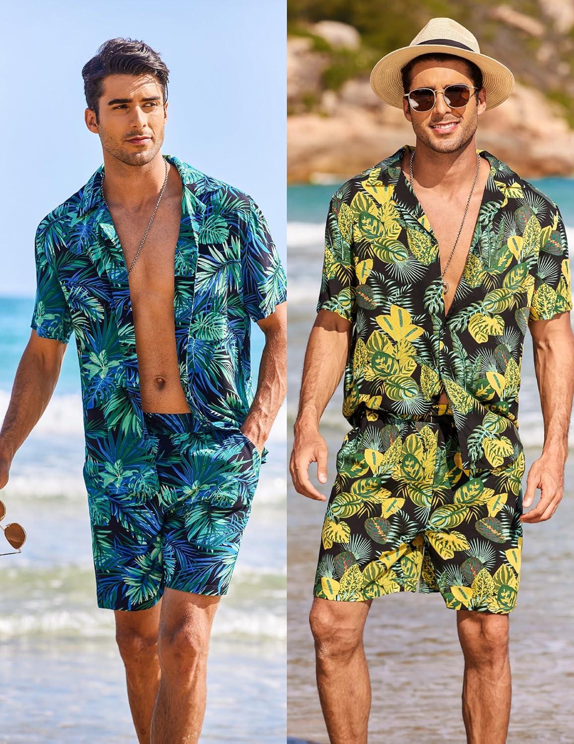 COOFANDY Men’s Hawaiian Matching Shirt and Shorts Set Summer Beach 2 Piece Outfits Short Sleeve Cuban Shirts and Shorts(Rainforest-yellow)