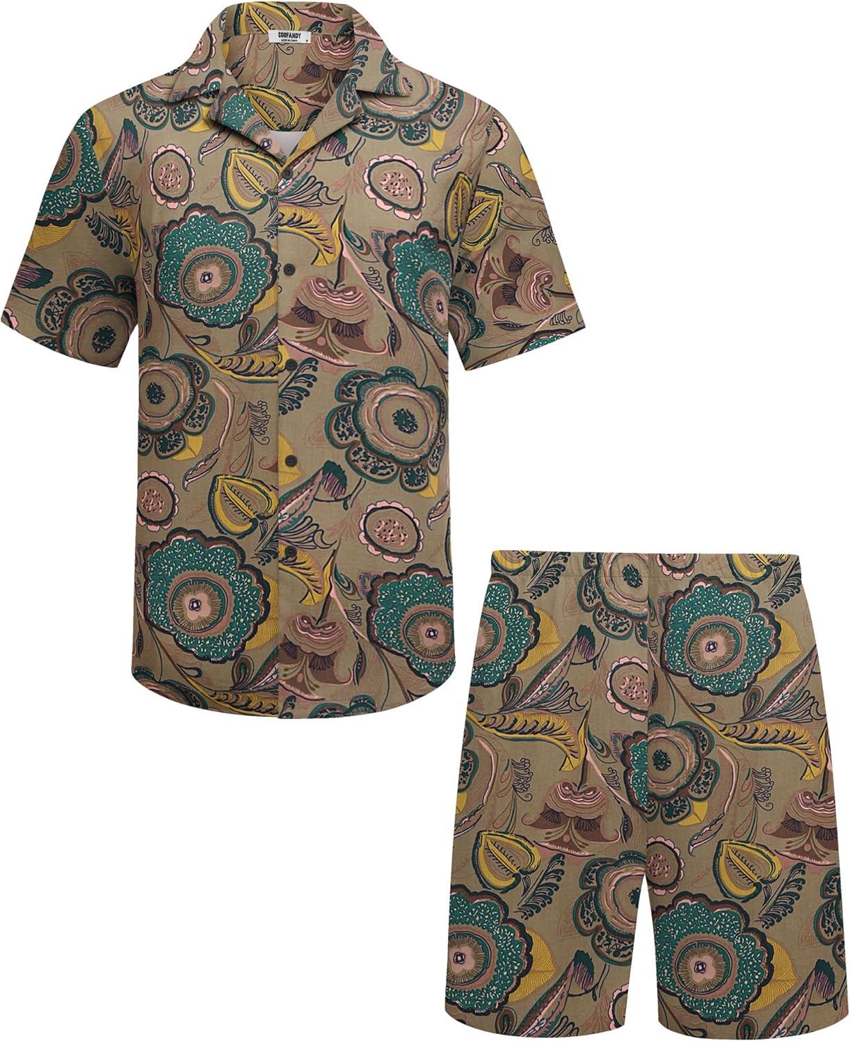 COOFANDY Men’s Hawaiian Matching Shirt and Shorts Set Summer Beach 2 Piece Outfits Short Sleeve Cuban Shirts and Shorts(Retro Brown)
