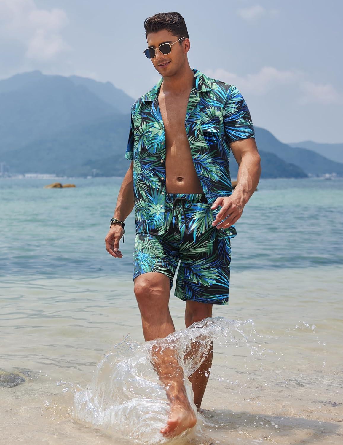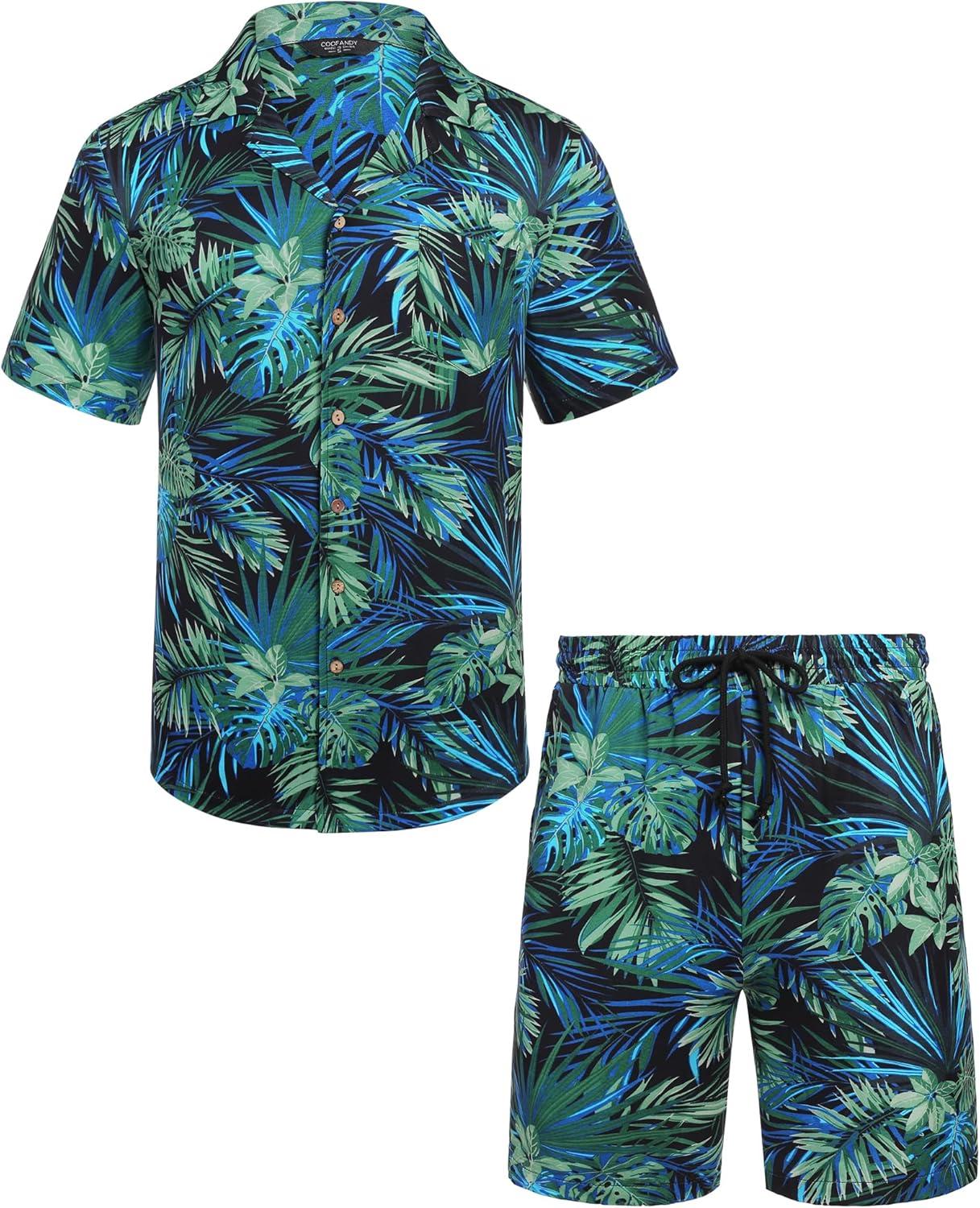 COOFANDY Mens Hawaiian Shirt and Shorts Set 2 Piece Vacation Outfits Floral Button Down Shirt(Blue&green)