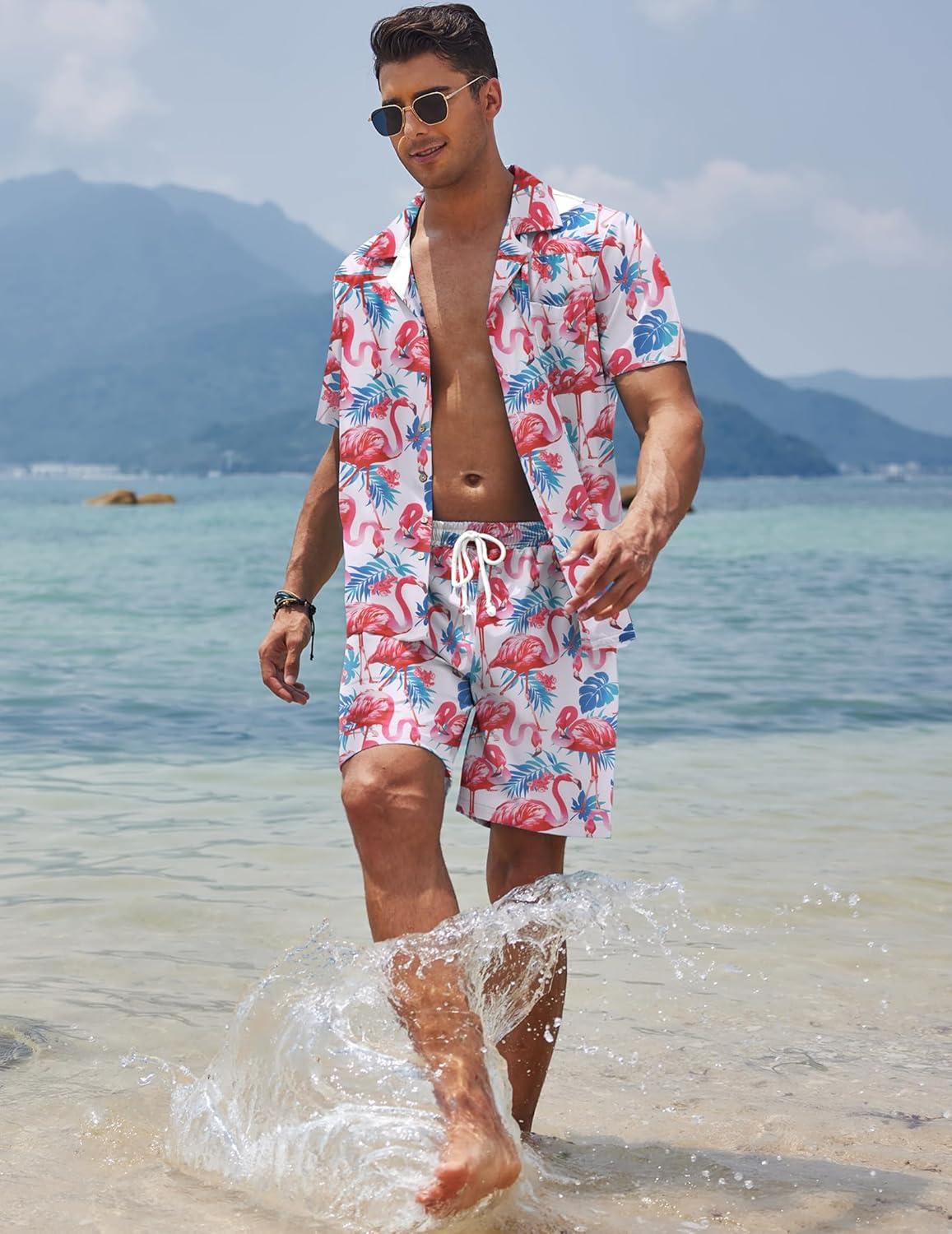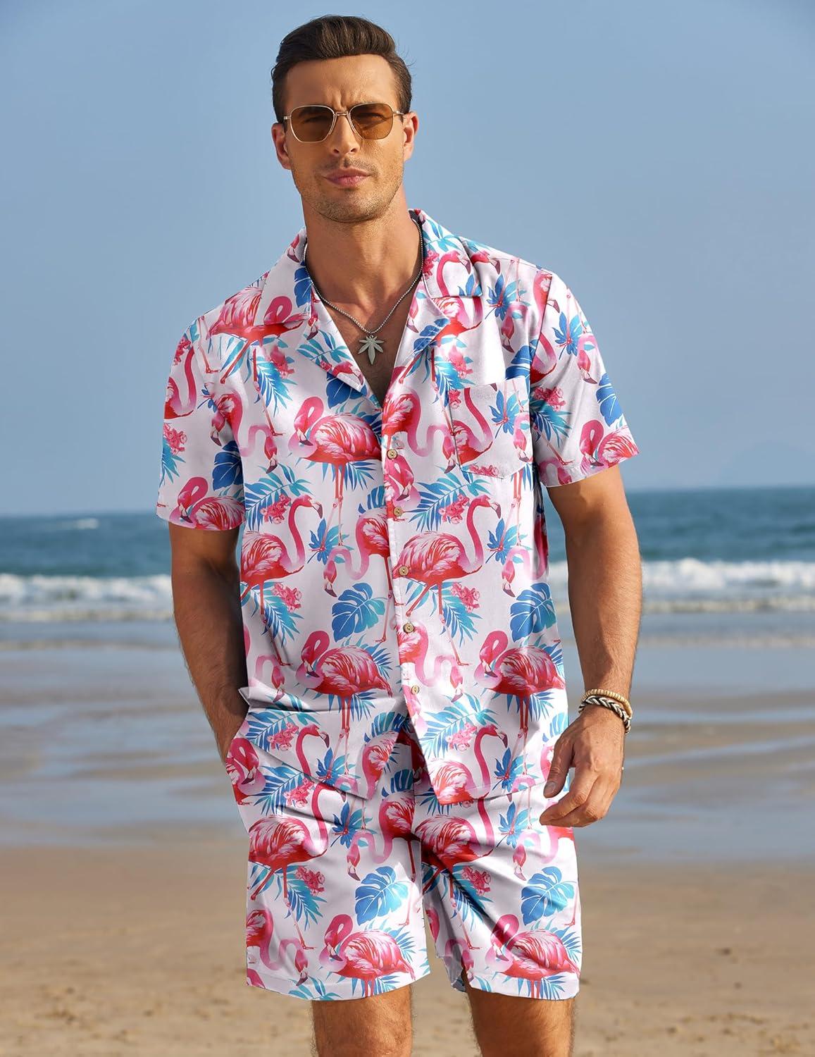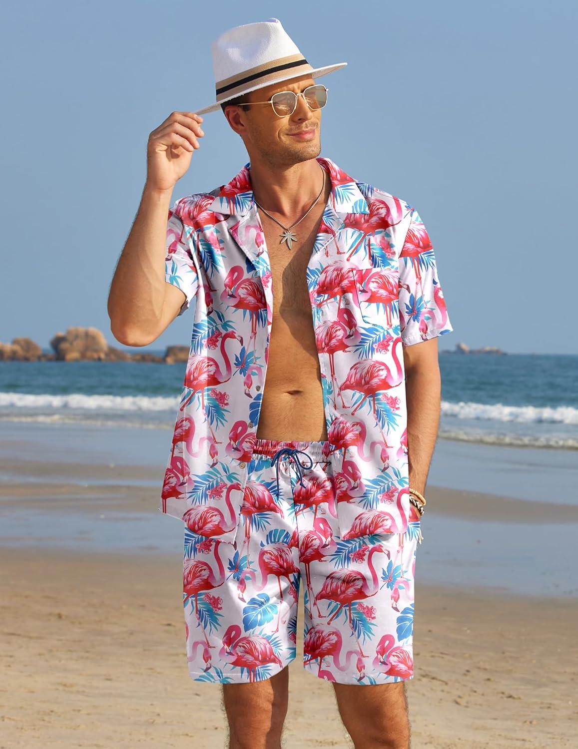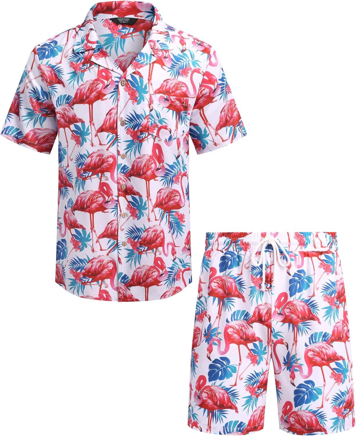 COOFANDY Mens Hawaiian Shirt and Shorts Set 2 Piece Vacation Outfits Floral Button Down Shirt(Flamingo)