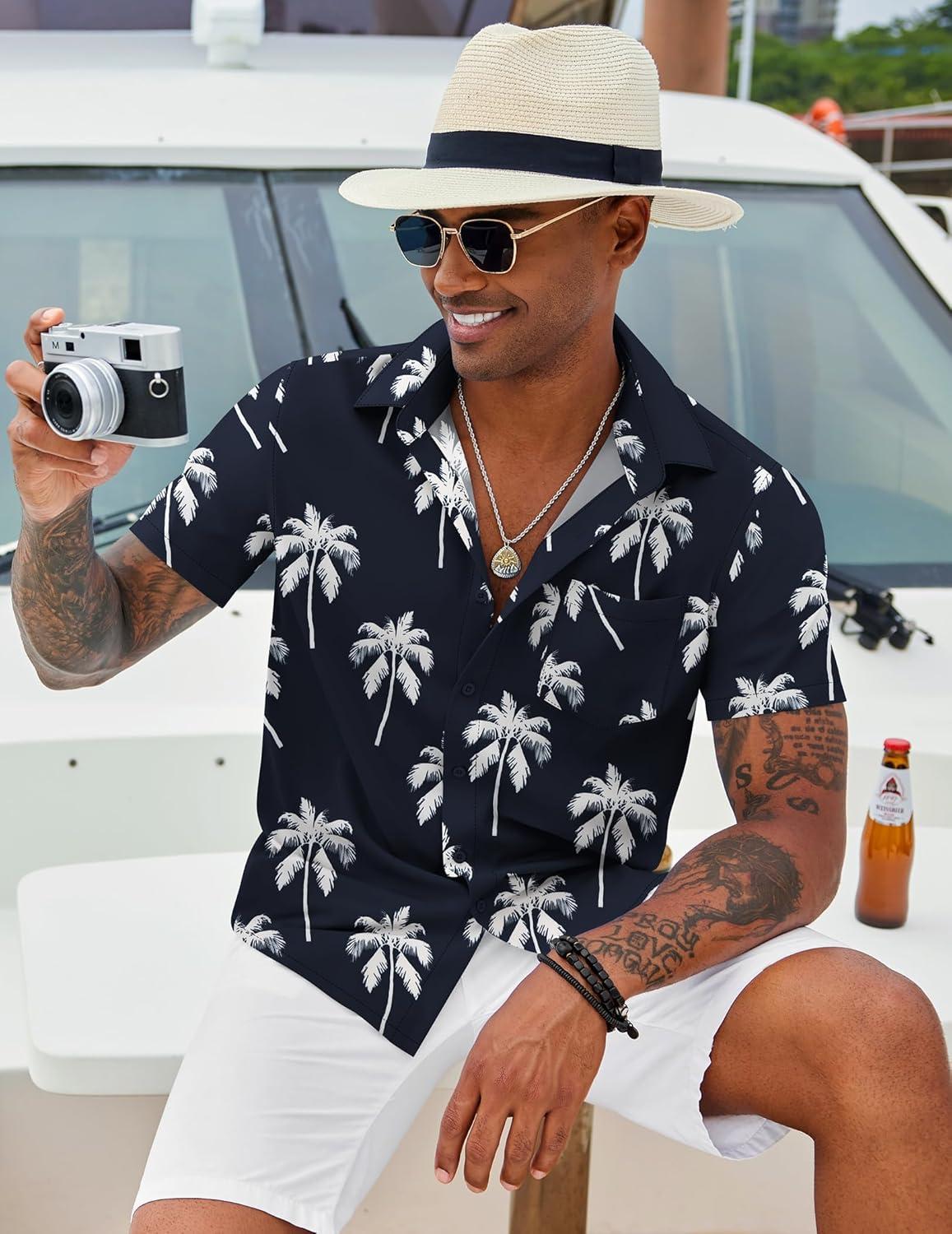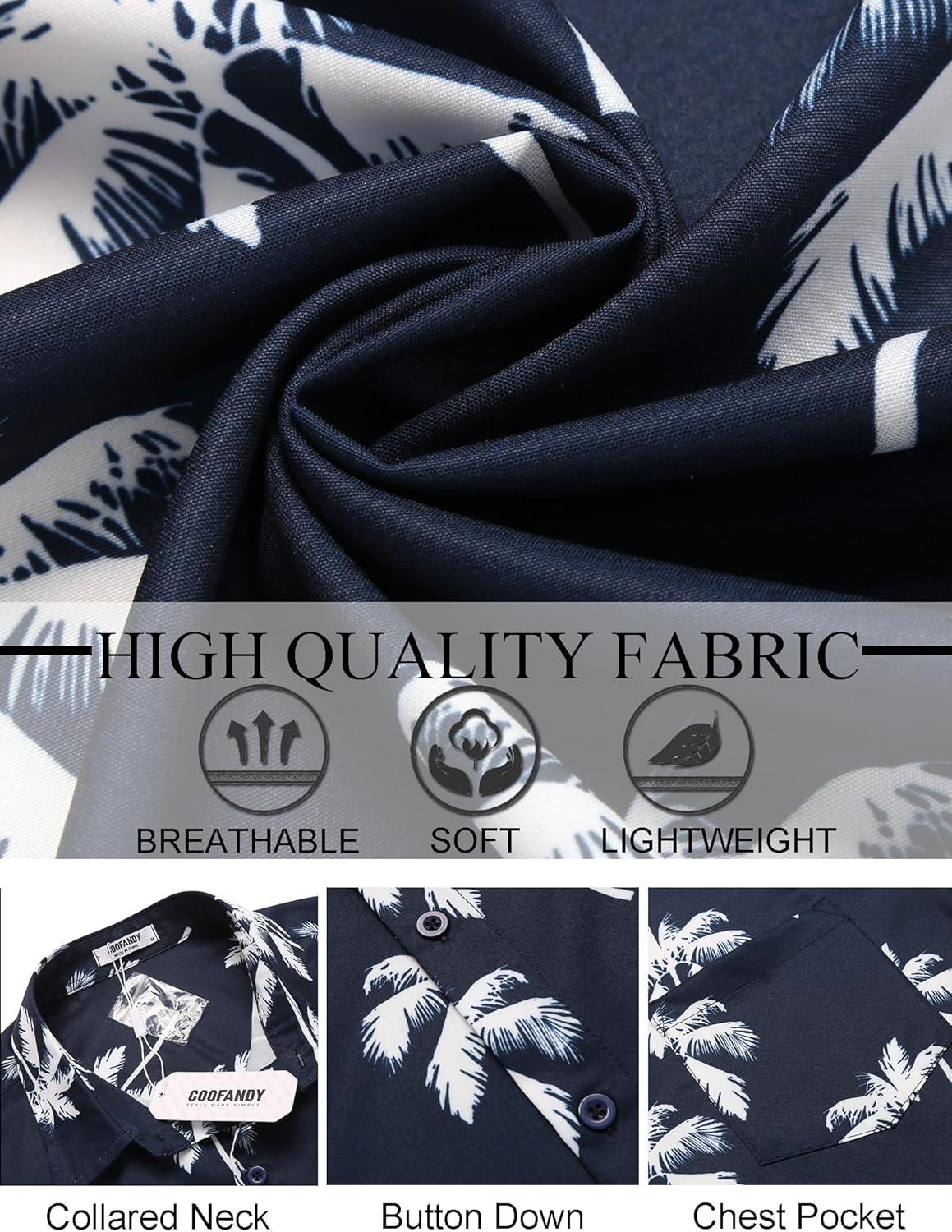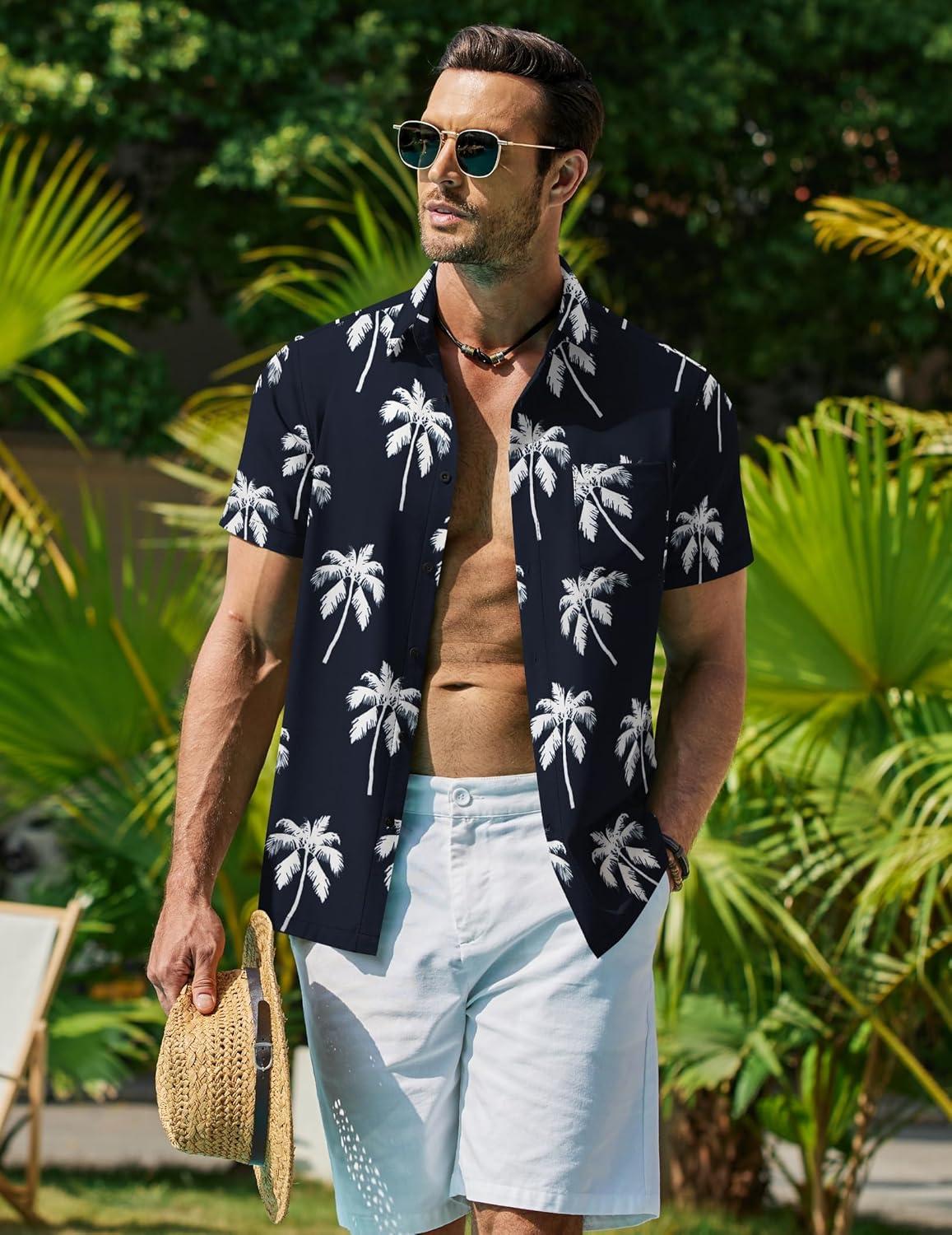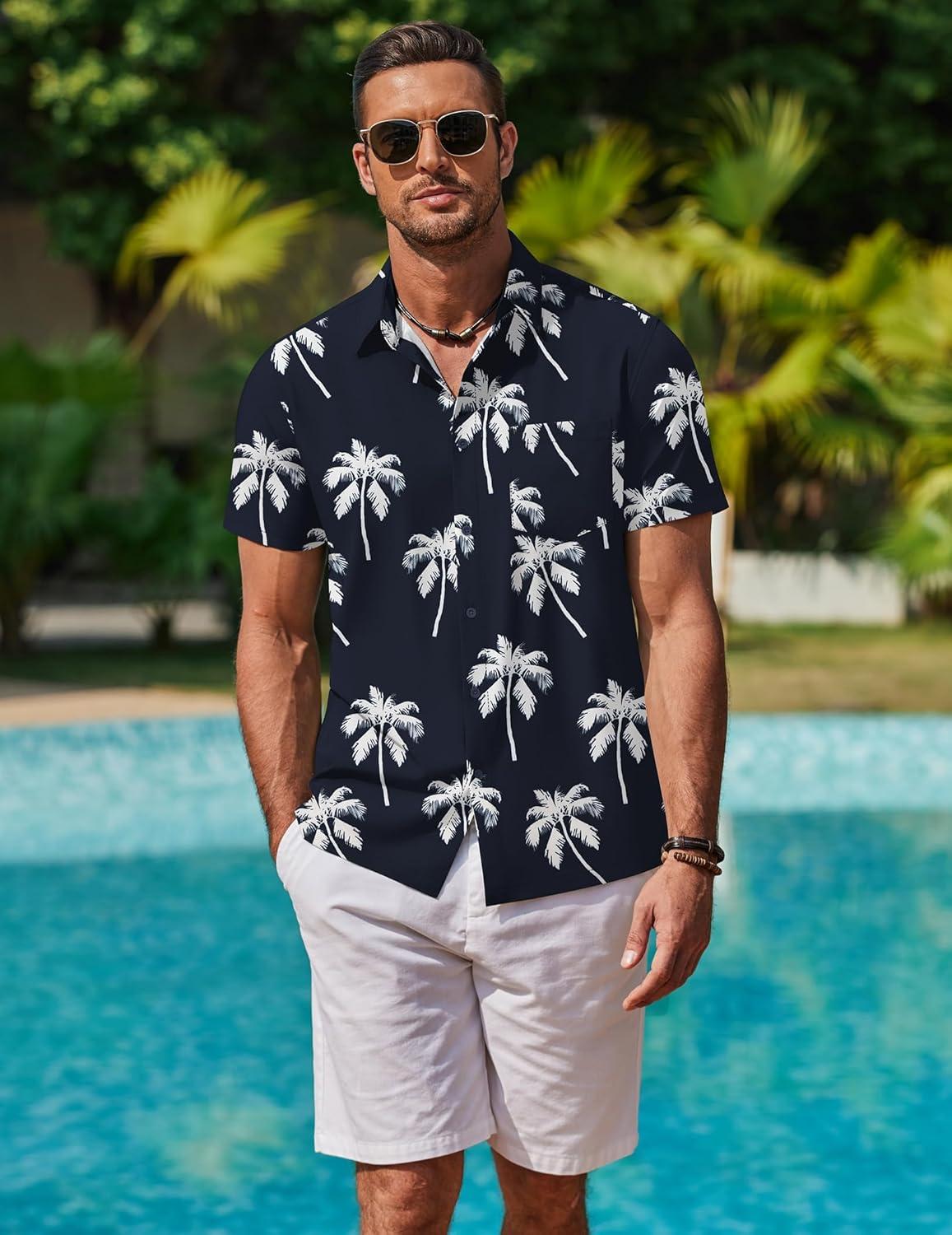 COOFANDY Mens Hawaiian Shirt Short Sleeve Button Down Shirt Tropical Summer Beach Shirt(Coconut Tree-dark Blue)