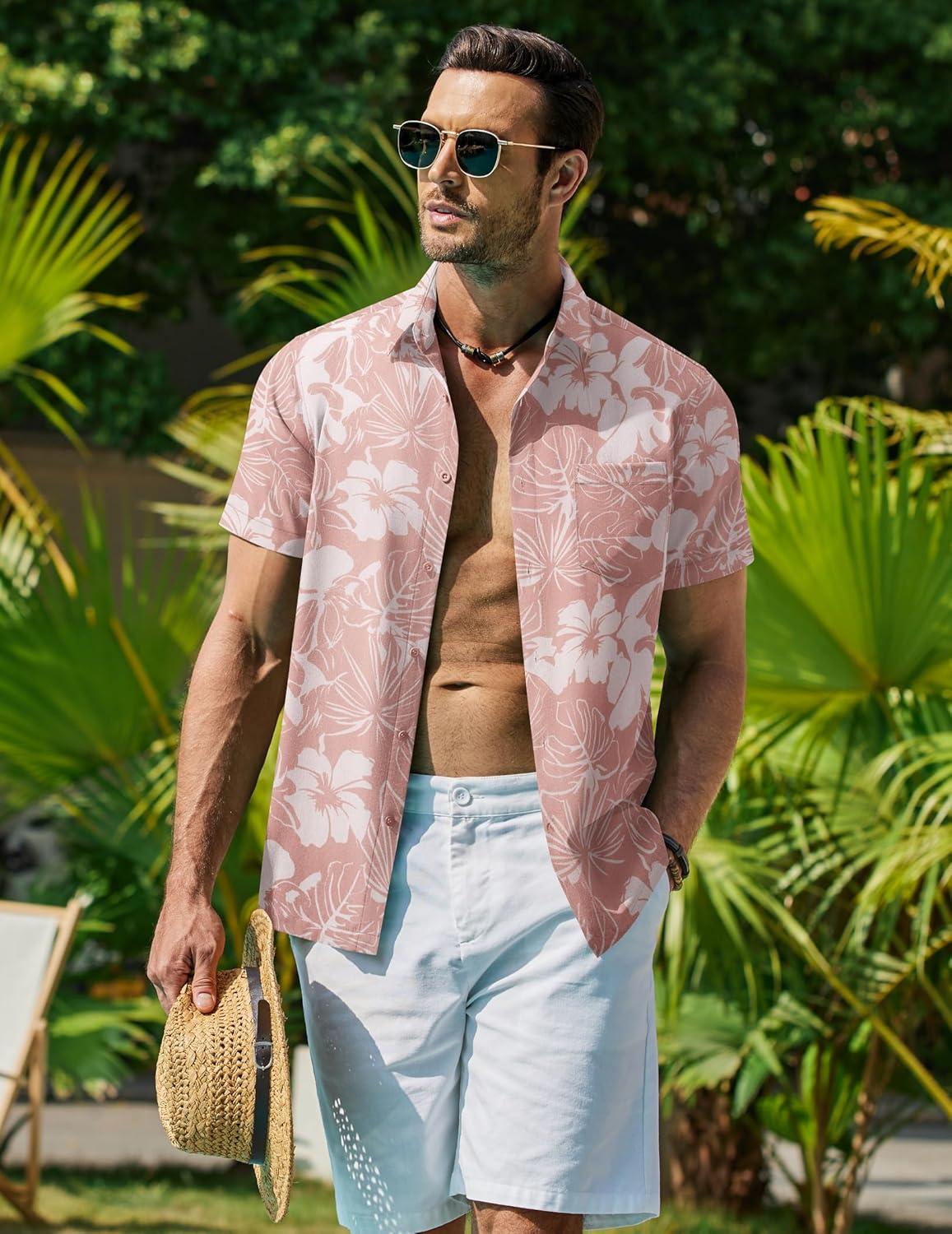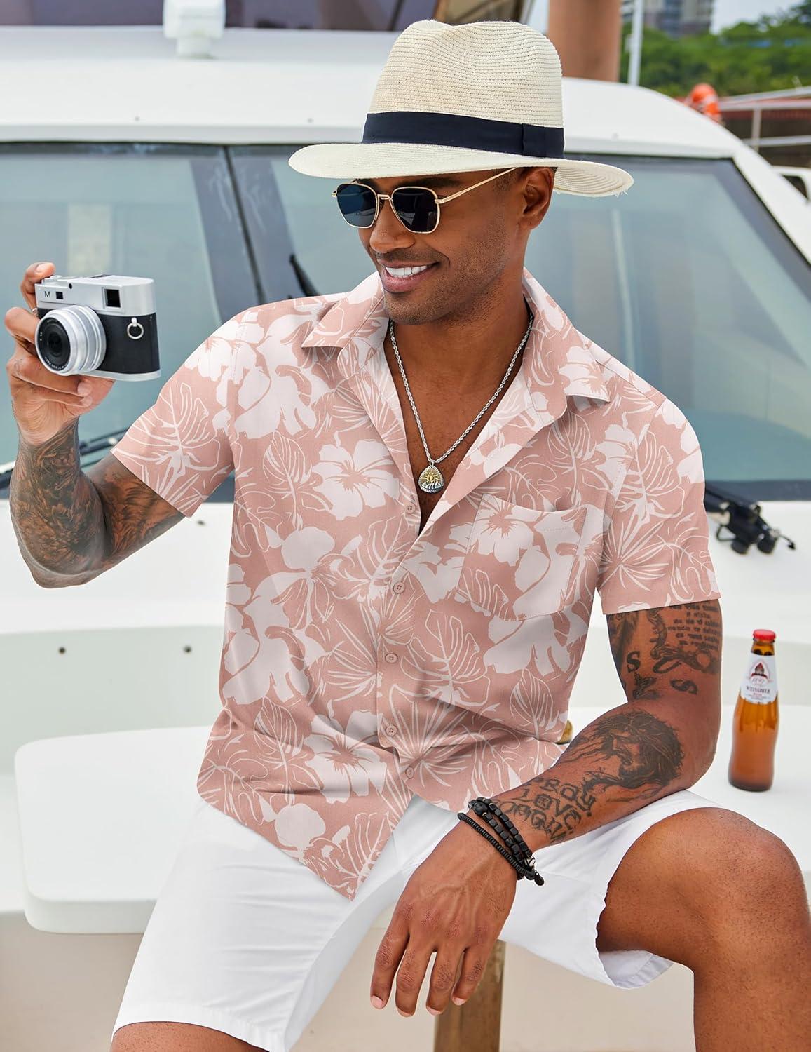 COOFANDY Mens Hawaiian Shirt Short Sleeve Button Down Shirt Tropical Summer Beach Shirt(Flower-hibiscus)