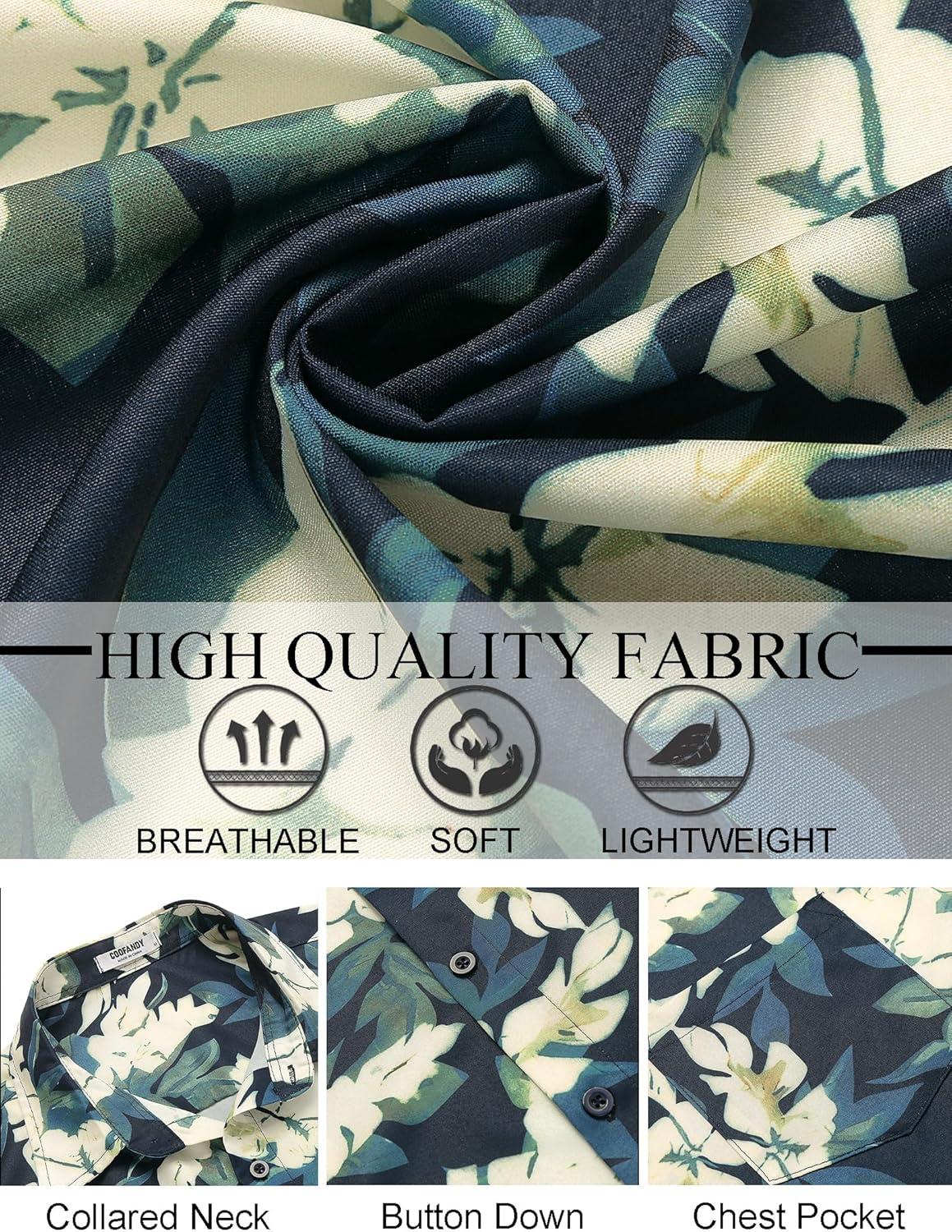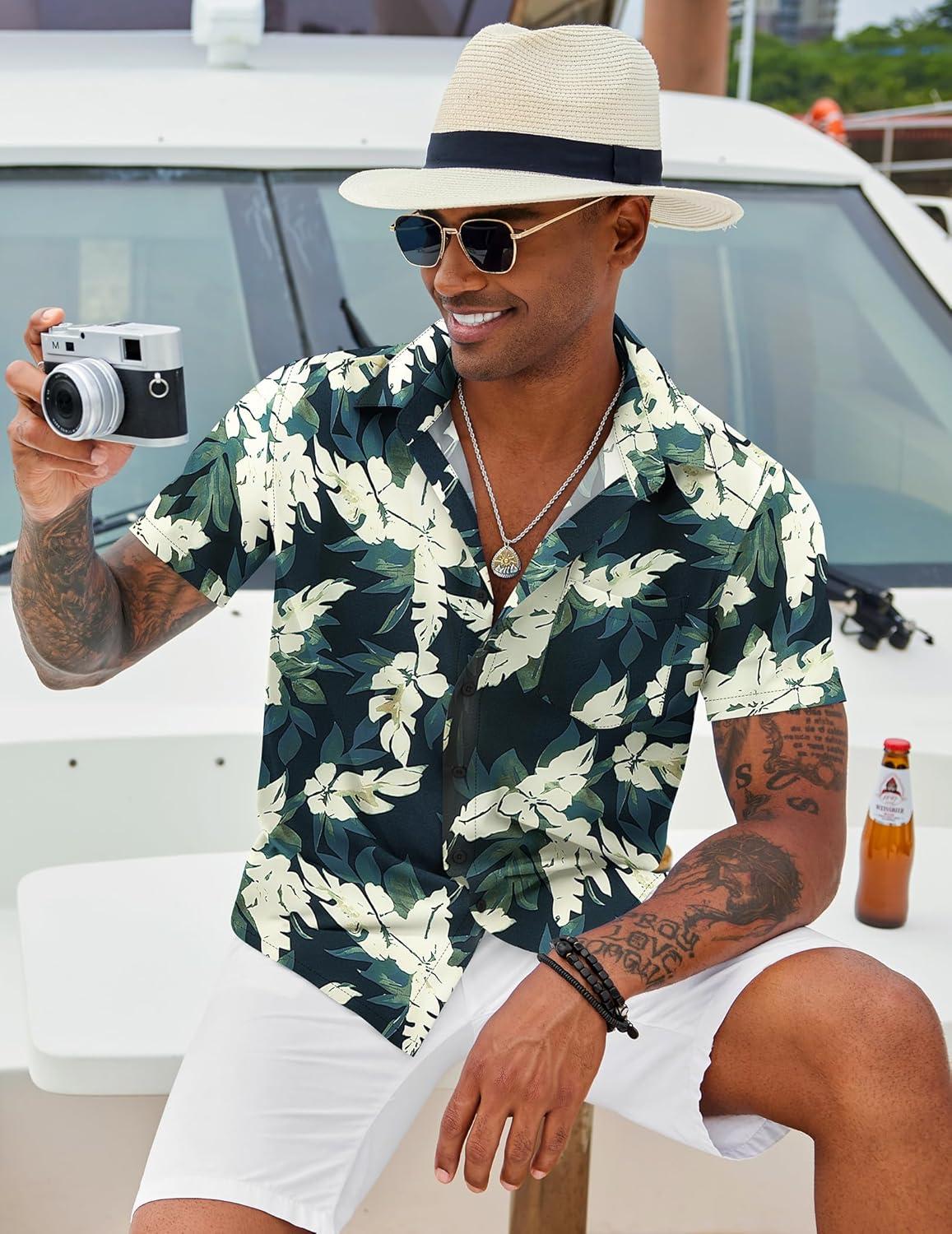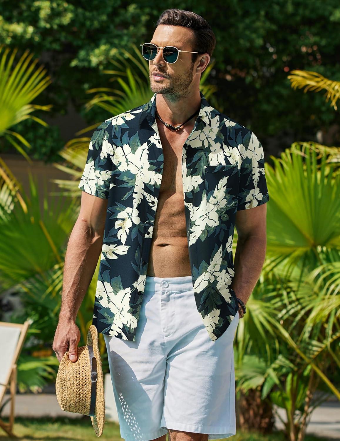 COOFANDY Mens Hawaiian Shirt Short Sleeve Button Down Shirt Tropical Summer Beach Shirt(Leaf-green & White)