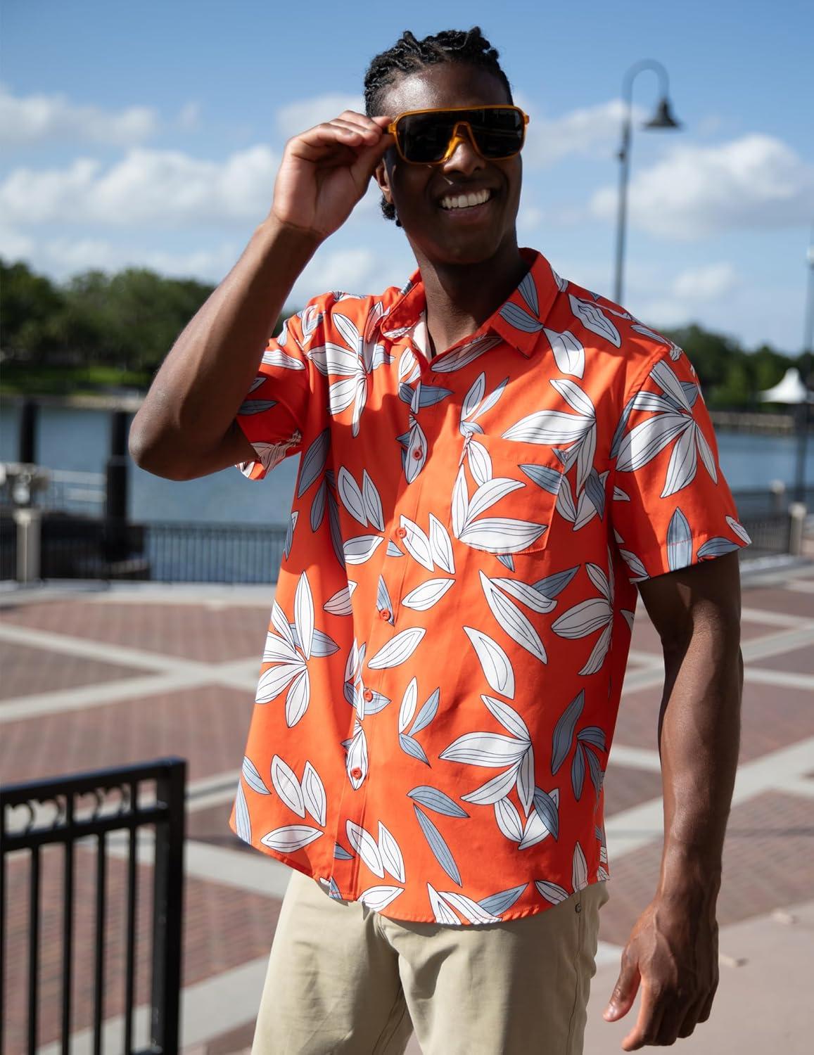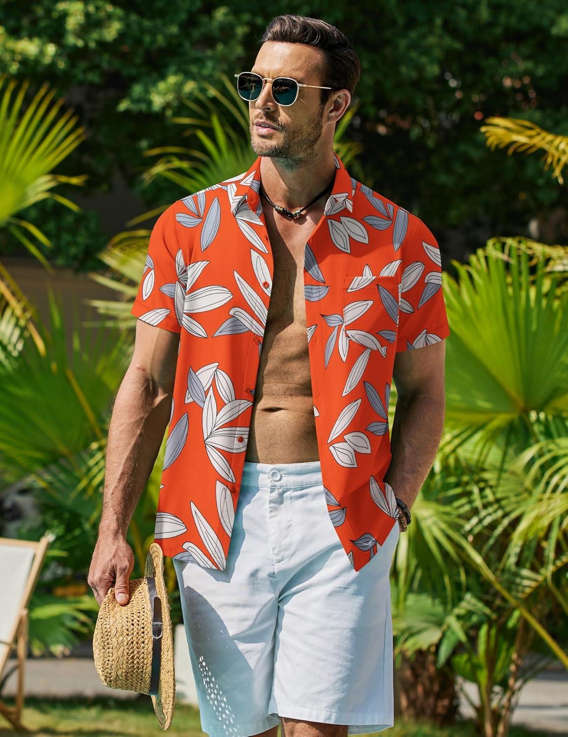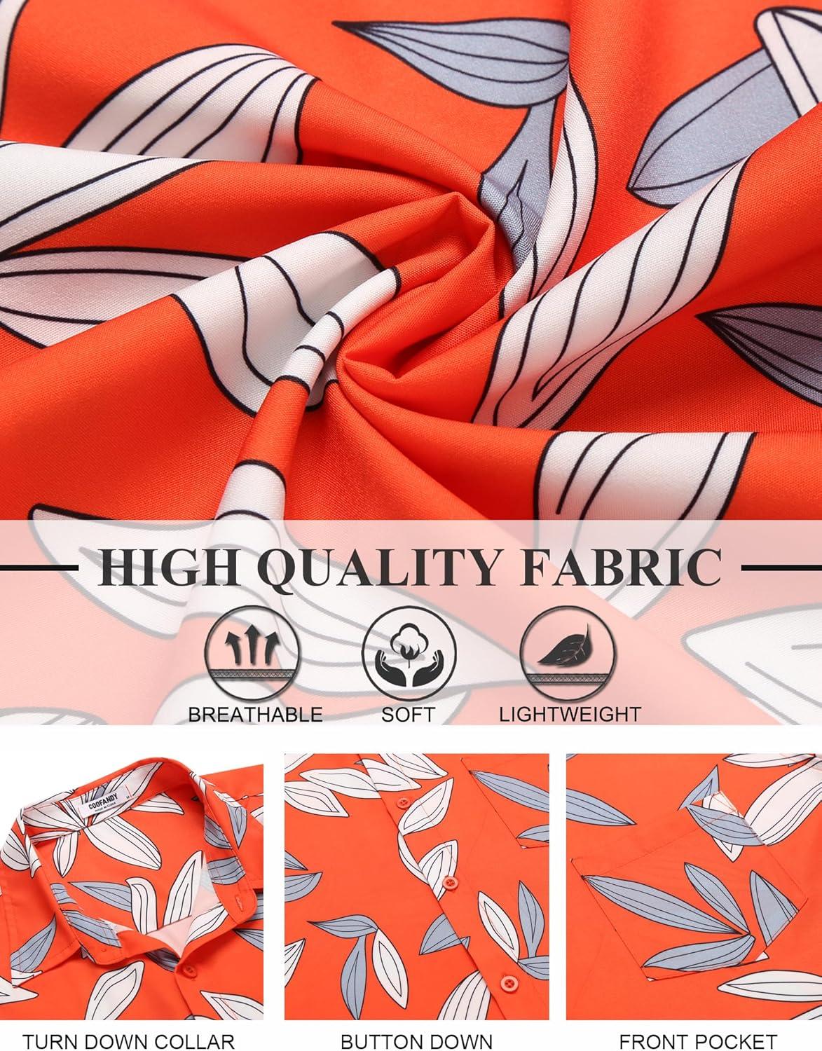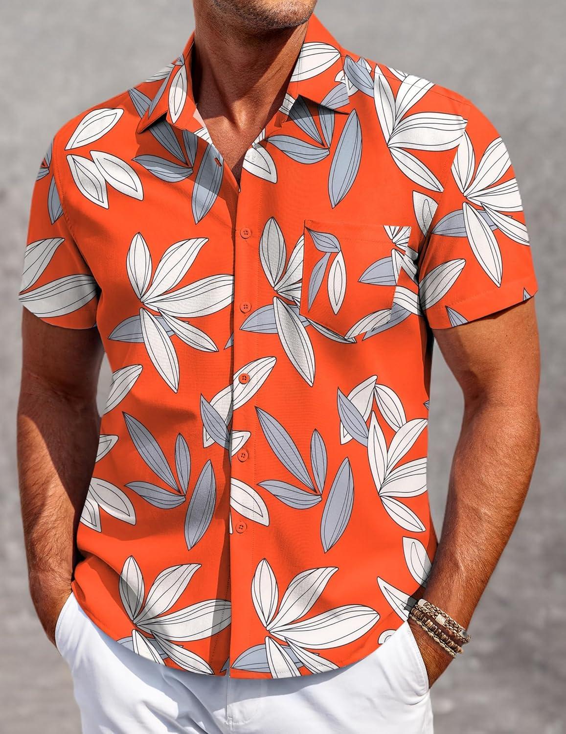 COOFANDY Mens Hawaiian Shirt Short Sleeve Button Down Shirt Tropical Summer Beach Shirt(Leaf-orange)