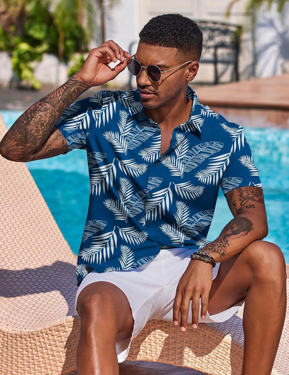 COOFANDY Mens Hawaiian Shirt Short Sleeve Button Down Shirts Tropical Floral Summer Beach Shirts(Blue – Palm Leaf)