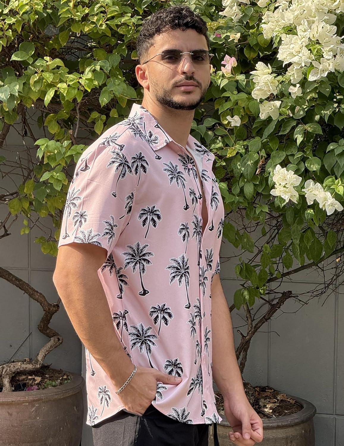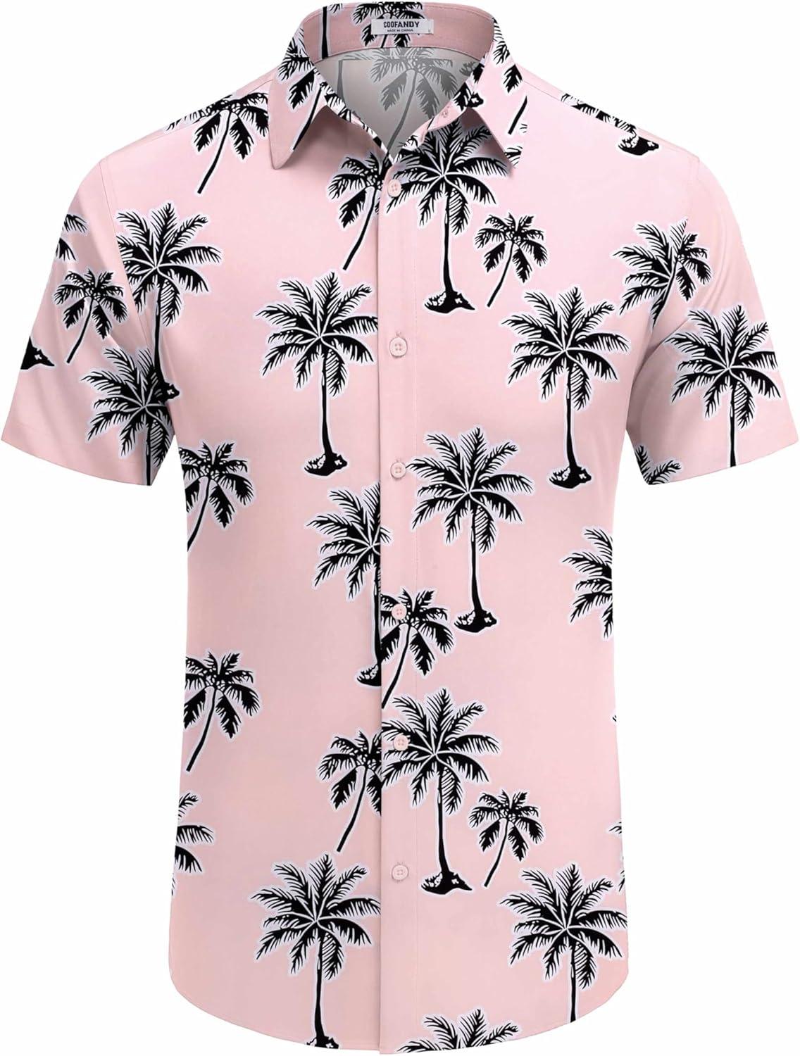 COOFANDY Mens Hawaiian Shirt Short Sleeve Button Down Shirts Tropical Floral Summer Beach Shirts(Pink – Coconut Tree)