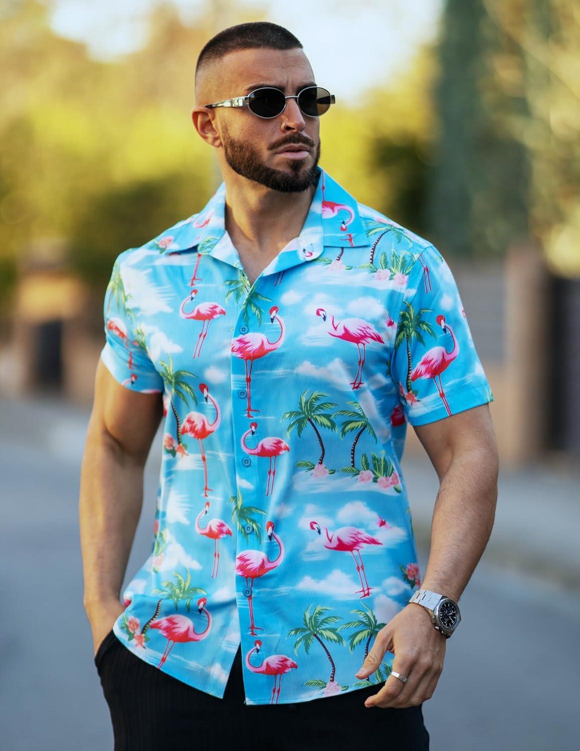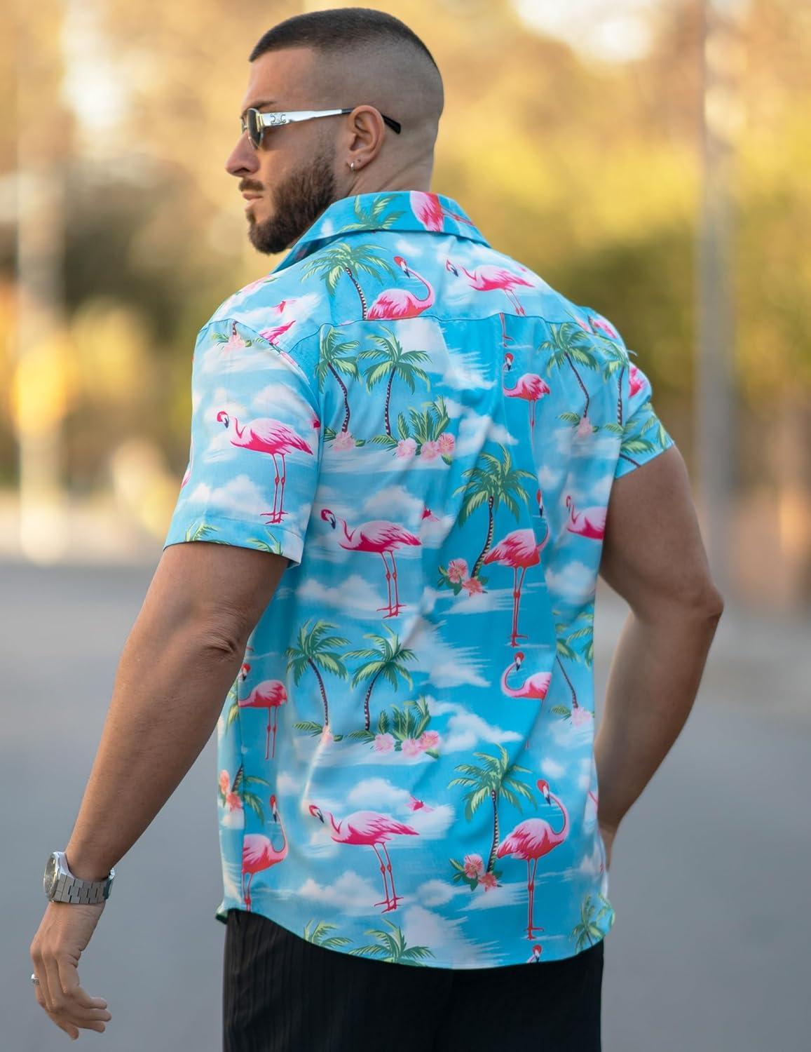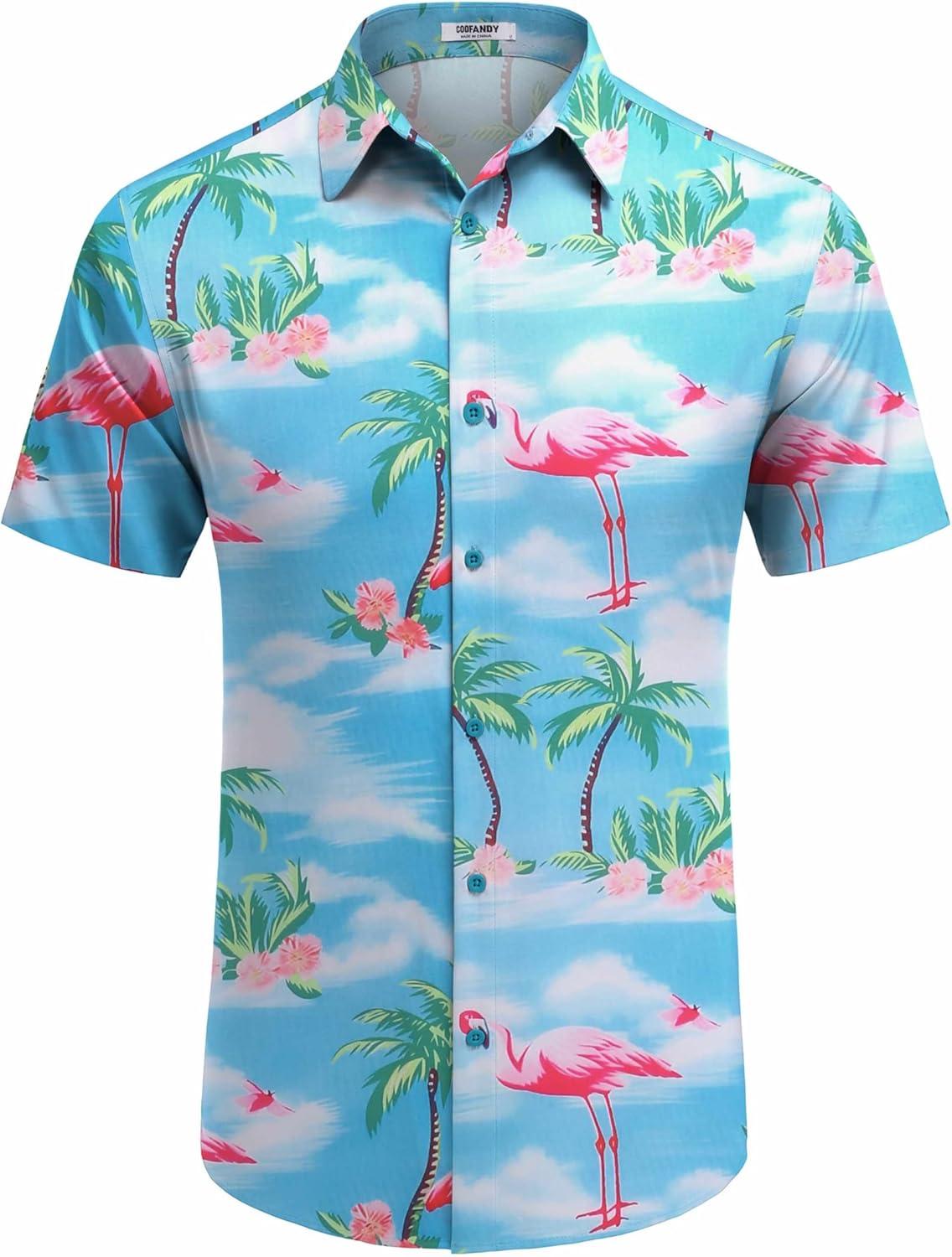 COOFANDY Mens Hawaiian Shirt Short Sleeve Button Down Shirts Tropical Floral Summer Beach Shirts(Sky Blue – Flamingo)