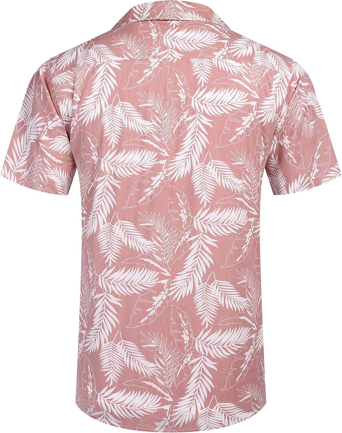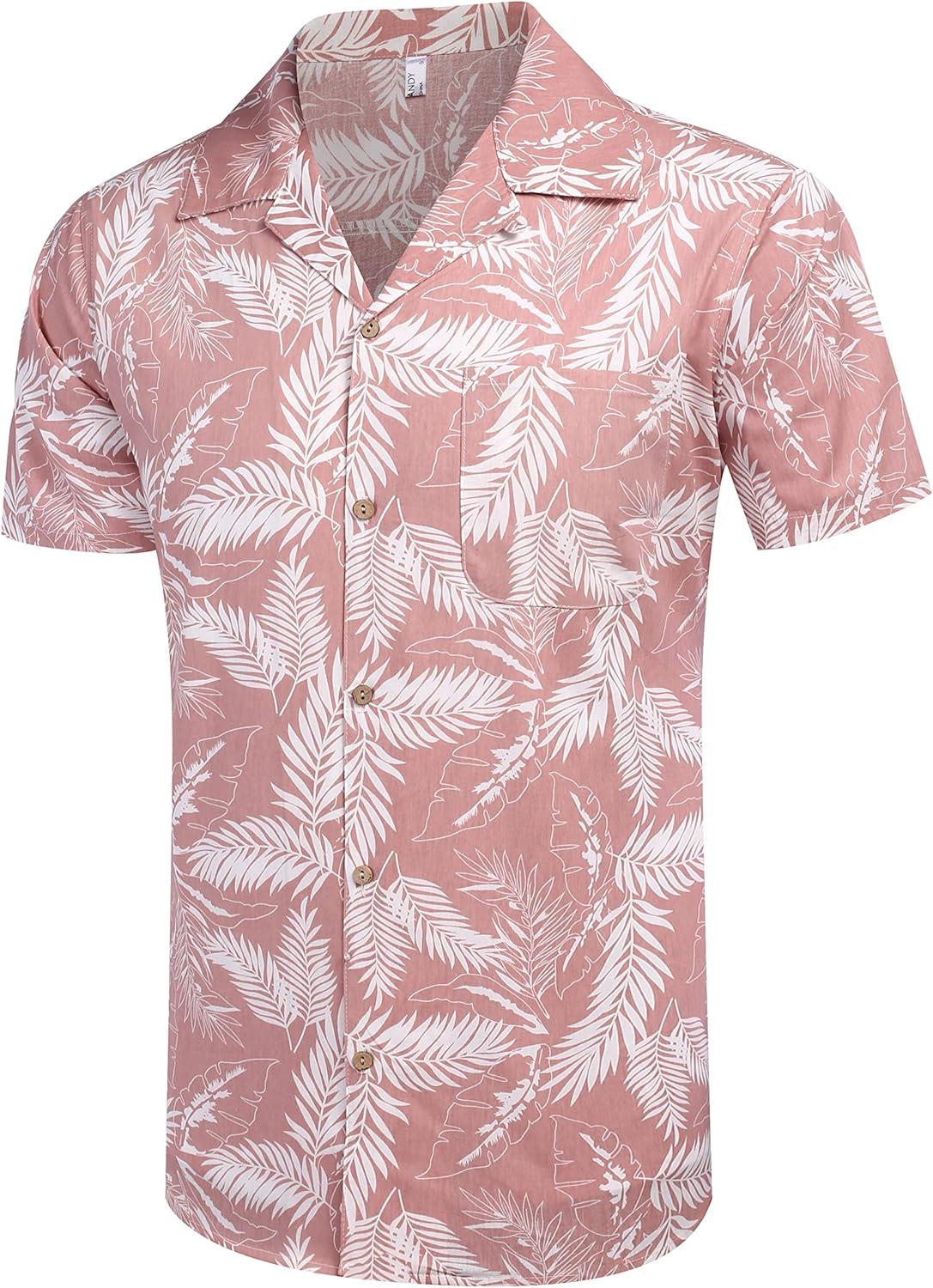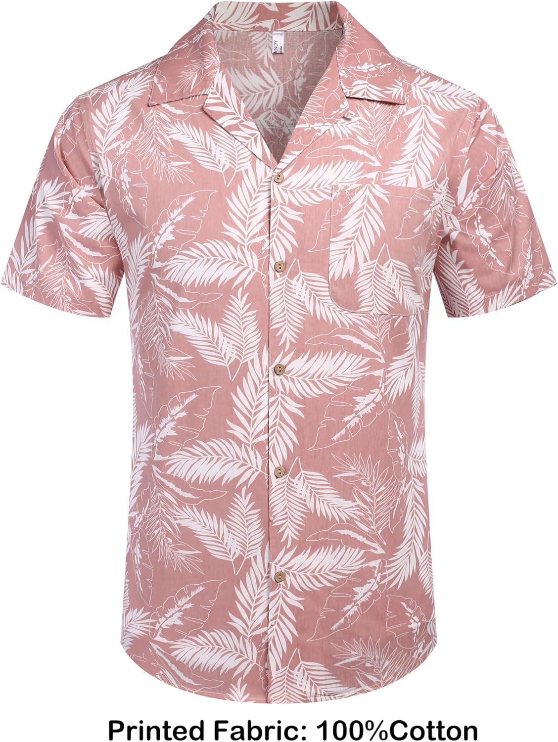 COOFANDY Mens Hawaiian Shirt Short Sleeve Buttoon Down Shirts Casual Tropical Floral Summer Linen Shirts(Palm Leaf-pink)