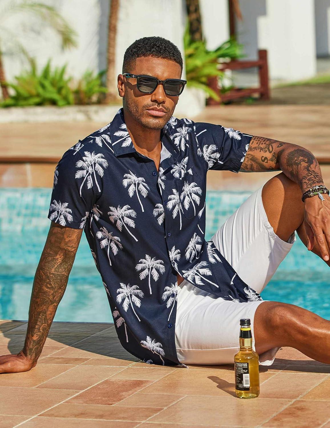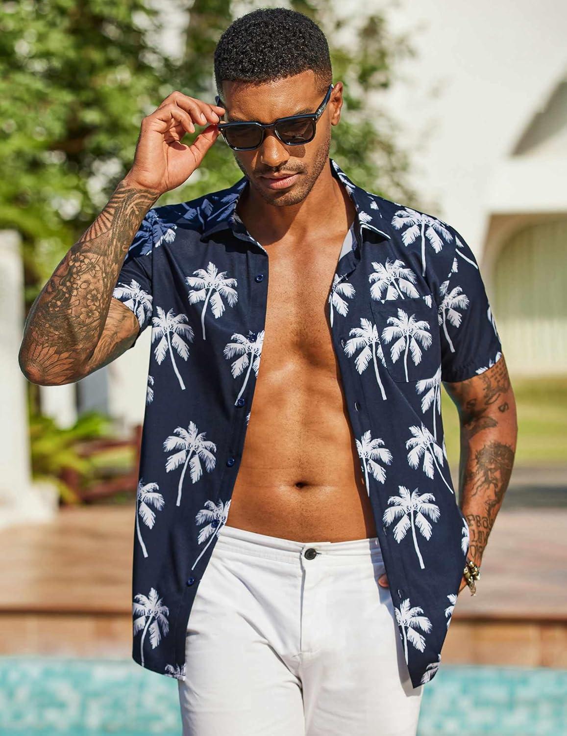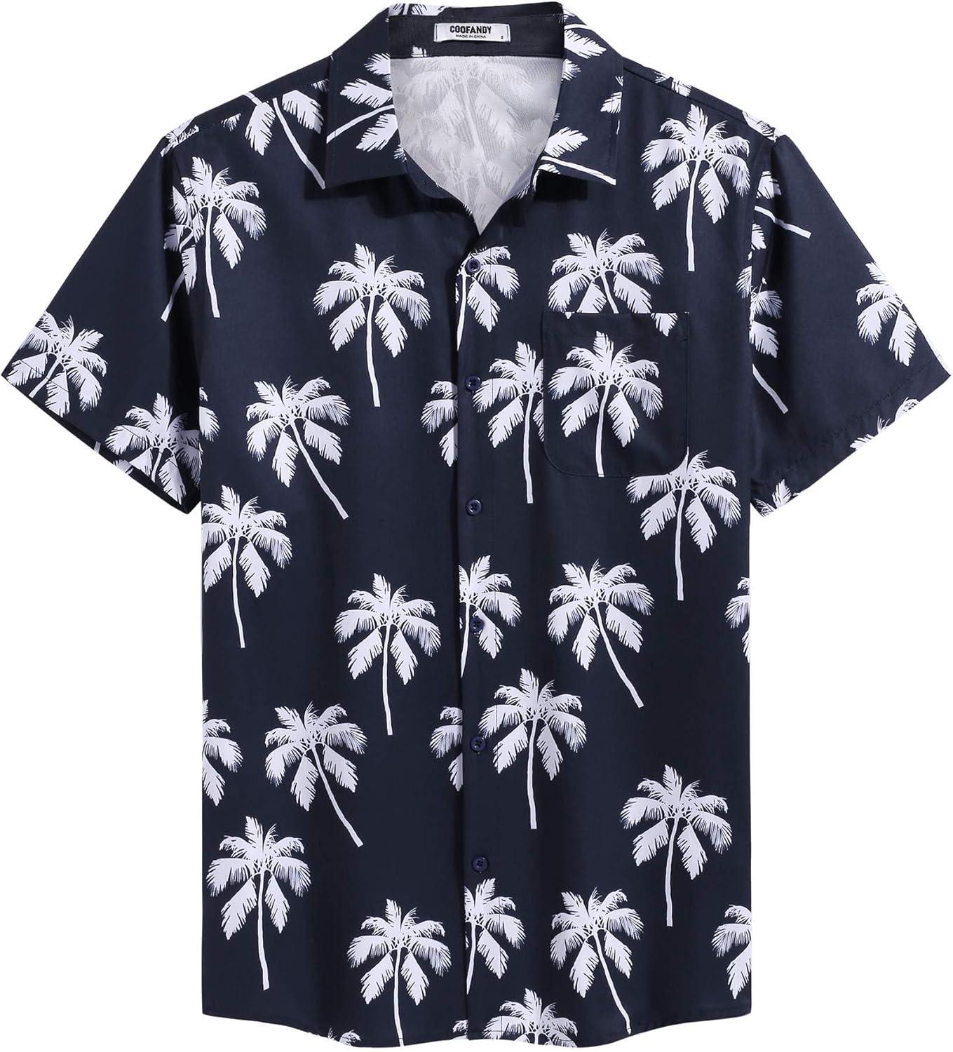 COOFANDY Men’s Hawaiian Shirt Short Sleeve Casual Button Down Tropical Summer Beach Aloha Shirts(Navy-coconut Tree)