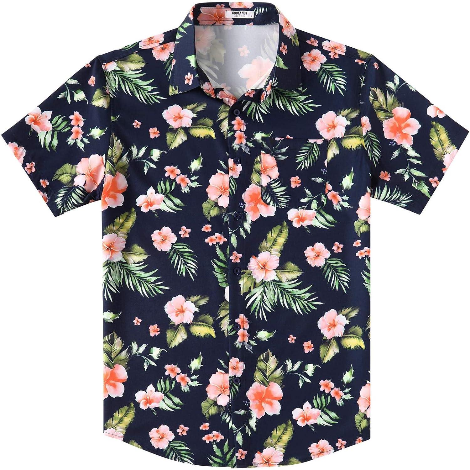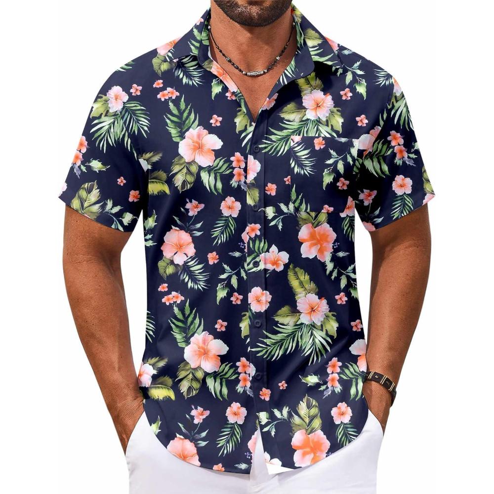 COOFANDY Men's Hawaiian Shirt Short Sleeve Casual Button Down Tropical Summer Beach Aloha Shirts(Navy-pink Flowers)