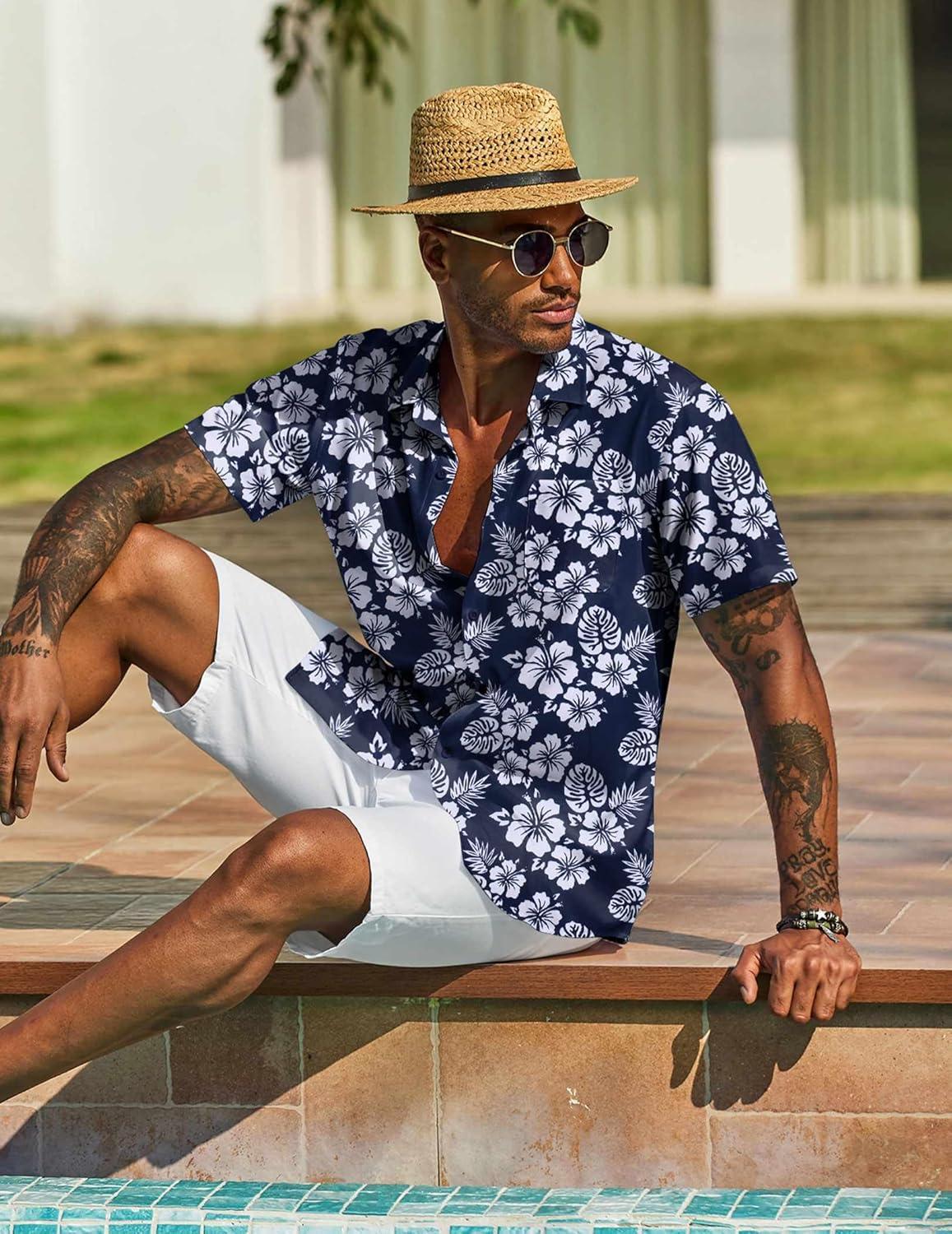 COOFANDY Men's Hawaiian Shirt Short Sleeve Casual Button Down Tropical Summer Beach Aloha Shirts(Navy-white Flowers)