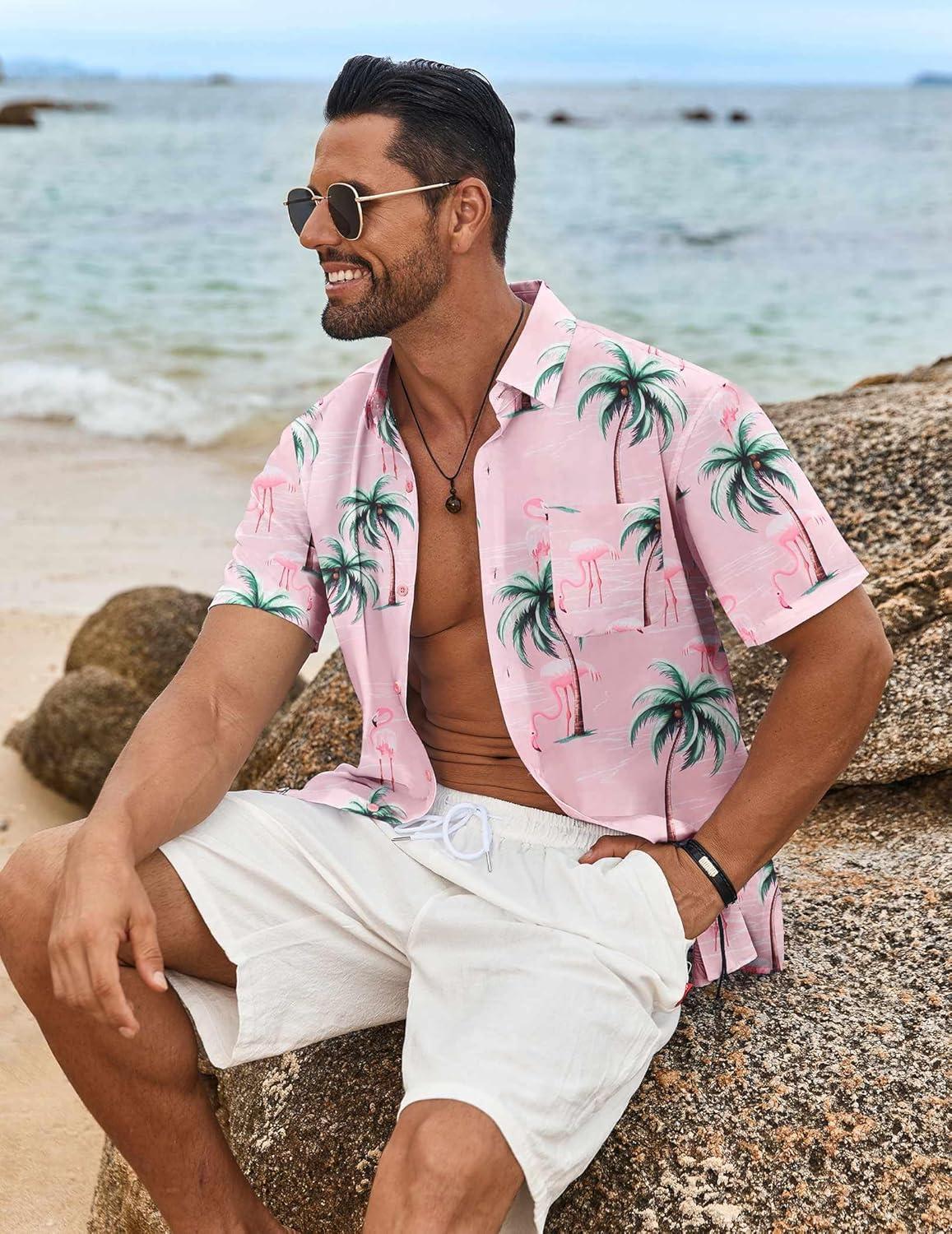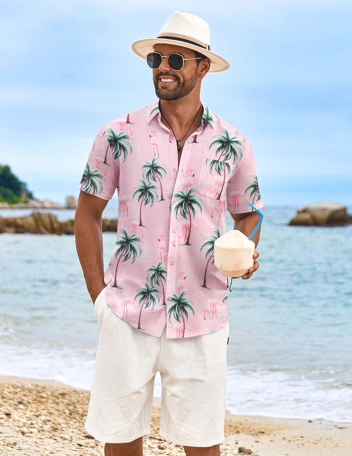 COOFANDY Men’s Hawaiian Shirt Short Sleeve Casual Button Down Tropical Summer Beach Aloha Shirts(Pink-coconut Trees)