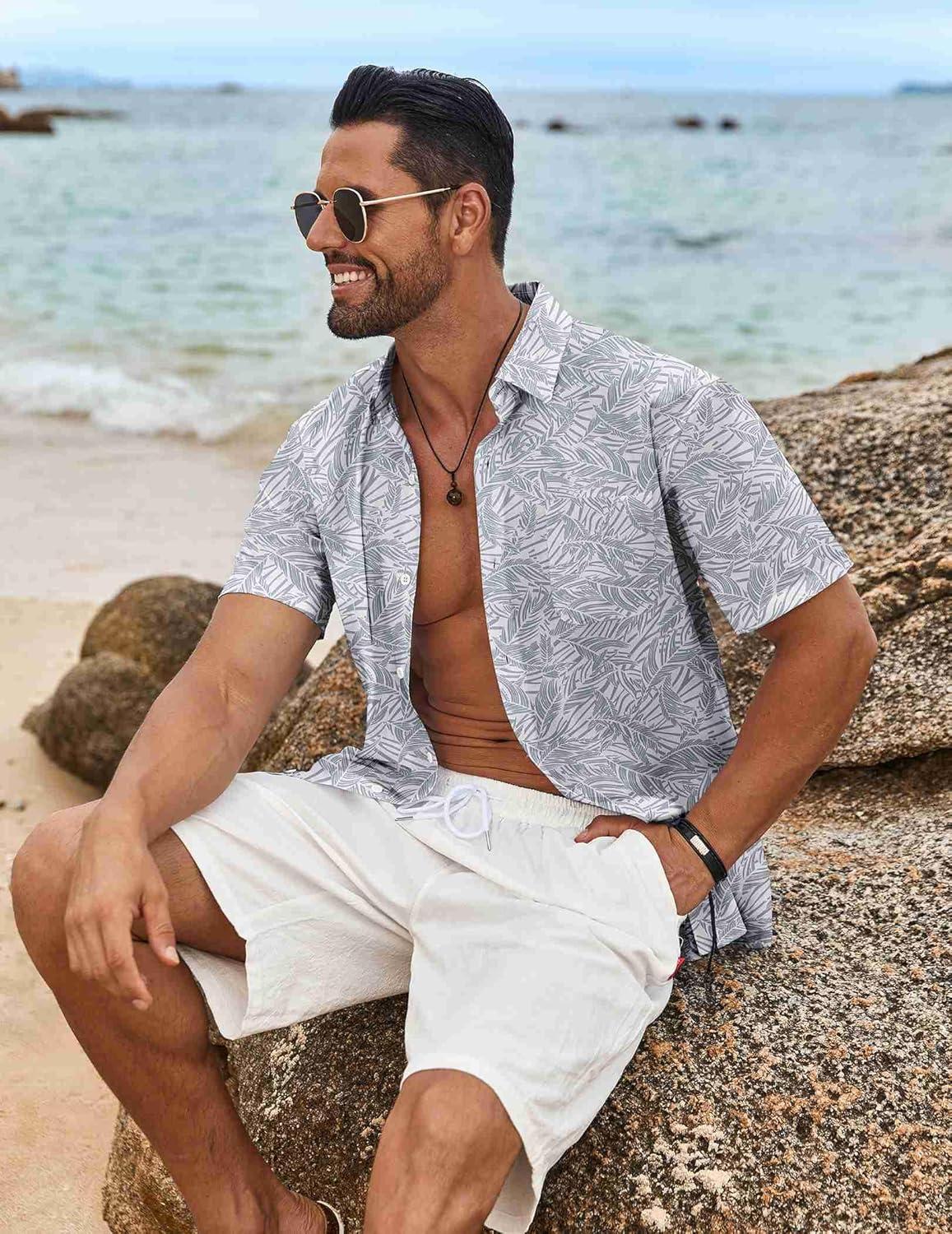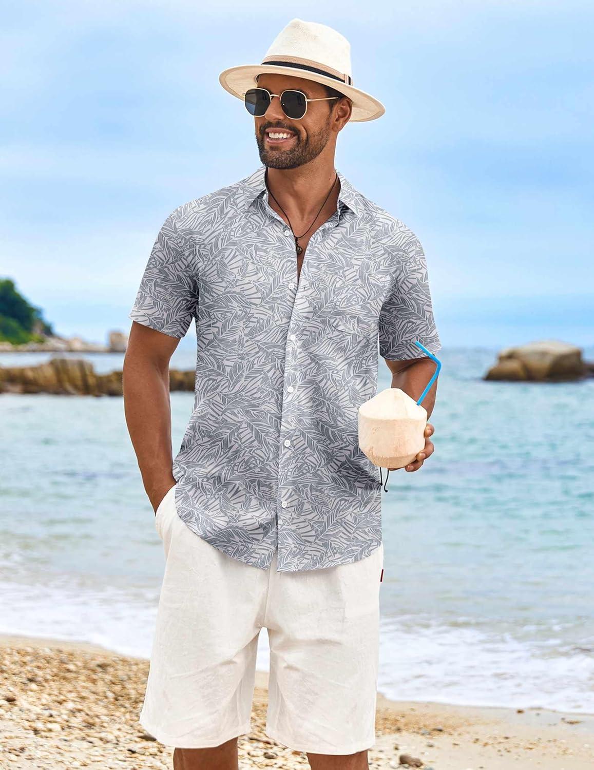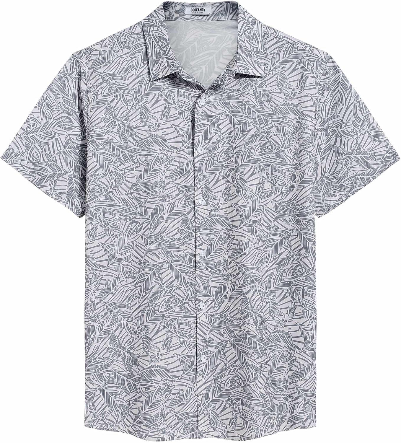 COOFANDY Men’s Hawaiian Shirt Short Sleeve Casual Button Down Tropical Summer Beach Aloha Shirts(White-grey Leaves)