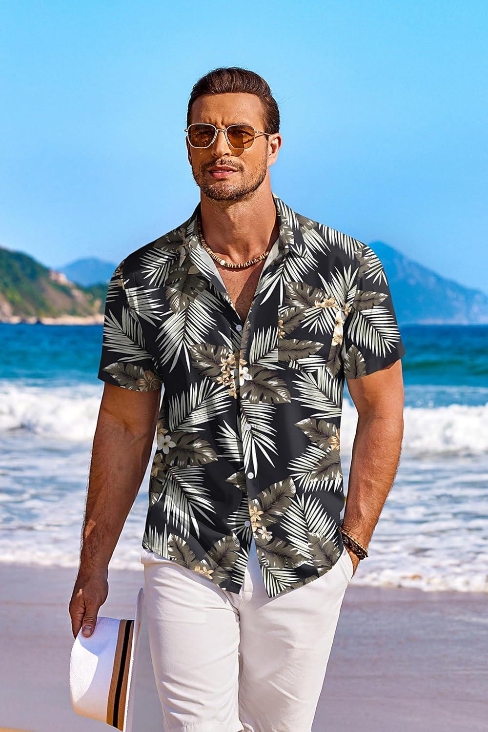 COOFANDY Men’s Hawaiian Shirt Short Sleeve Floral Button Down Shirts Tropical Holiday Beach Shirts(Black / Plam Leaf)