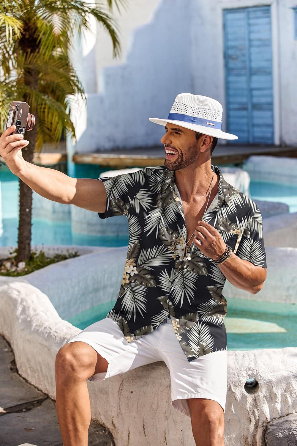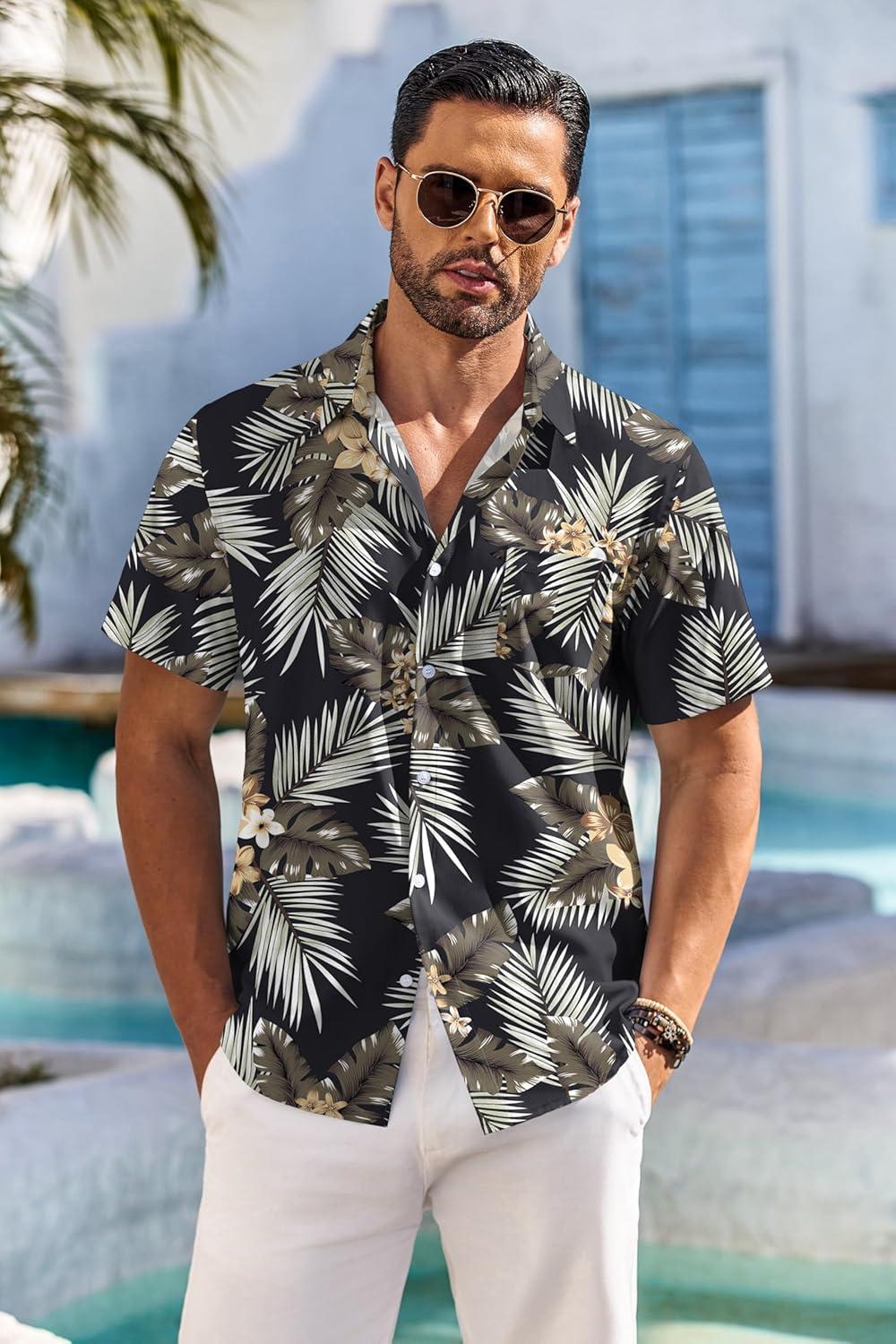 COOFANDY Men's Hawaiian Shirt Short Sleeve Floral Button Down Shirts Tropical Holiday Beach Shirts(Black / Plam Leaf)