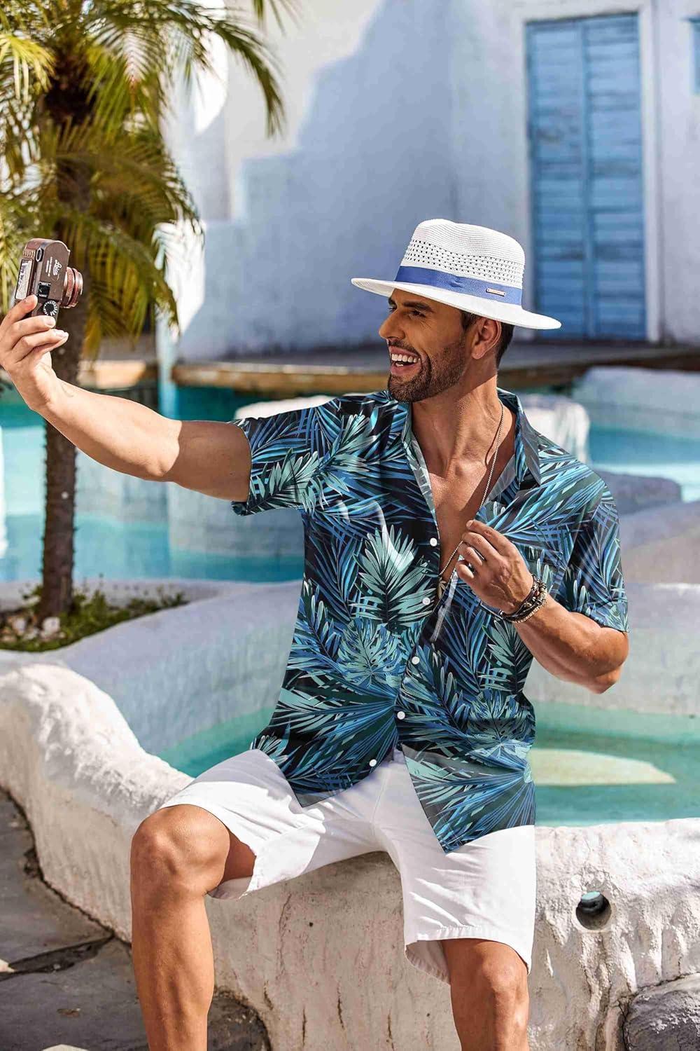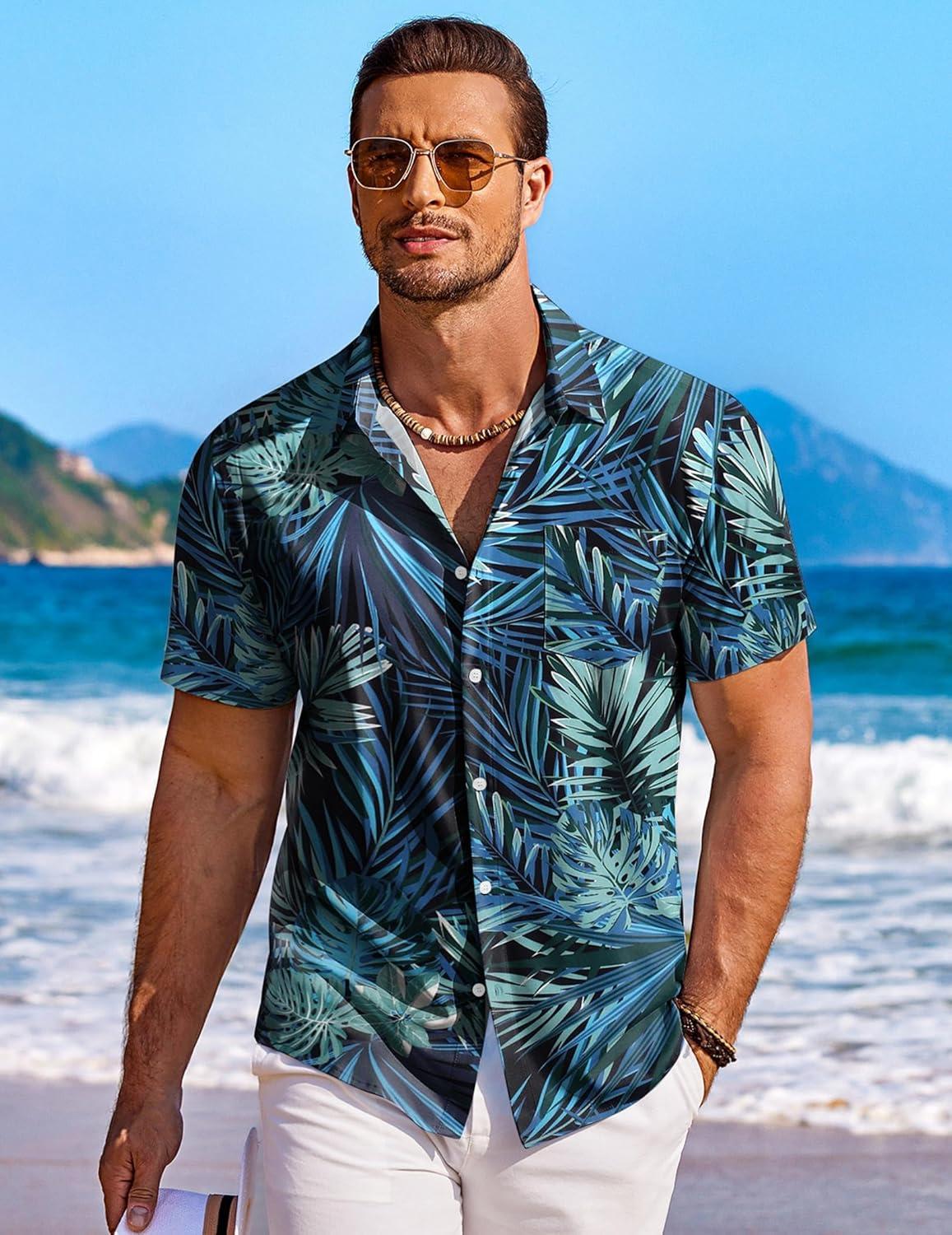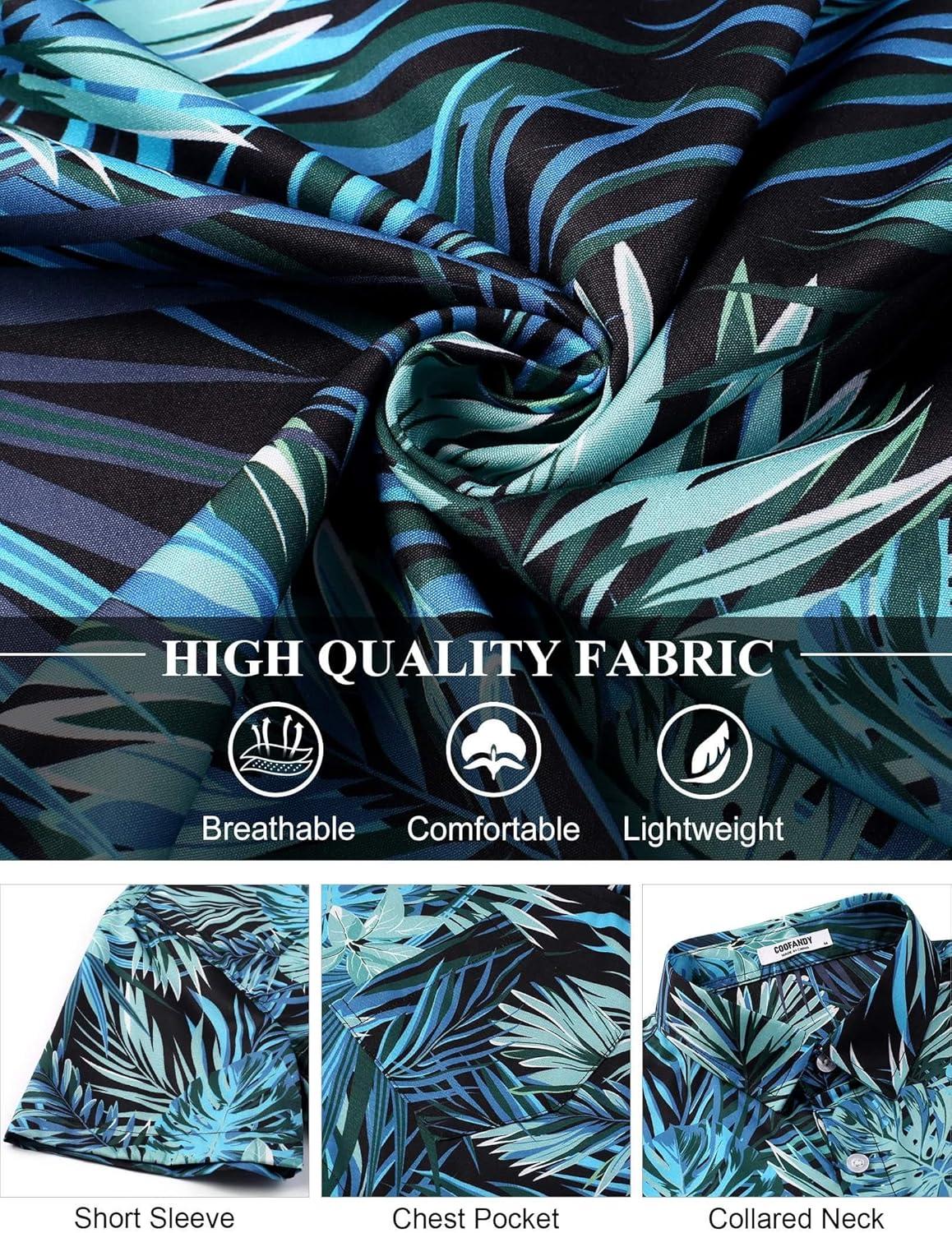 COOFANDY Men's Hawaiian Shirt Short Sleeve Floral Button Down Shirts Tropical Holiday Beach Shirts(Blue & Green - Leaf)