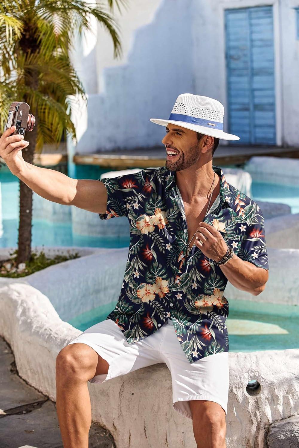 COOFANDY Men’s Hawaiian Shirt Short Sleeve Floral Button Down Shirts Tropical Holiday Beach Shirts(Navy & White – Flower 2)