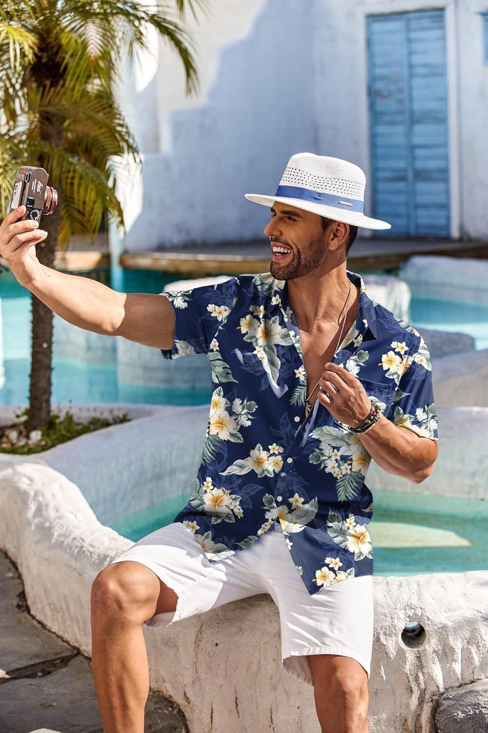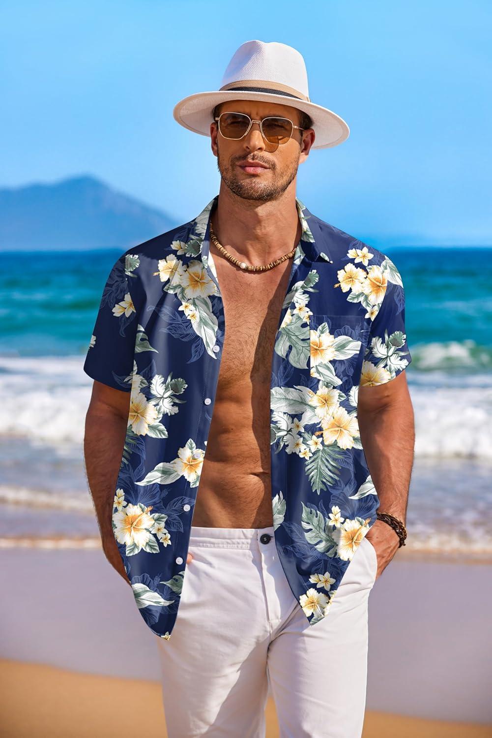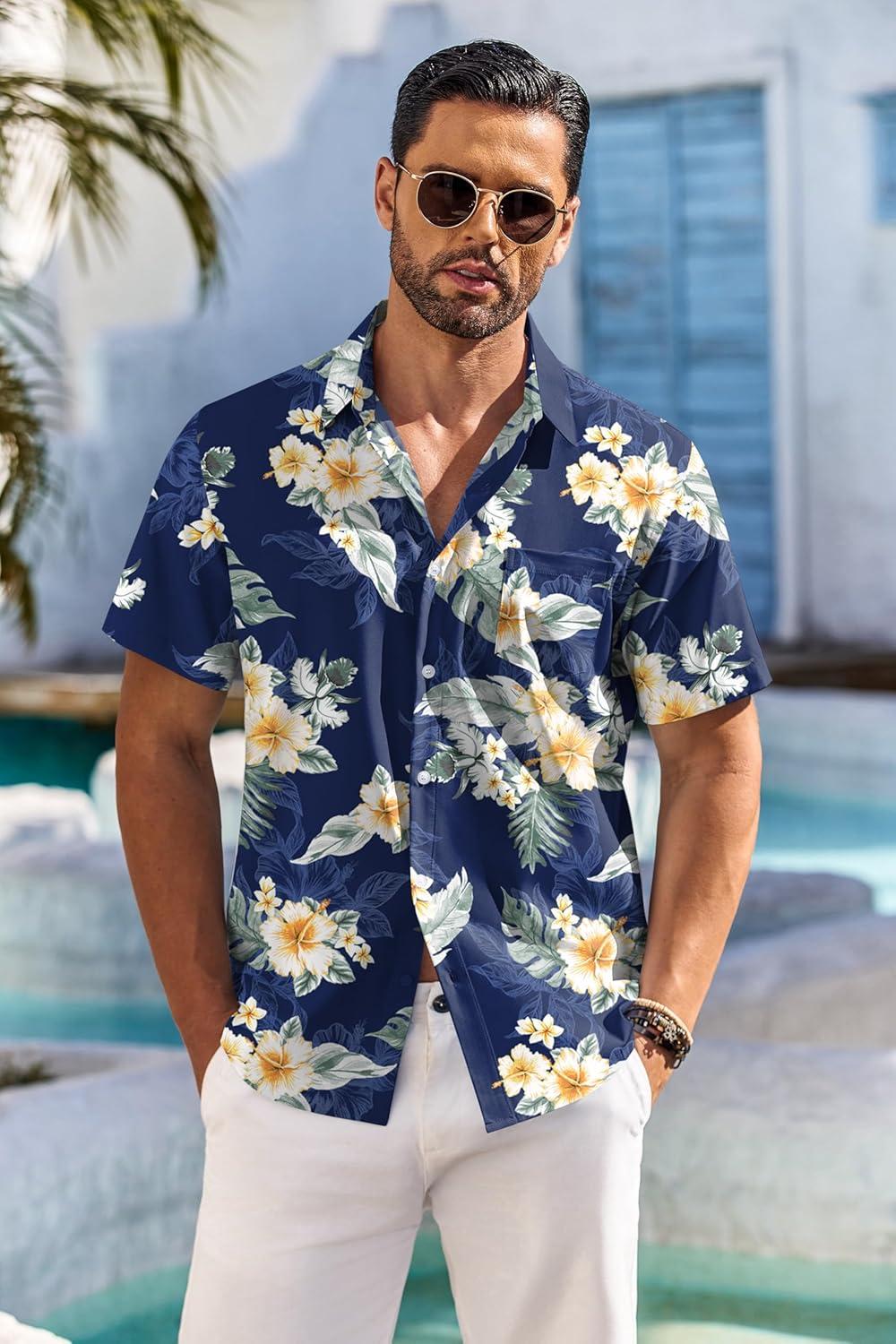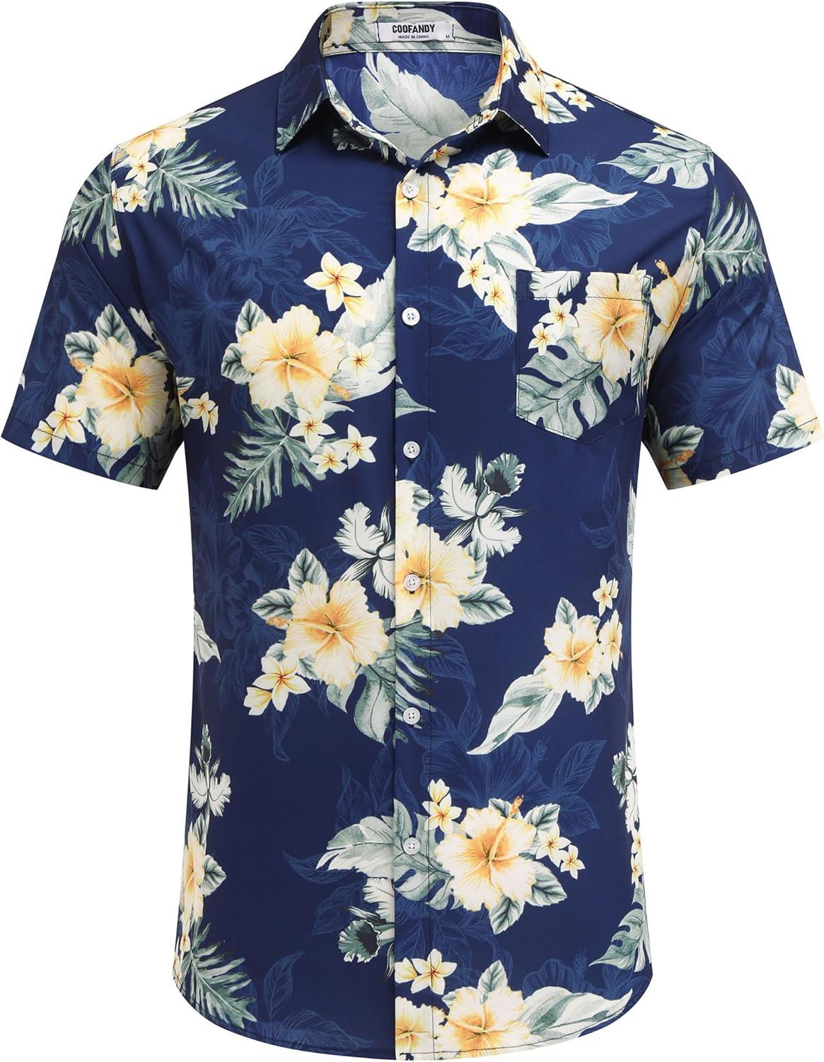 COOFANDY Men’s Hawaiian Shirt Short Sleeve Floral Button Down Shirts Tropical Holiday Beach Shirts(Navy – Flower 4)