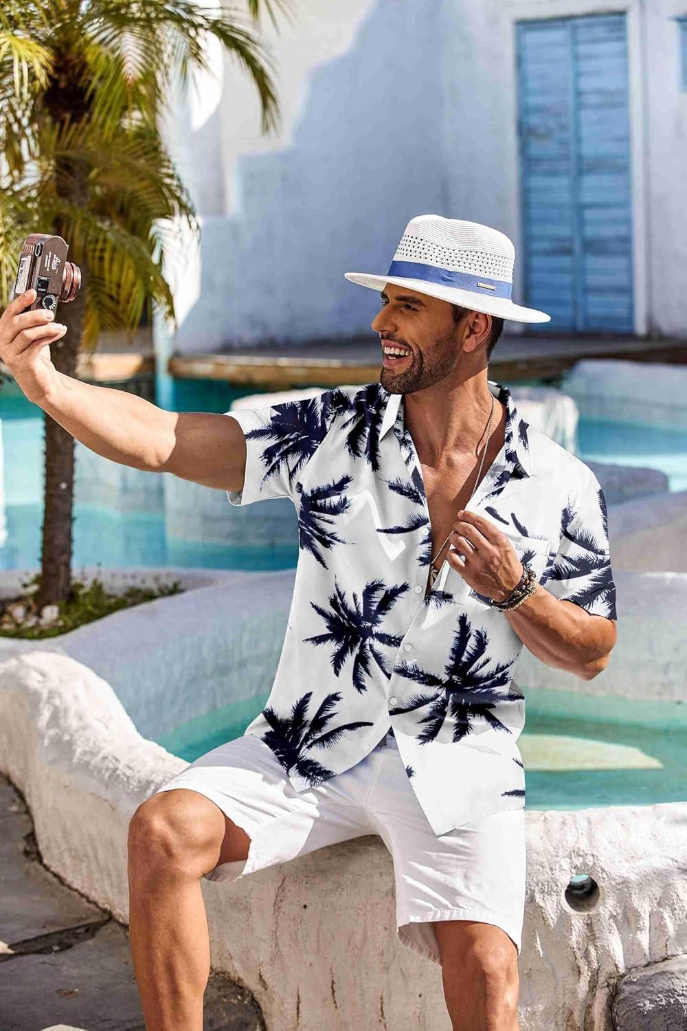 COOFANDY Men's Hawaiian Shirt Short Sleeve Floral Button Down Shirts Tropical Holiday Beach Shirts(Navy Palm Leaf Print)