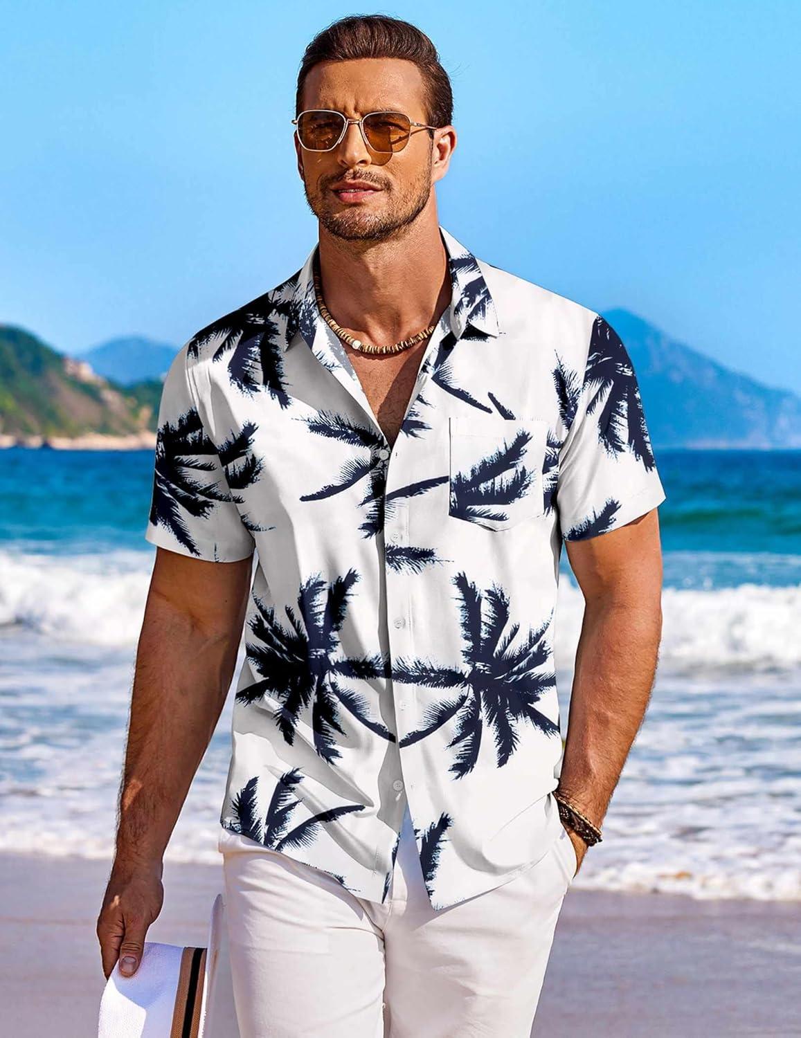COOFANDY Men’s Hawaiian Shirt Short Sleeve Floral Button Down Shirts Tropical Holiday Beach Shirts(Navy Palm Leaf Print)