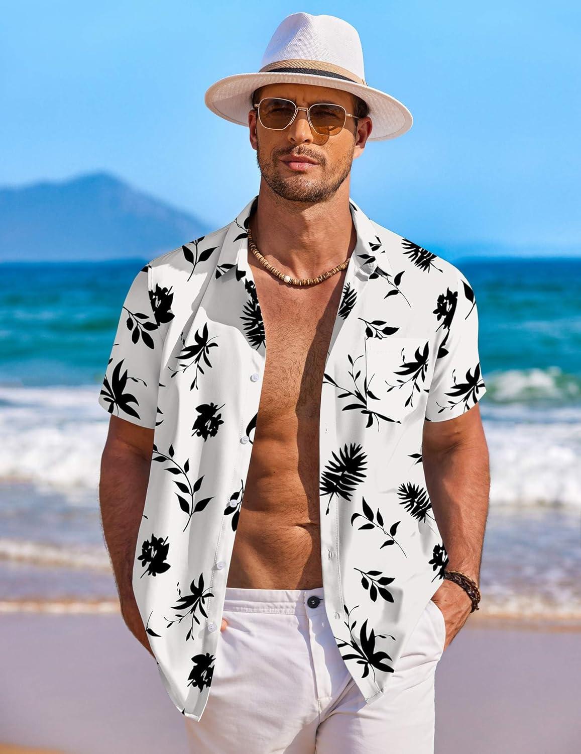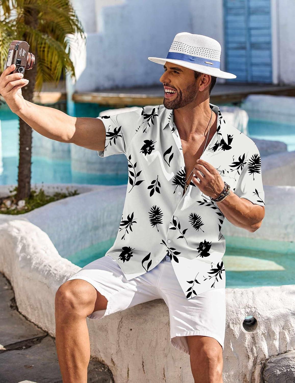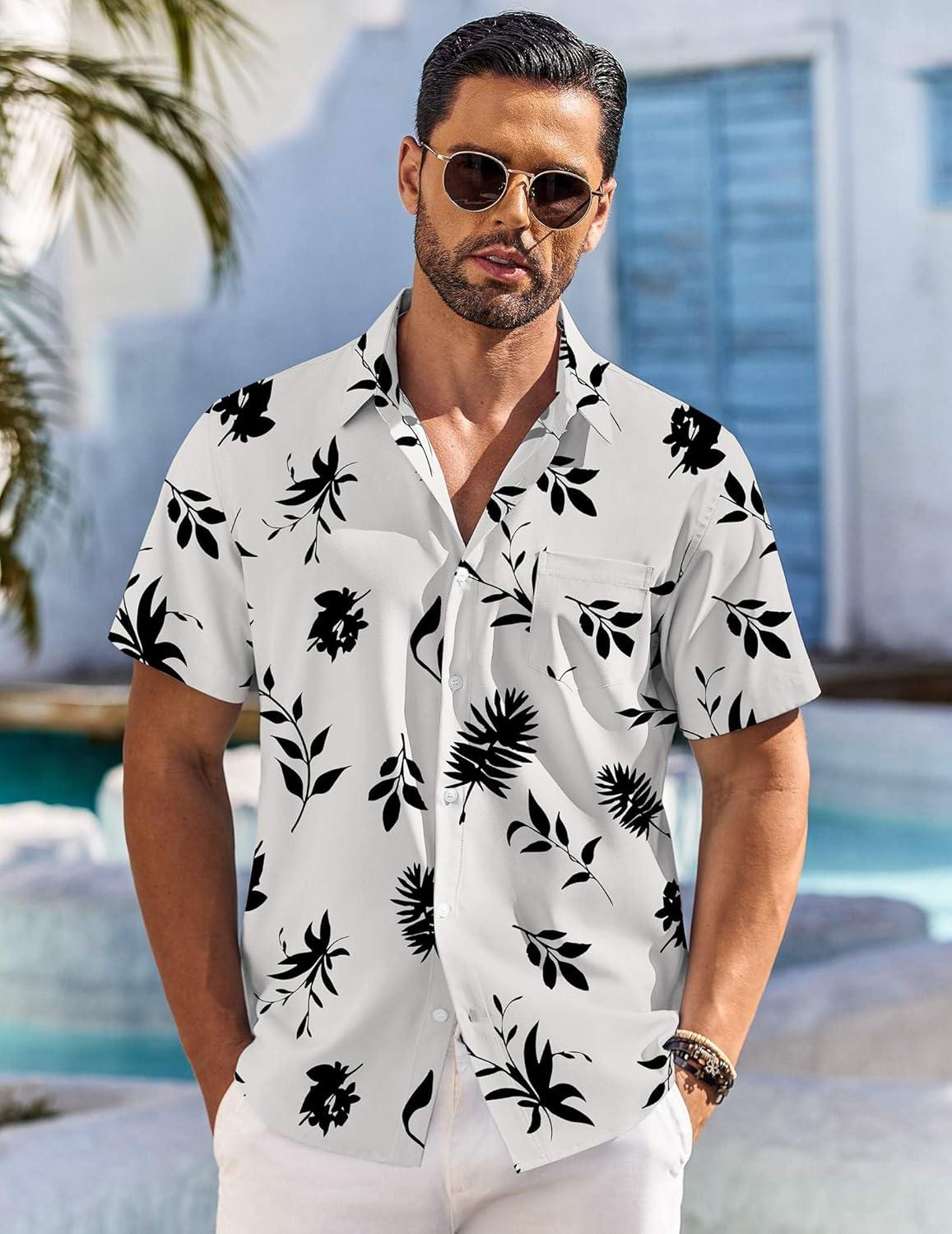 COOFANDY Men’s Hawaiian Shirt Short Sleeve Floral Button Down Shirts Tropical Holiday Beach Shirts(Off White – Leaf)