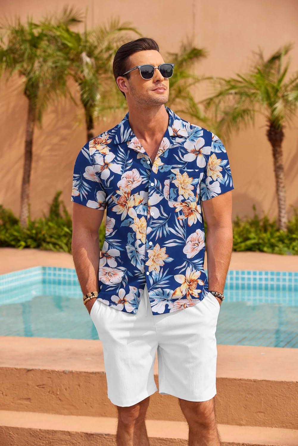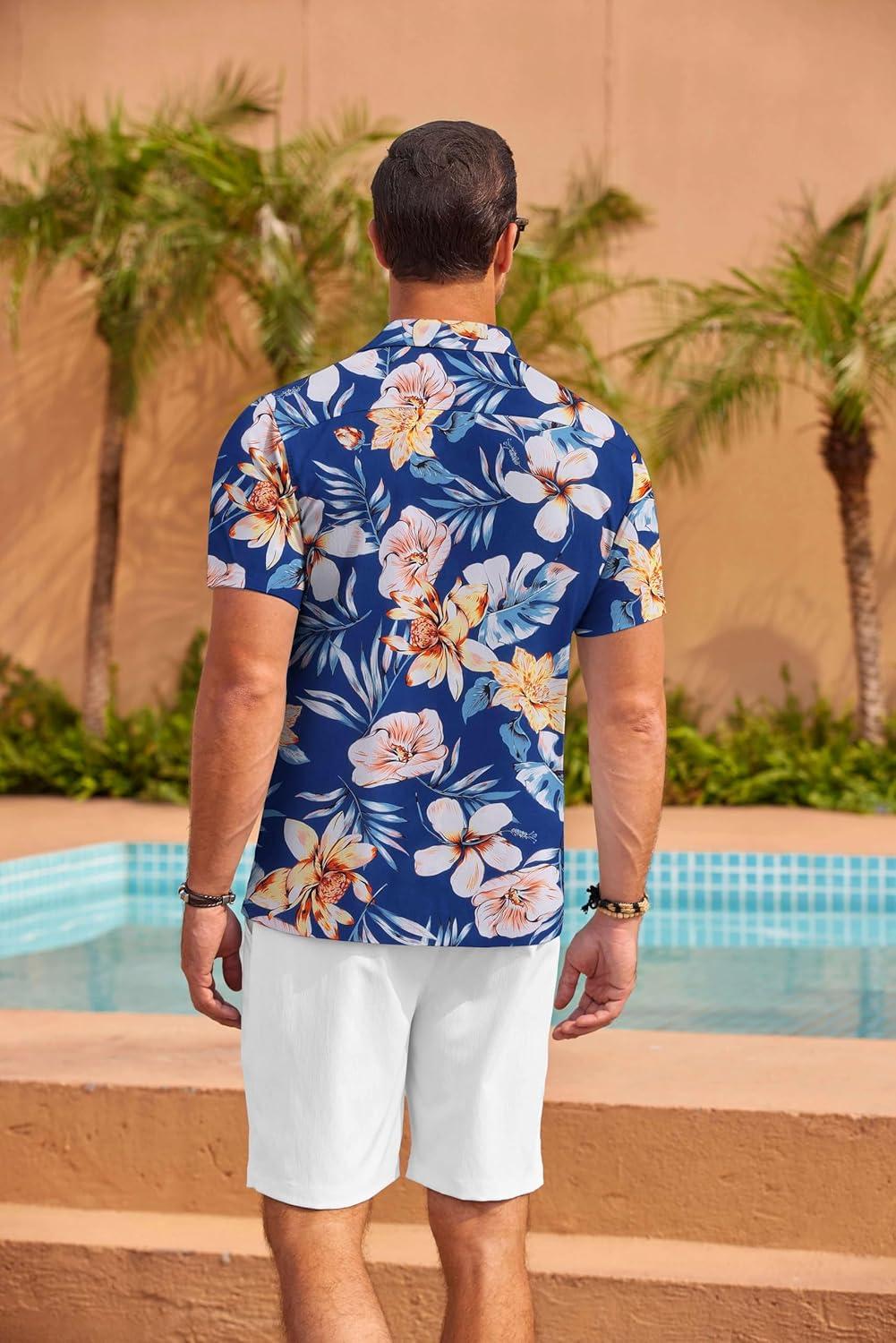 COOFANDY Mens Hawaiian Shirt Short Sleeve Floral Button Down Shirts Tropical Summer Beach Shirts Camp Collar Shirt(Blue-white Floral)