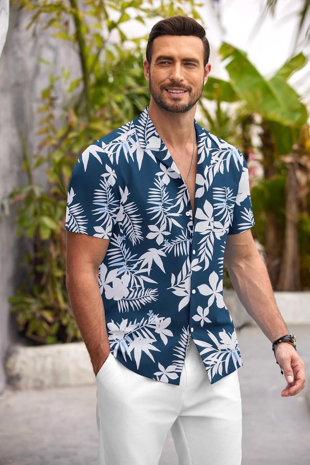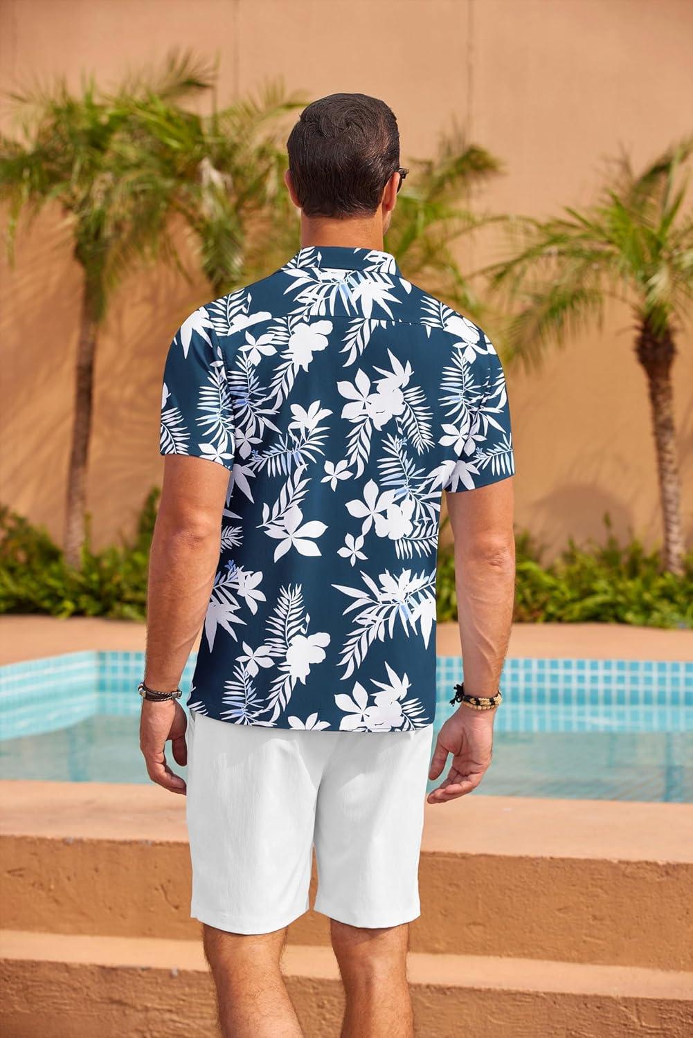 COOFANDY Mens Hawaiian Shirt Short Sleeve Floral Button Down Shirts Tropical Summer Beach Shirts Camp Collar Shirt(Dark Blue-white Floral)