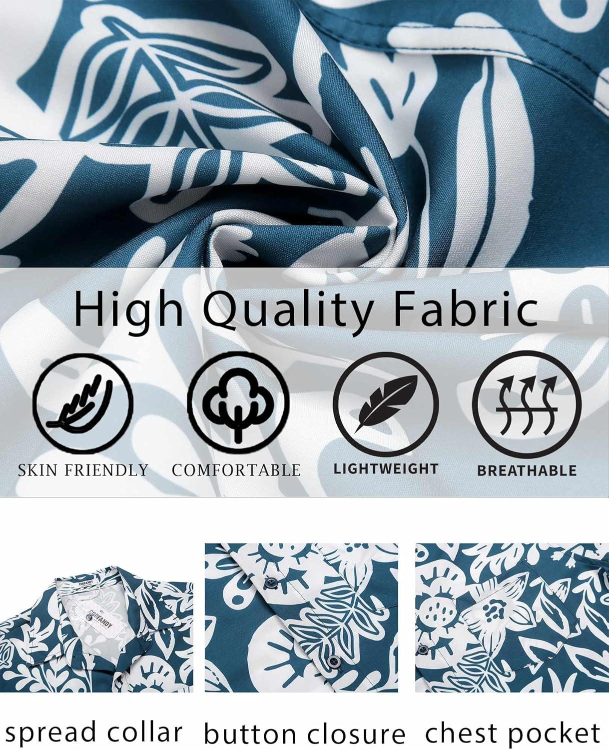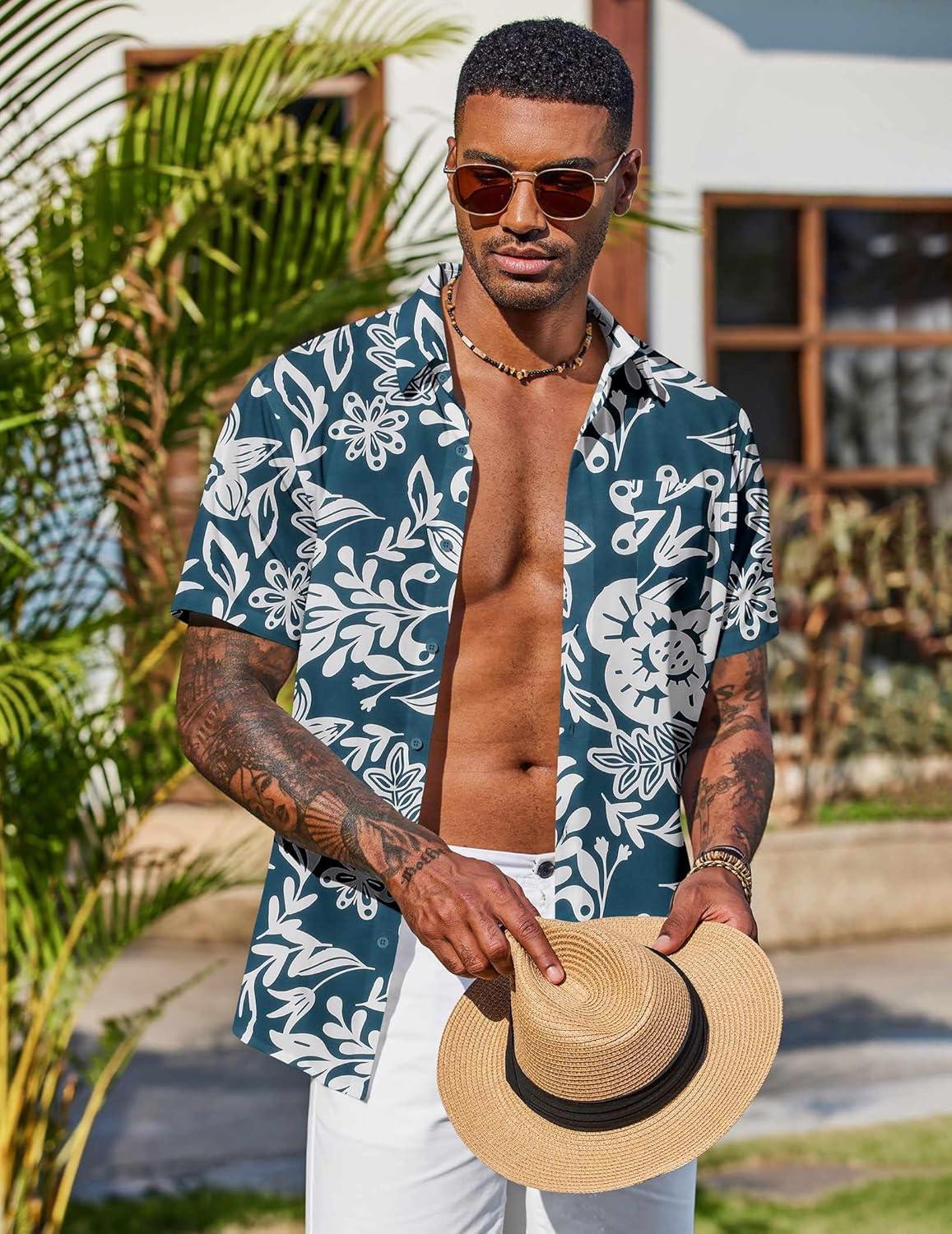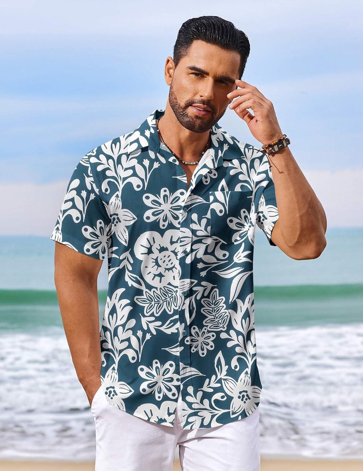 COOFANDY Men’s Hawaiian Shirt Short Sleeve Floral Button Down Shirts Tropical Vacation Beach Shirts with Pocket(Dark Green – White Flower)