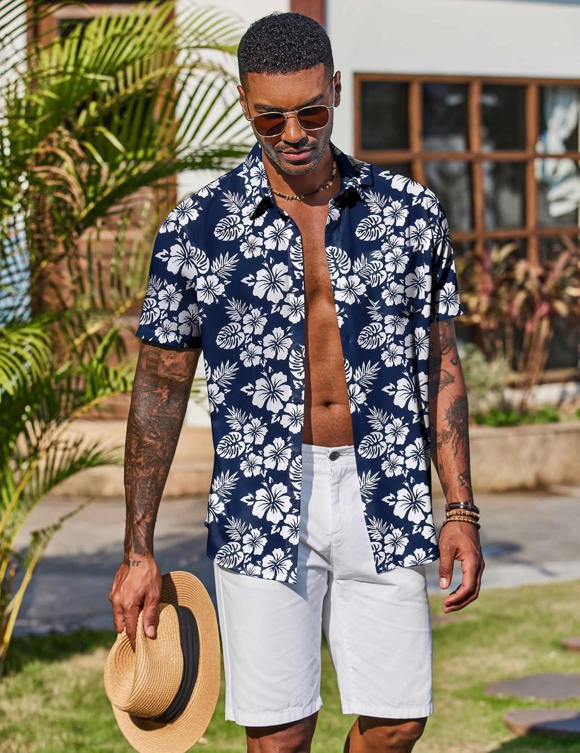 COOFANDY Men's Hawaiian Shirt Short Sleeve Floral Button Down Shirts Tropical Vacation Beach Shirts with Pocket(Navy - White Flower)