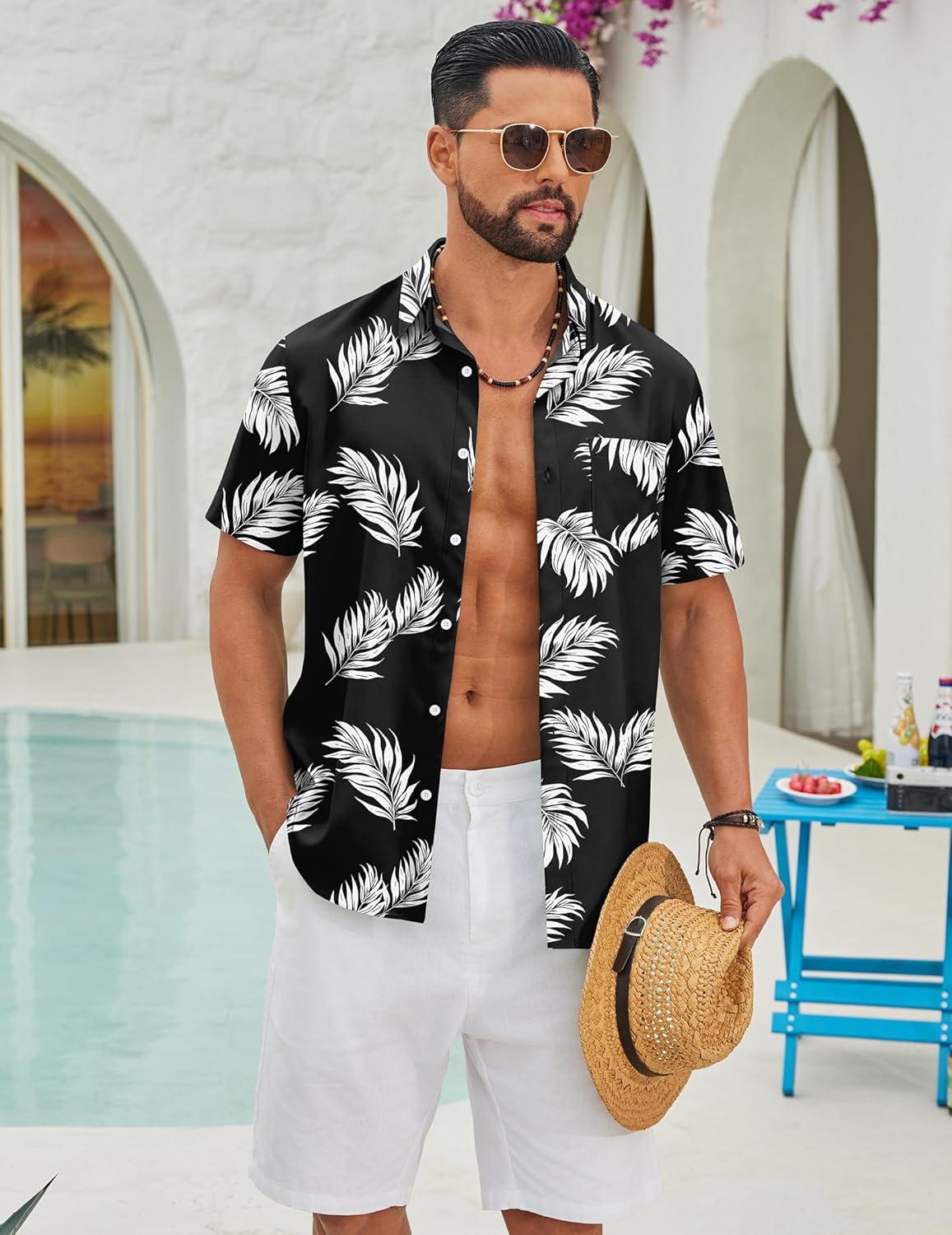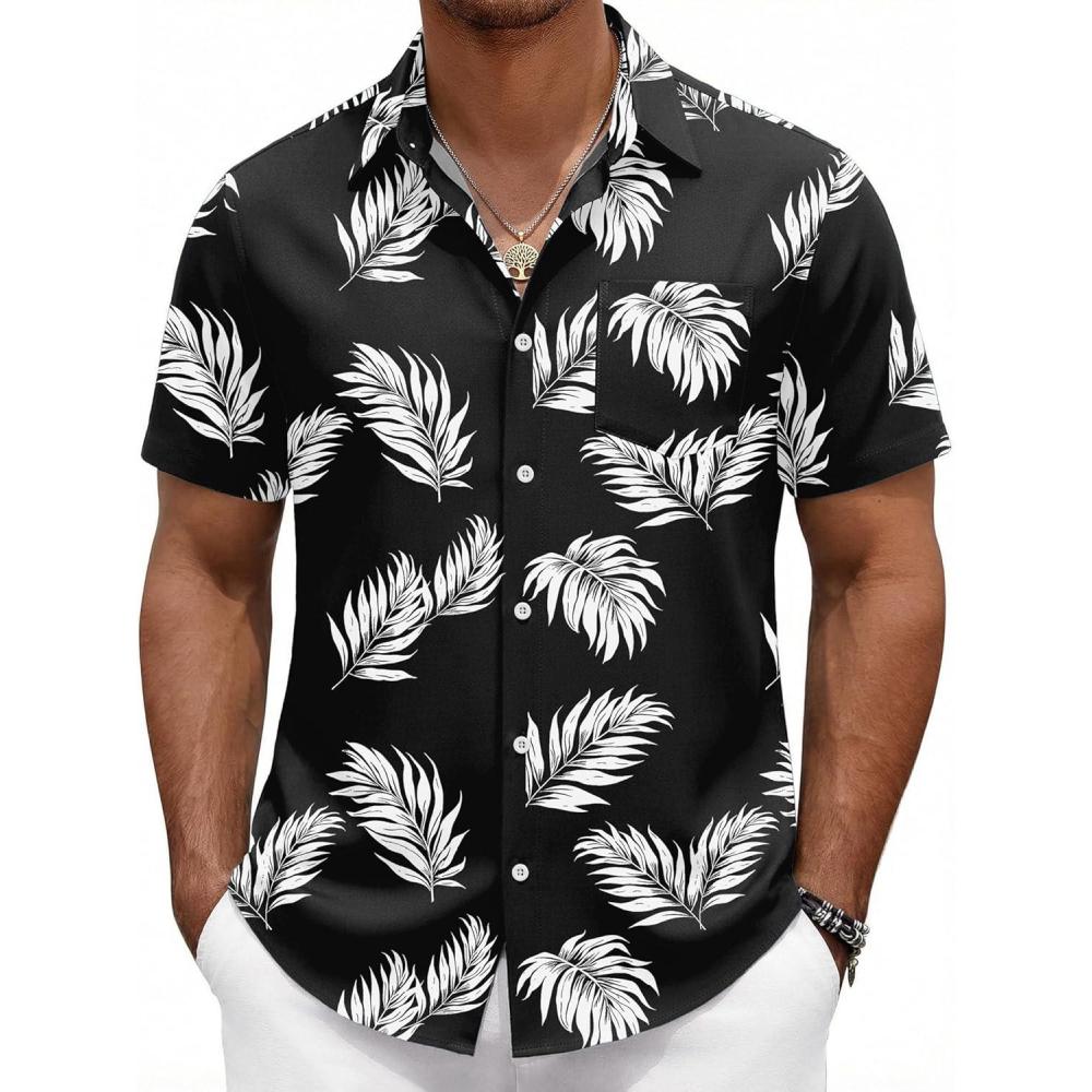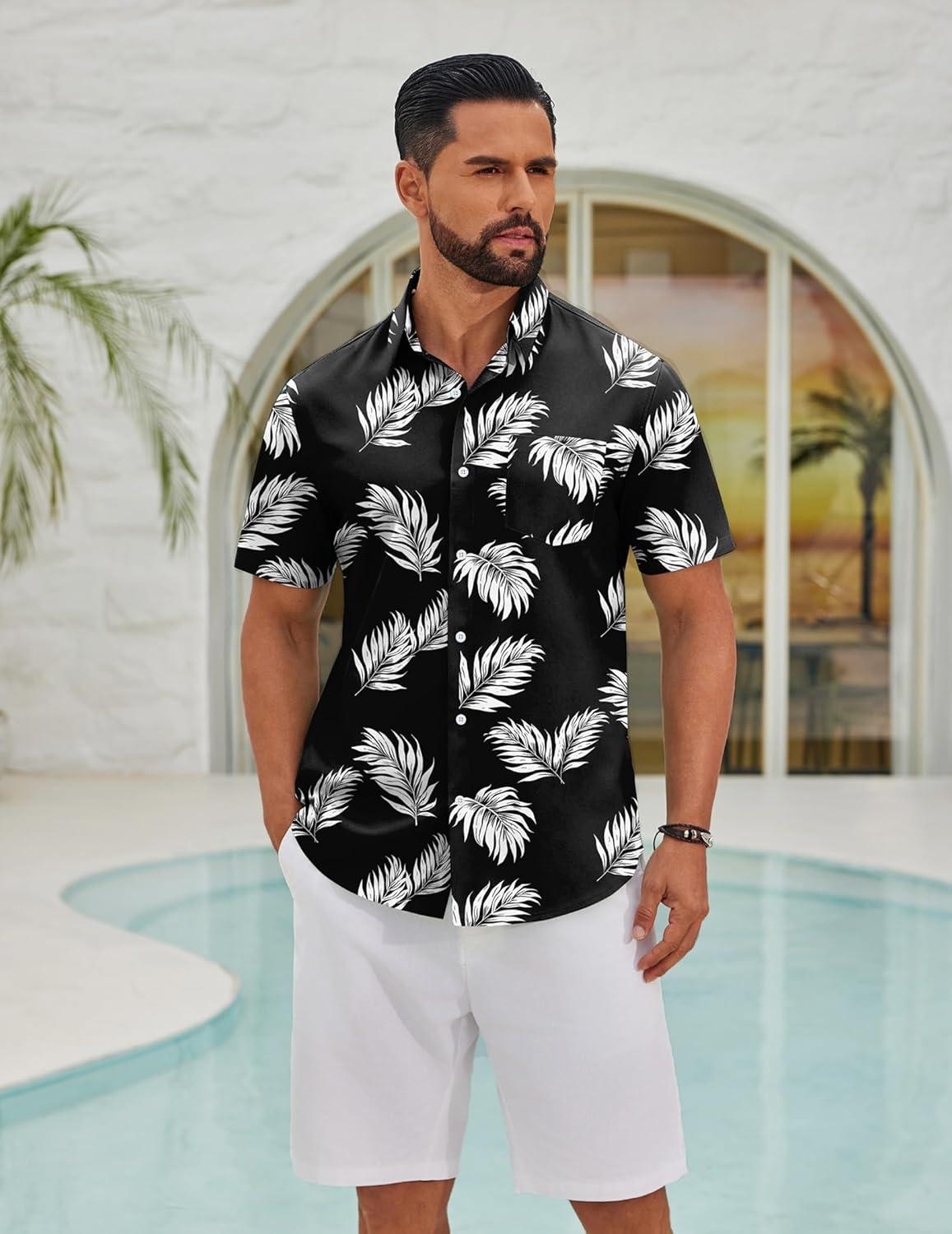 COOFANDY Mens Hawaiian Shirts Short Sleeve Button Down Aloha Shirts Summer Vacation Beach Shirts(Black-palm Leaf)