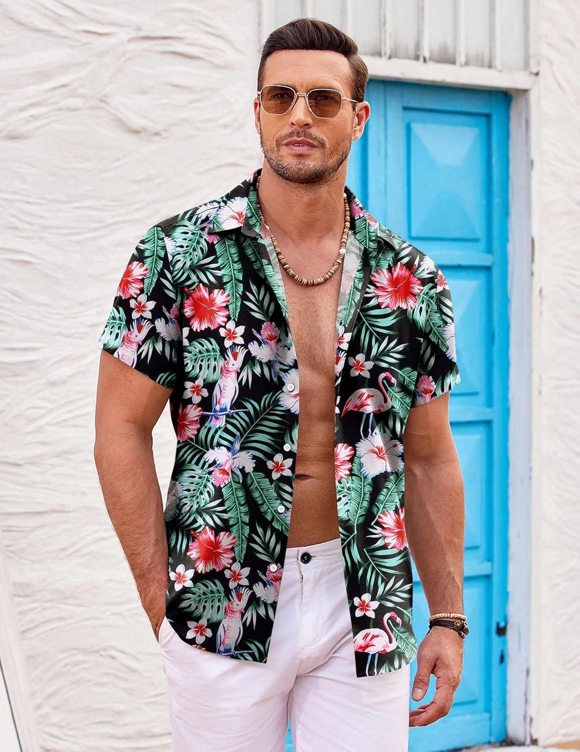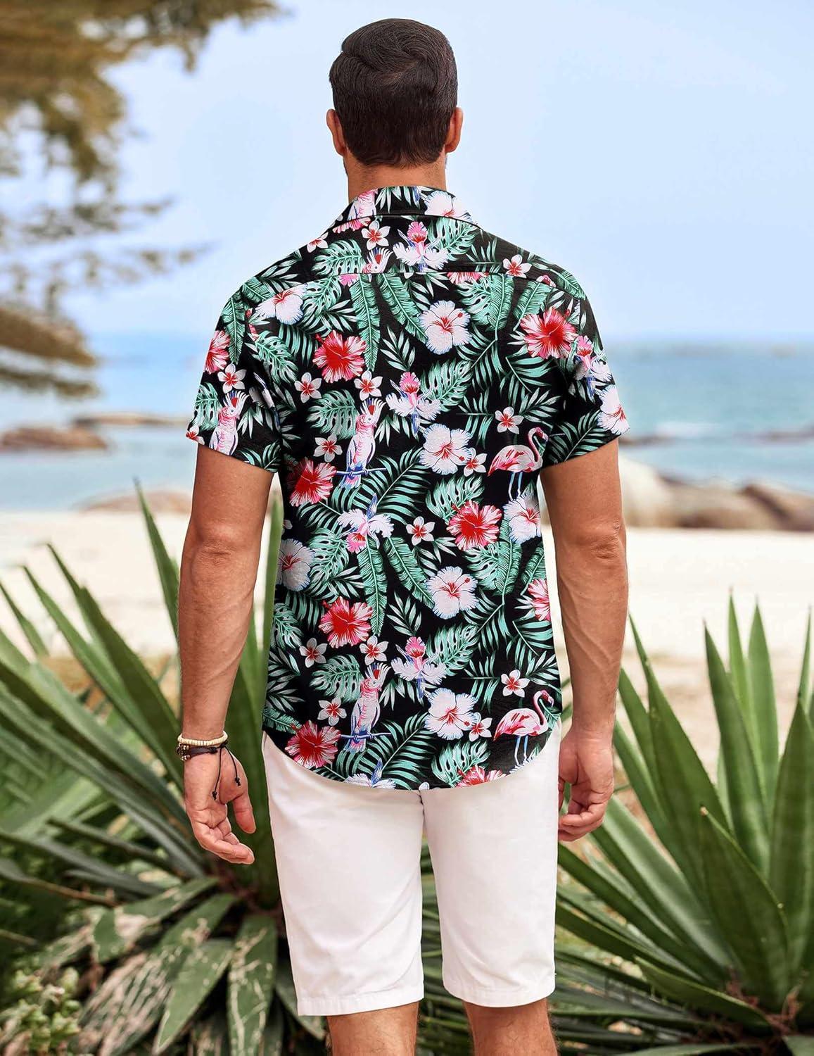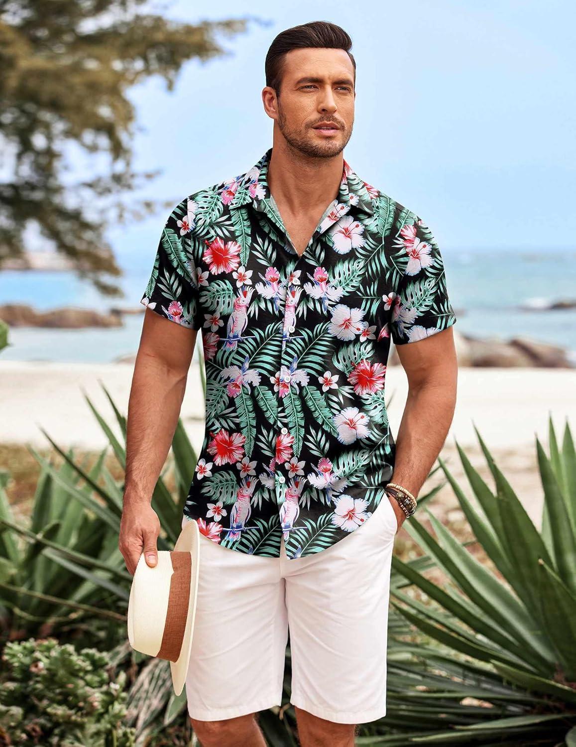 COOFANDY Mens Hawaiian Shirts Short Sleeve Casual Button Down Beach Vacation Summer Shirt(Black-green Leaf)