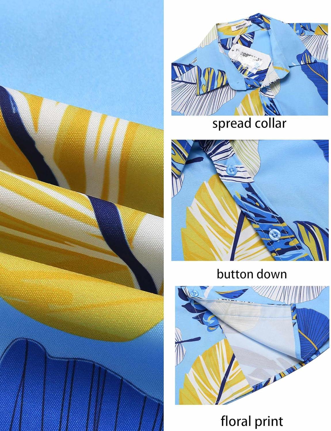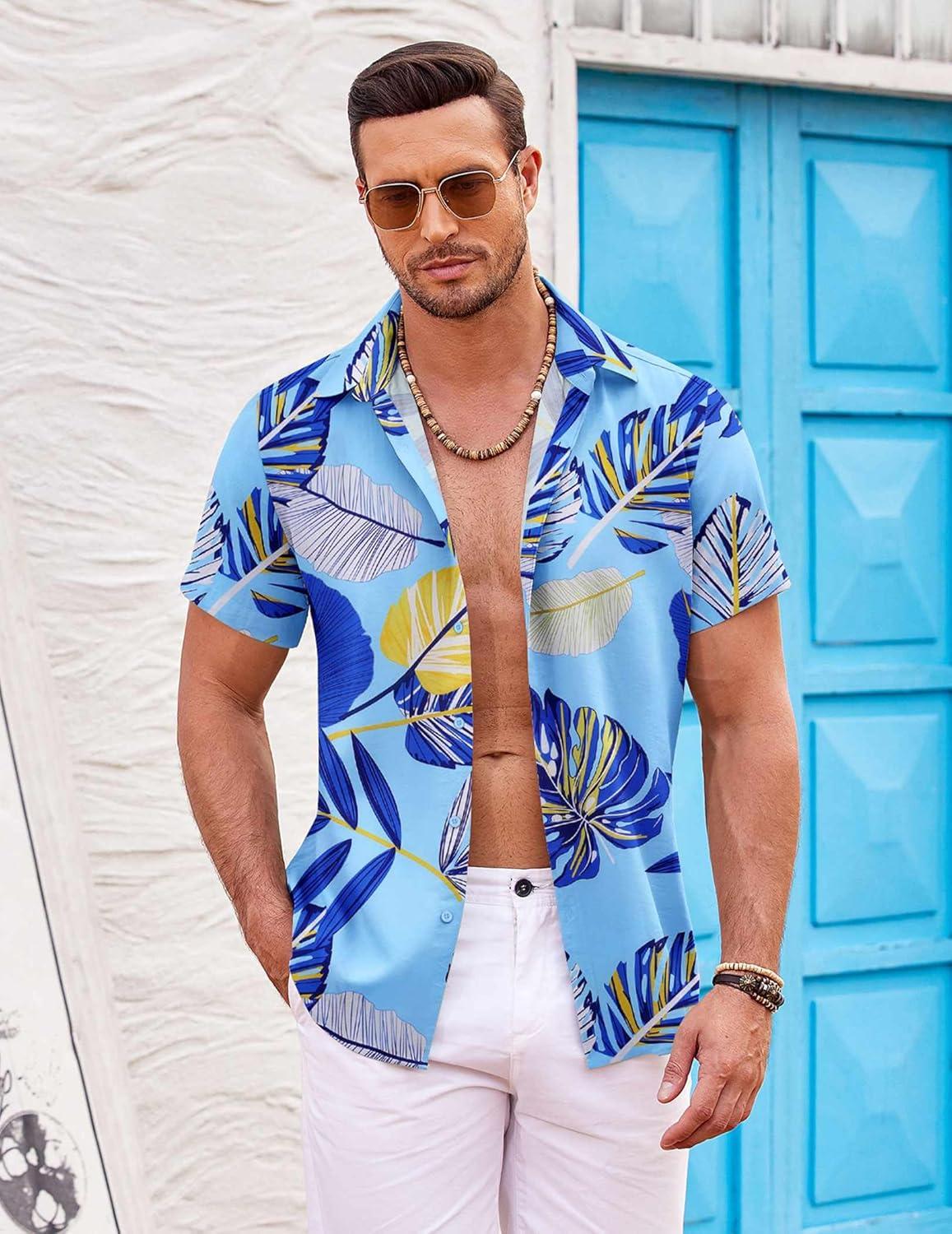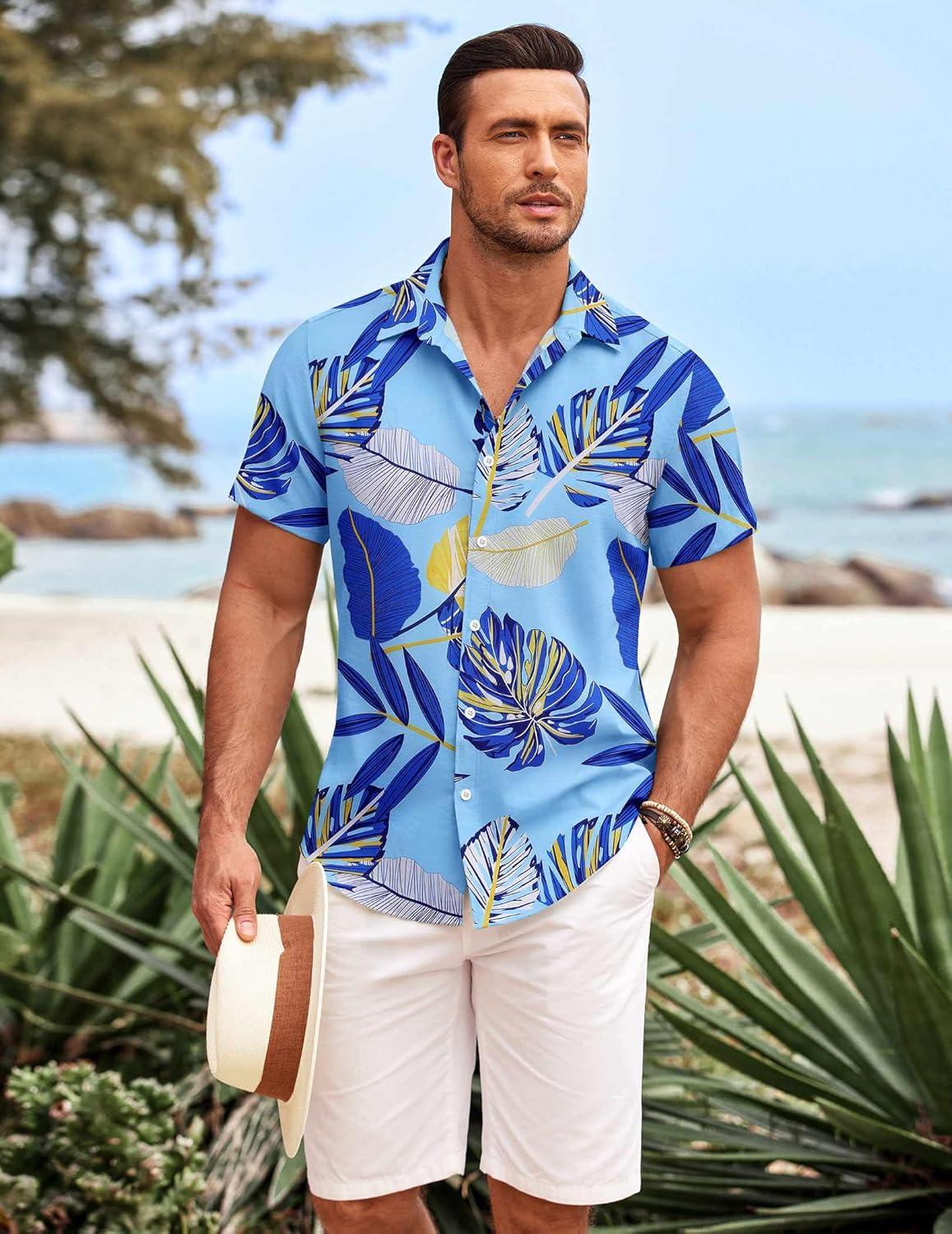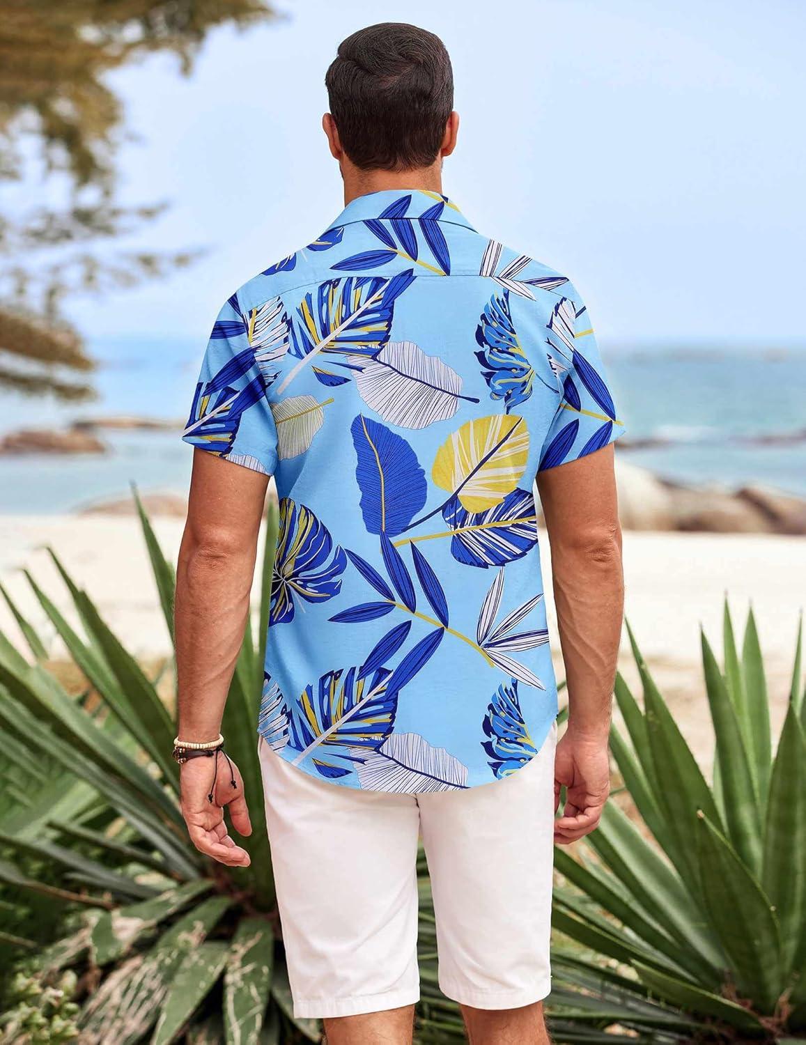 COOFANDY Mens Hawaiian Shirts Short Sleeve Casual Button Down Beach Vacation Summer Shirt(Light Blue-palm Leaf)