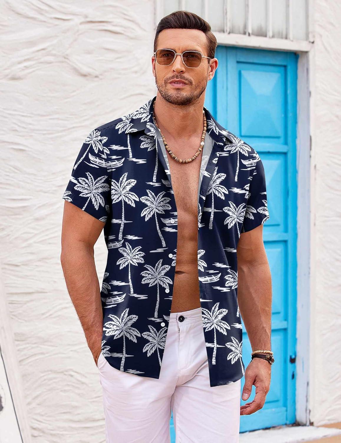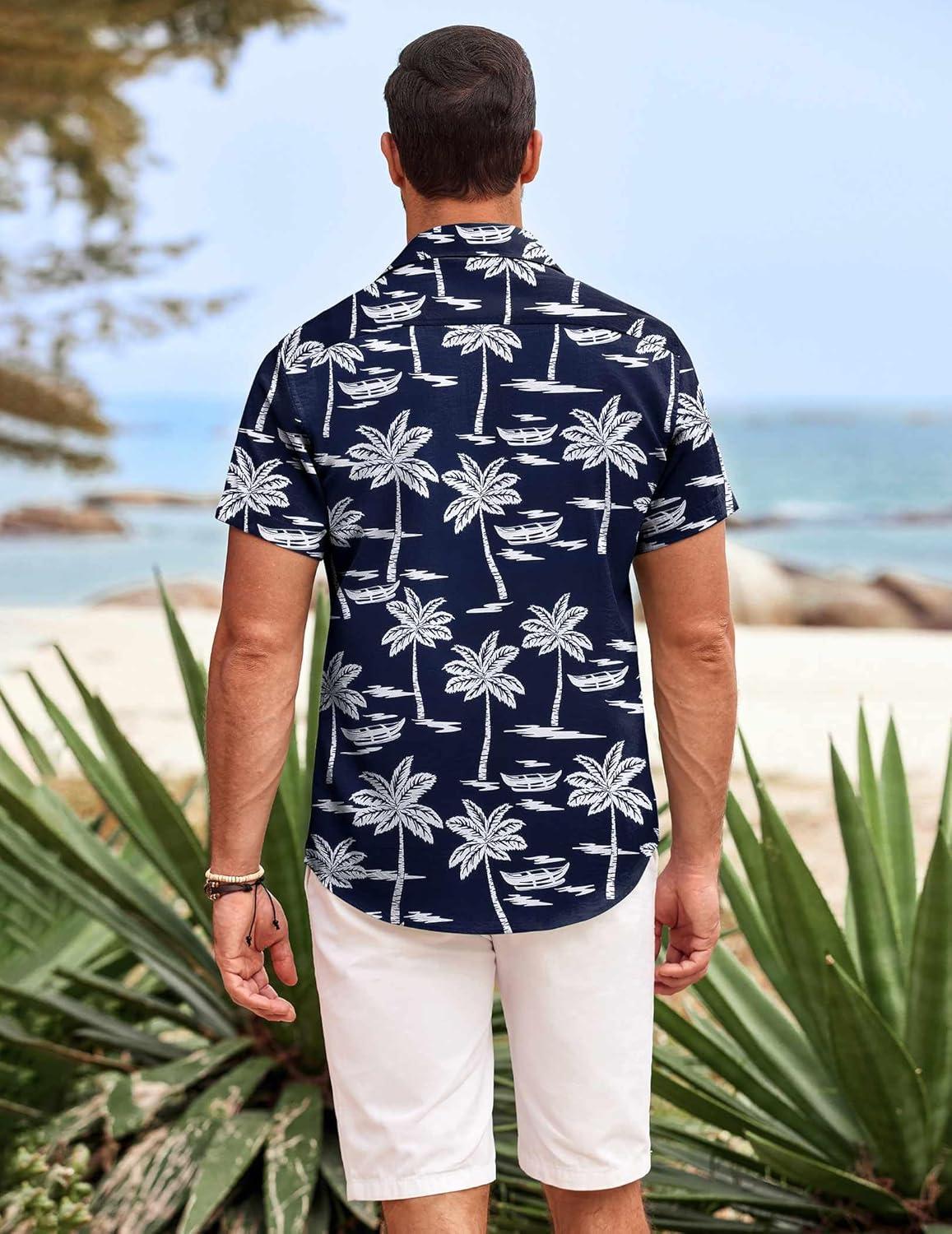 COOFANDY Mens Hawaiian Shirts Short Sleeve Casual Button Down Beach Vacation Summer Shirt(Navy Blue-white Tree)