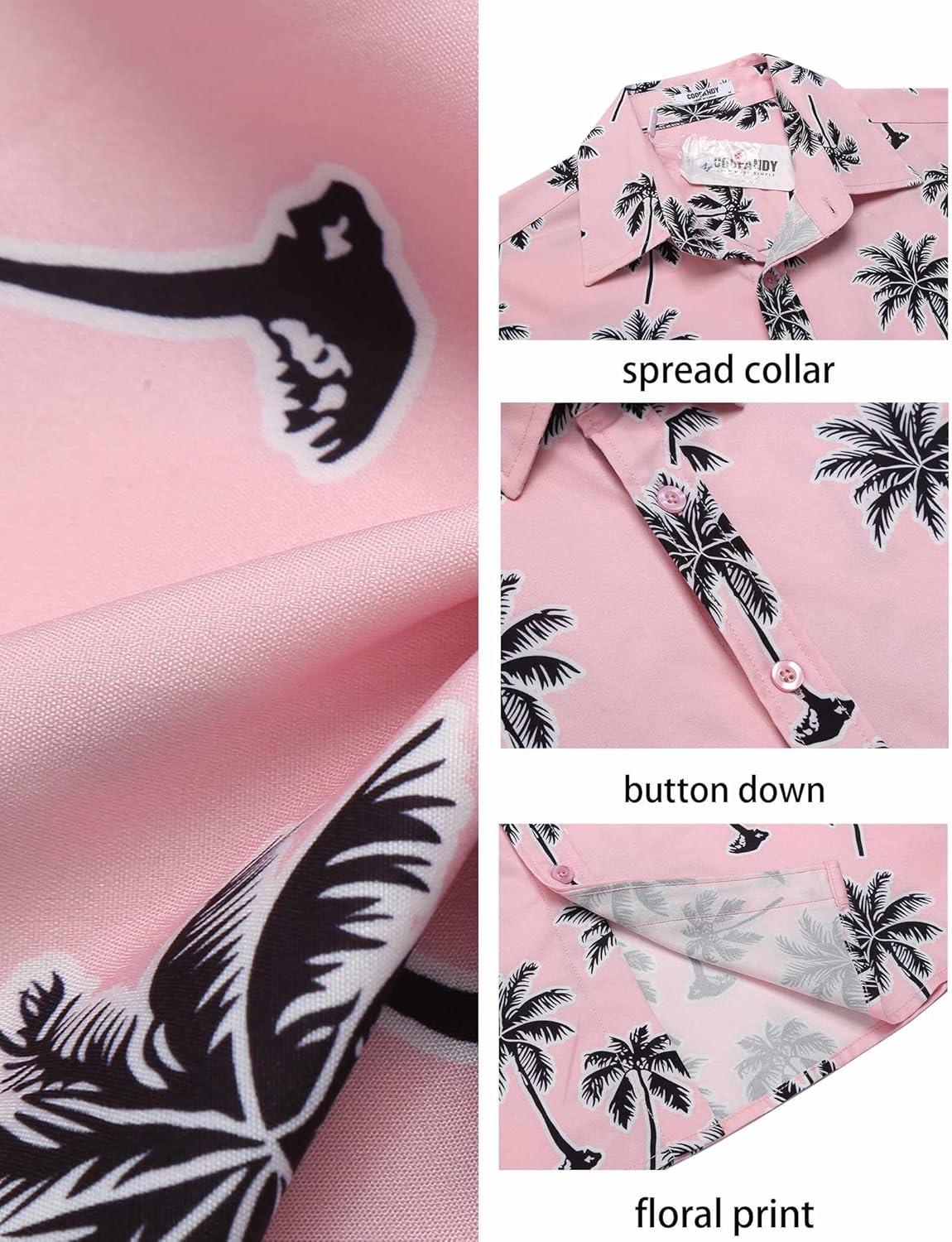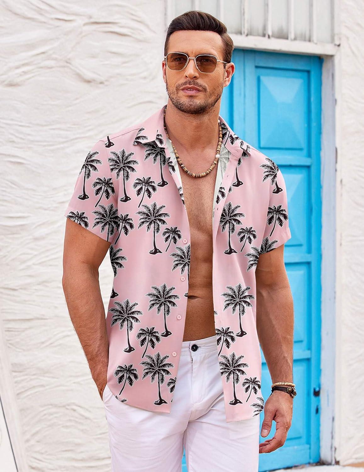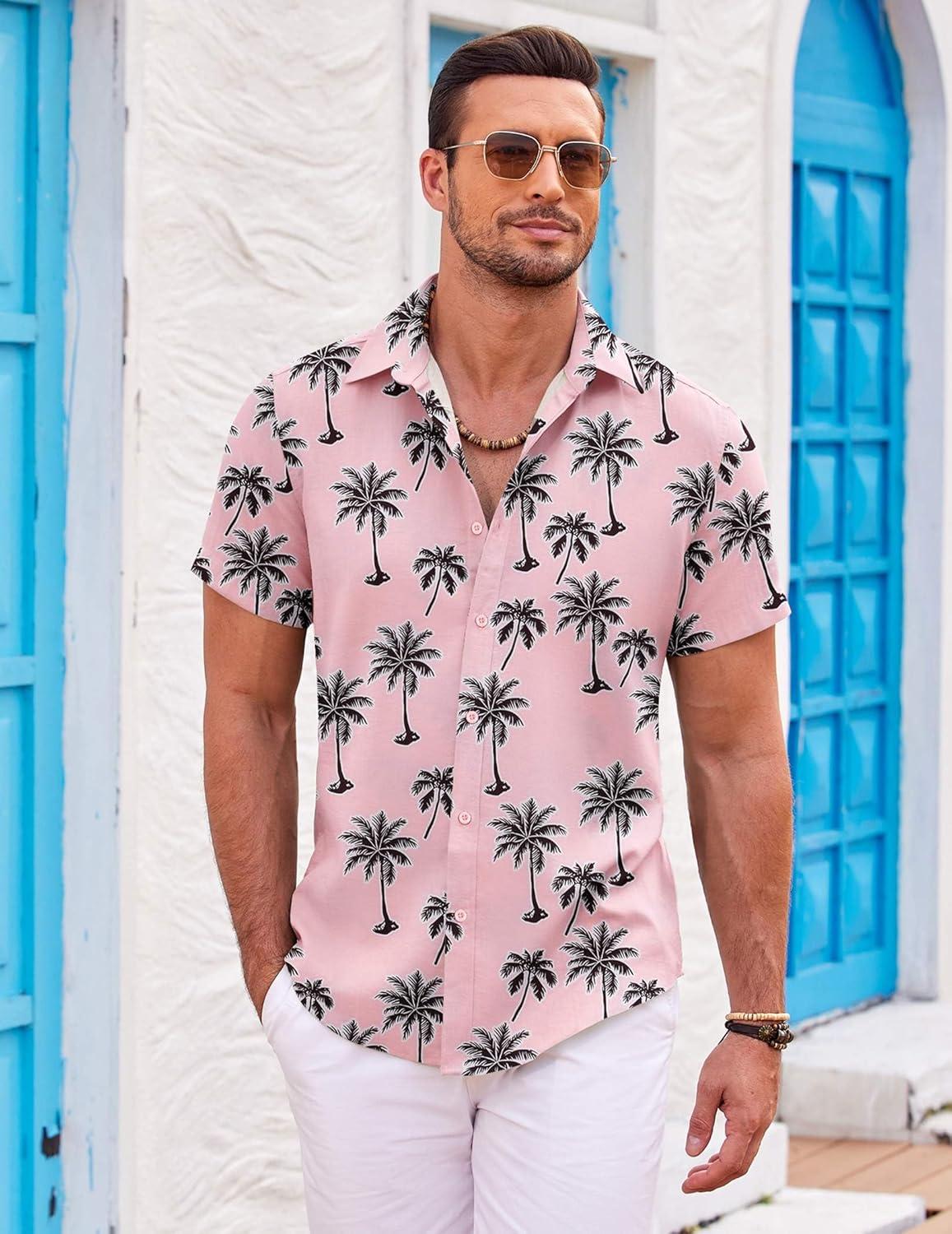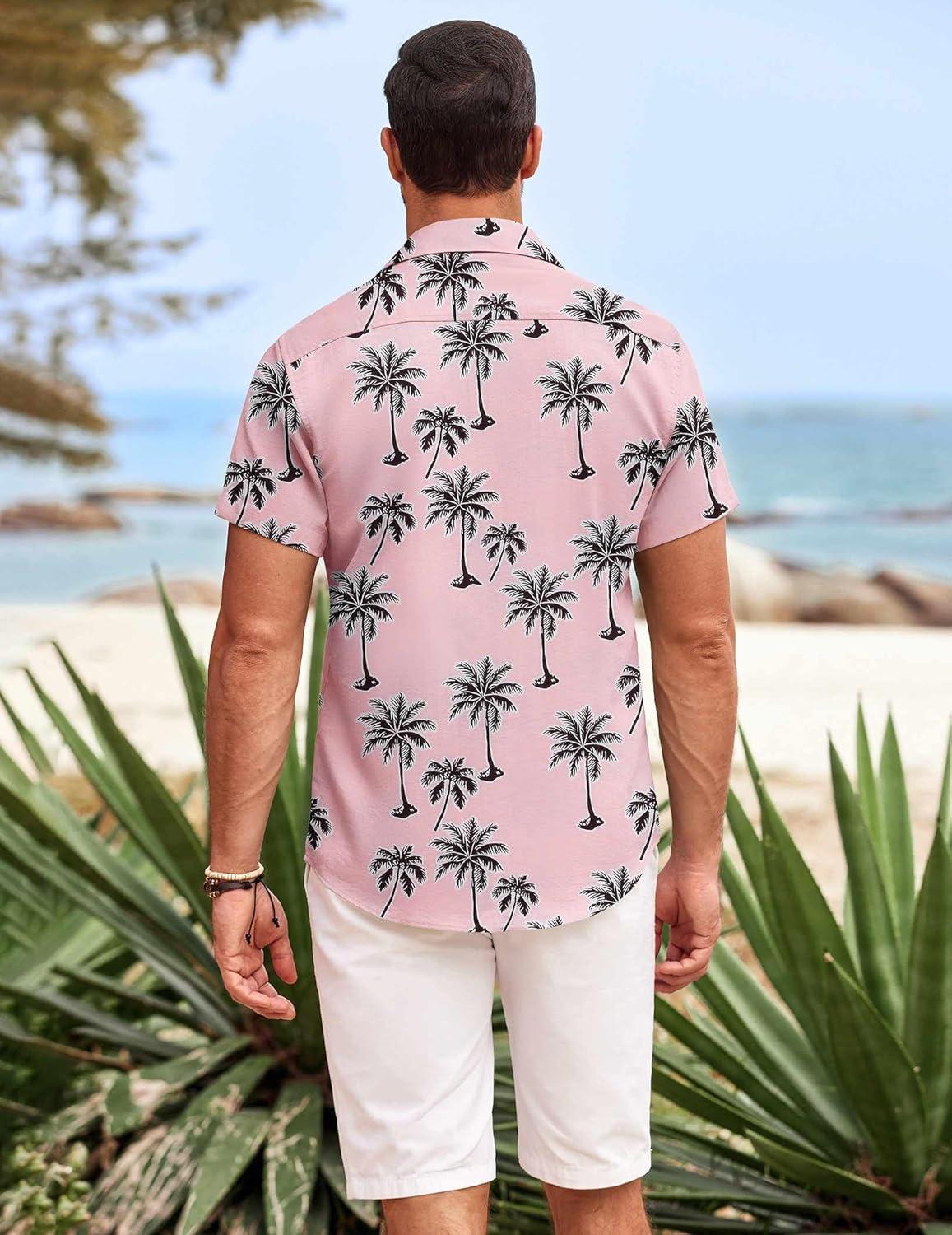 COOFANDY Mens Hawaiian Shirts Short Sleeve Casual Button Down Beach Vacation Summer Shirt(Pink-coconut Tree)