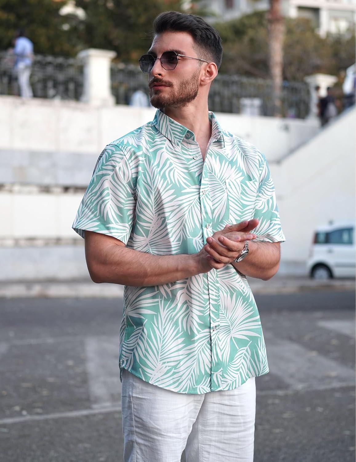 COOFANDY Mens Hawaiian Shirts Short Sleeve Casual Button Down Tropical Beach Shirt(Light Green / White Leaf)