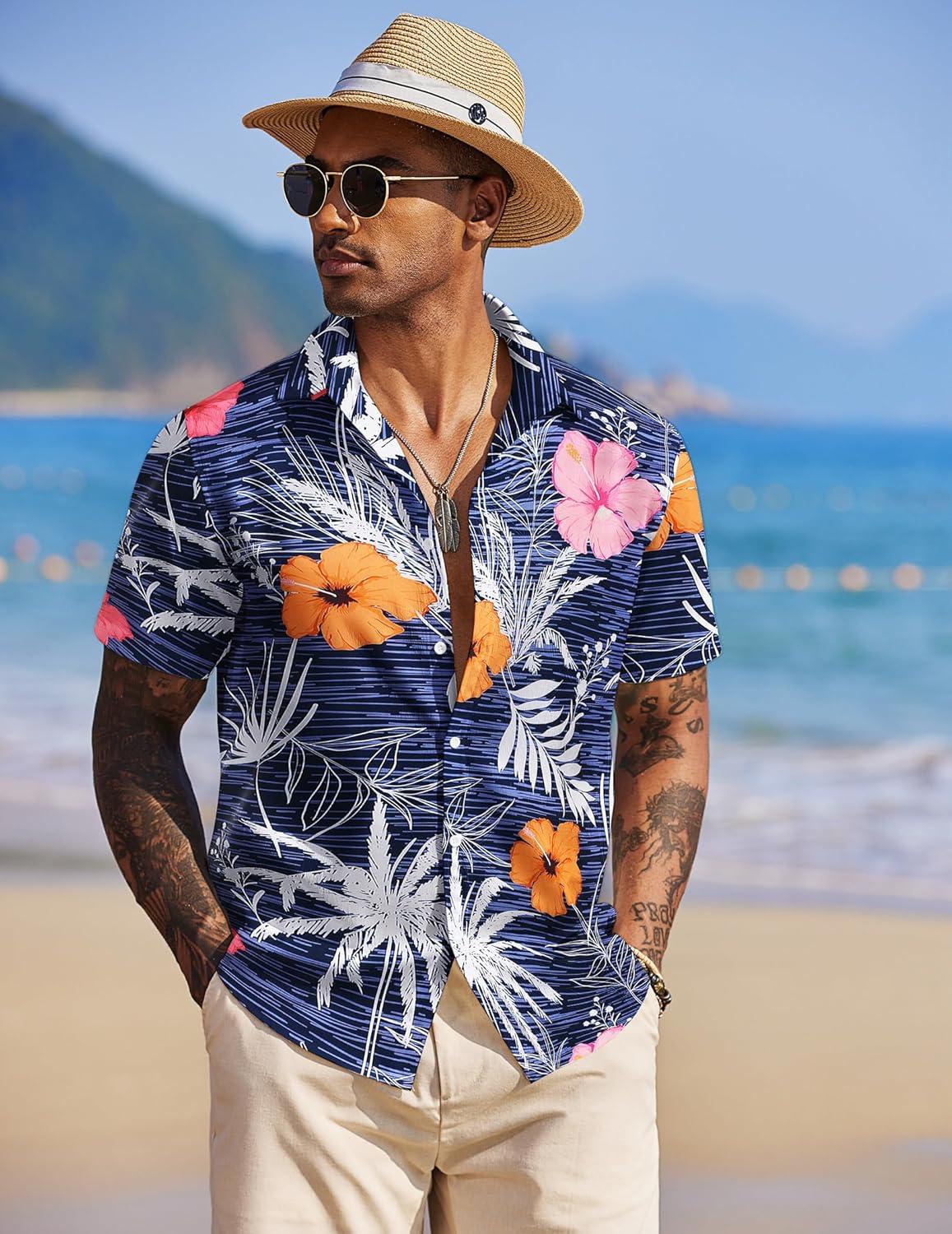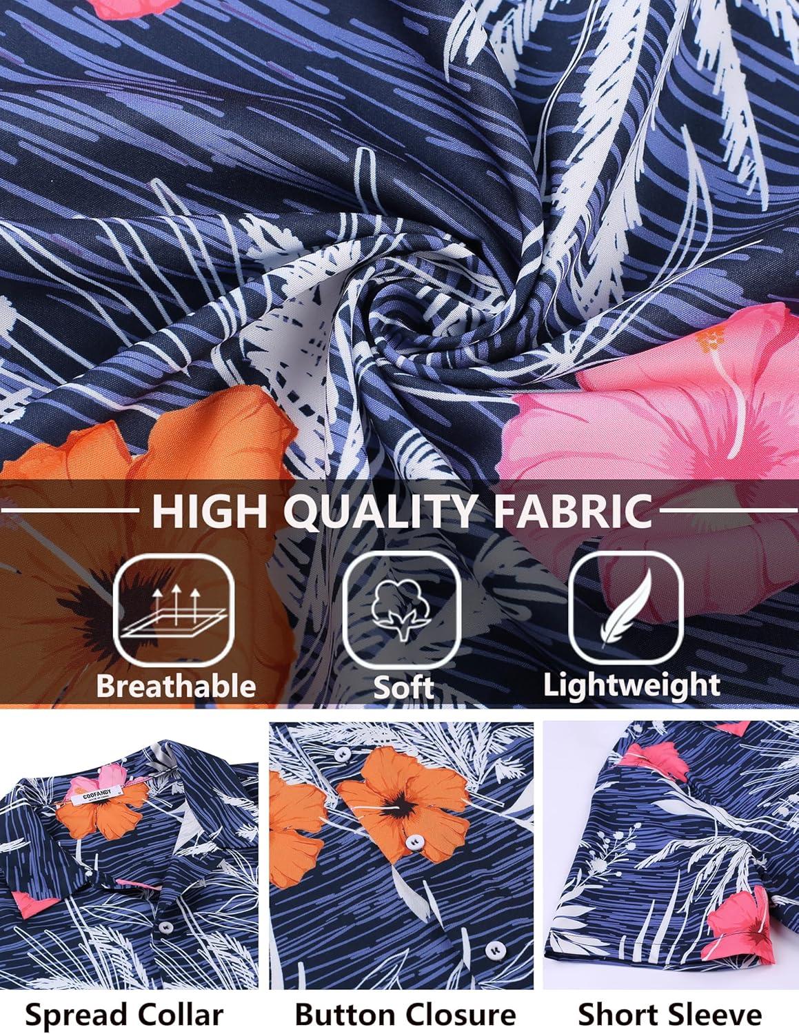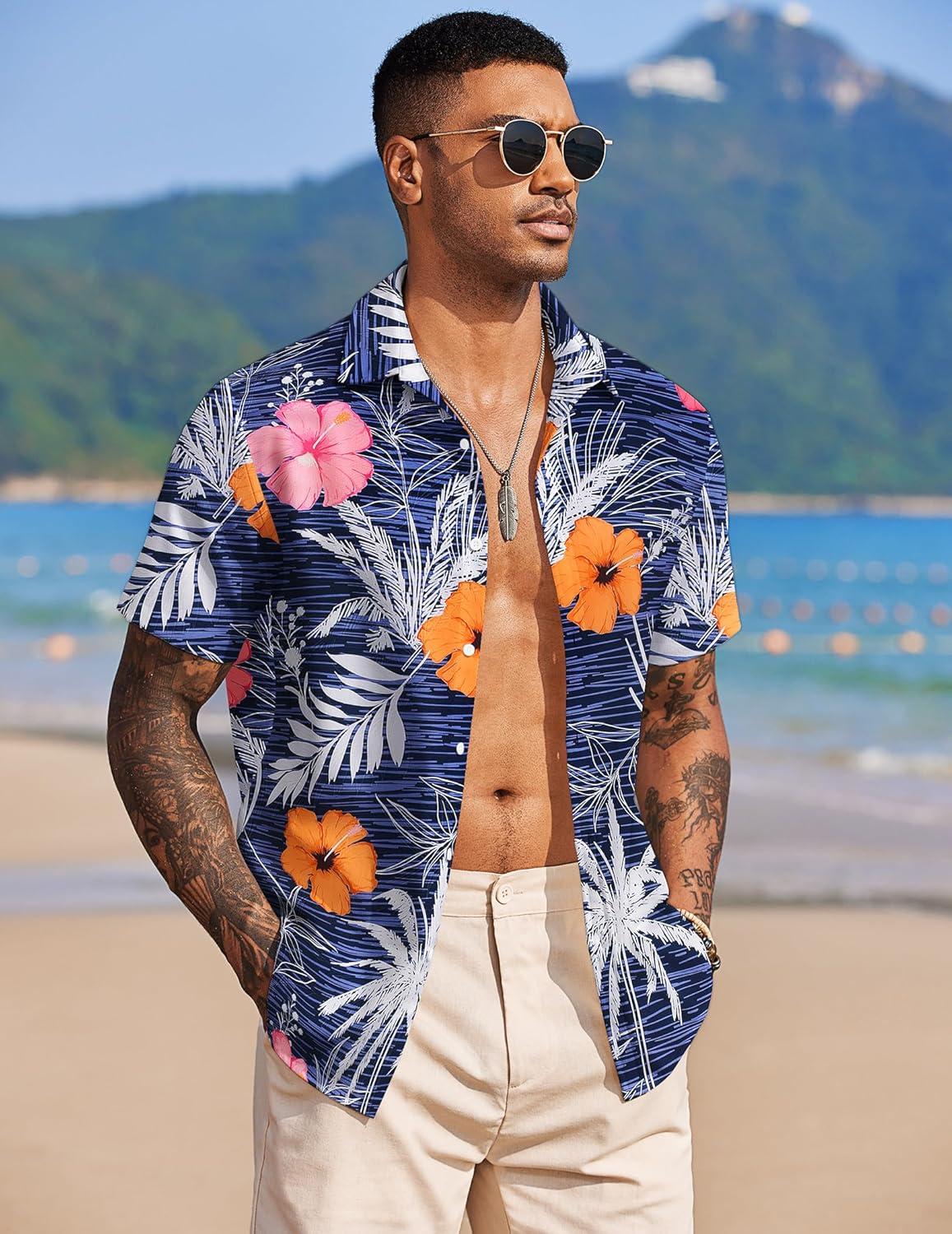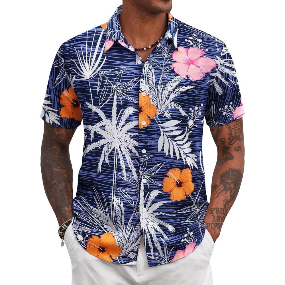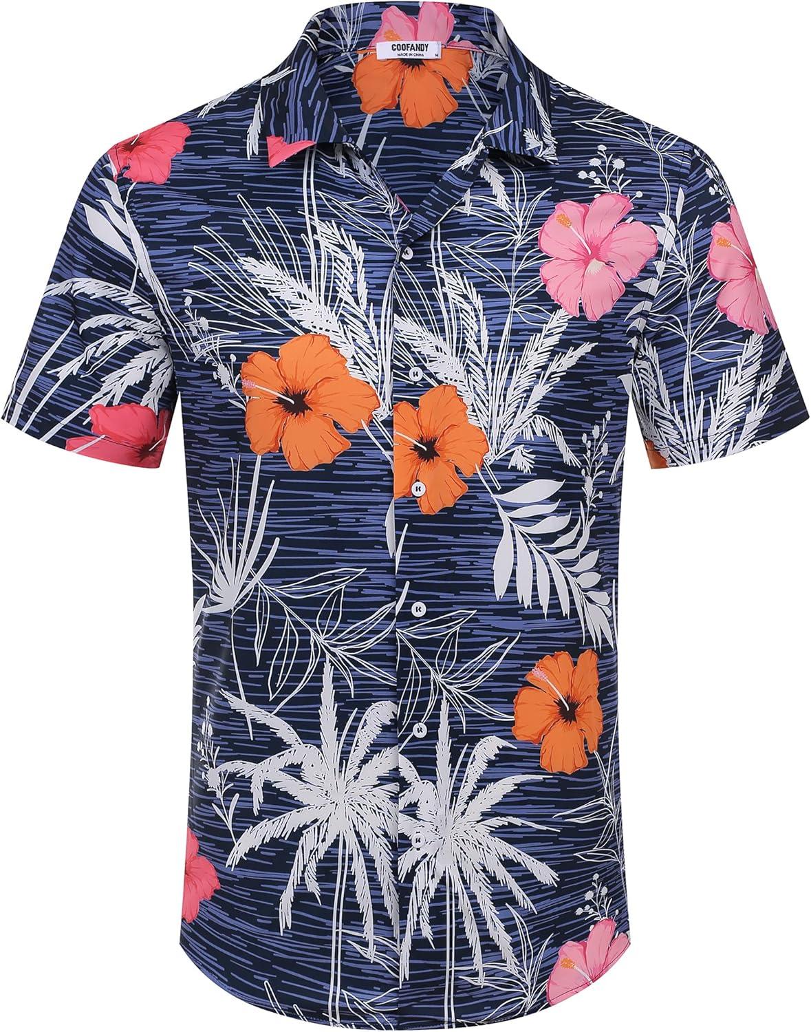 COOFANDY Mens Hawaiian Shirts Short Sleeve Tropical Button Down Shirt Floral Shirt Summer Beach Shirt(Flowers Blue Hibiscus)
