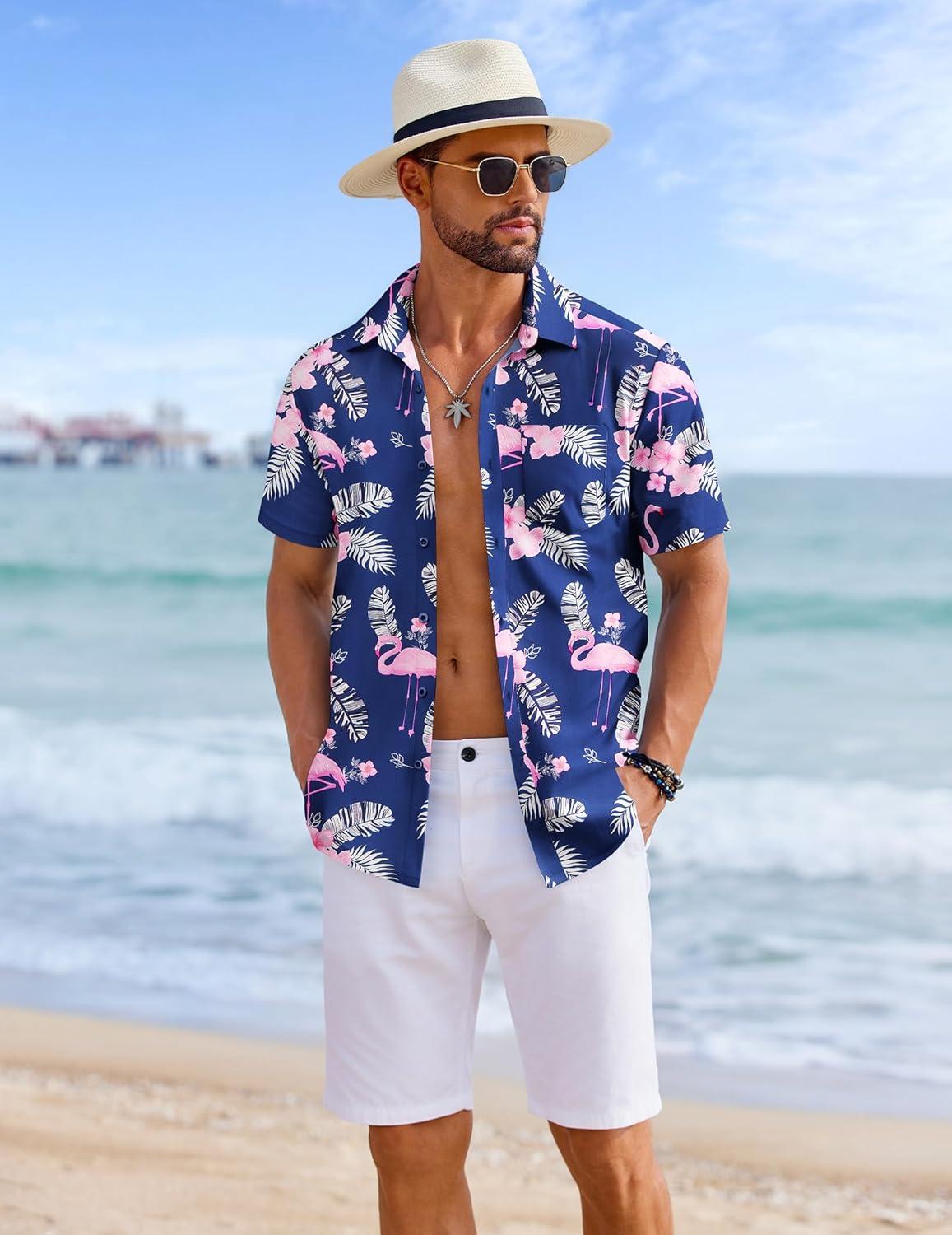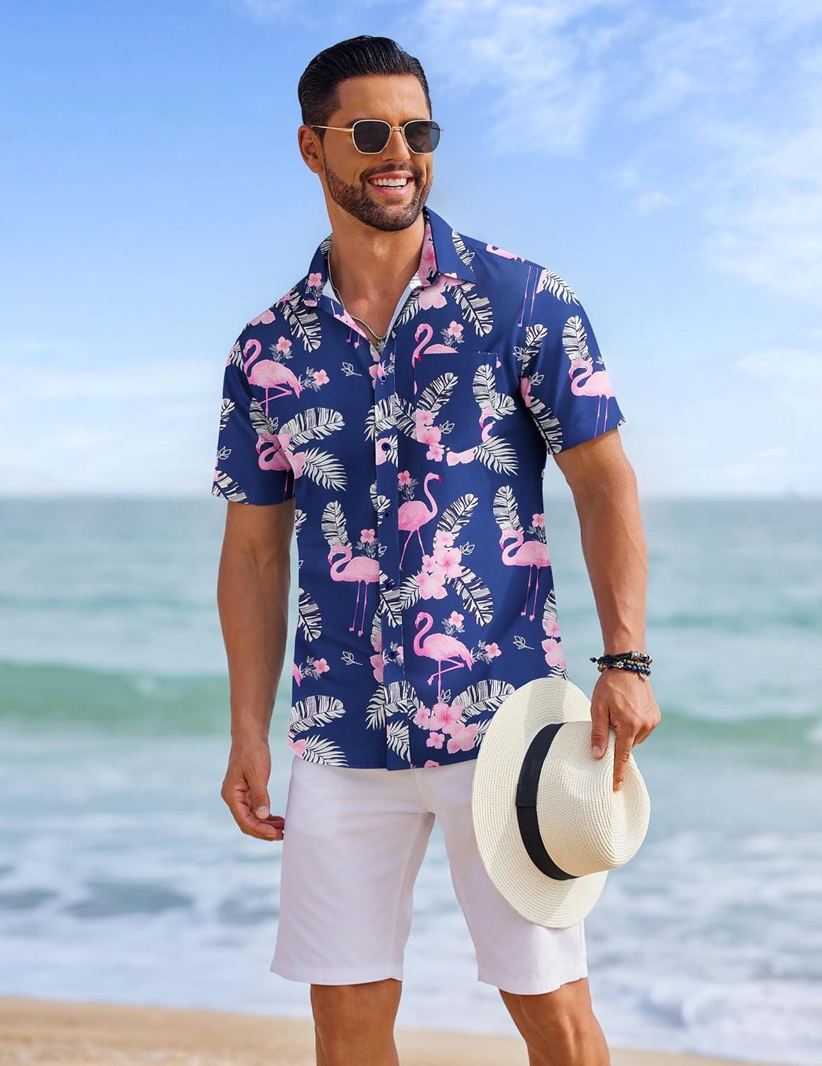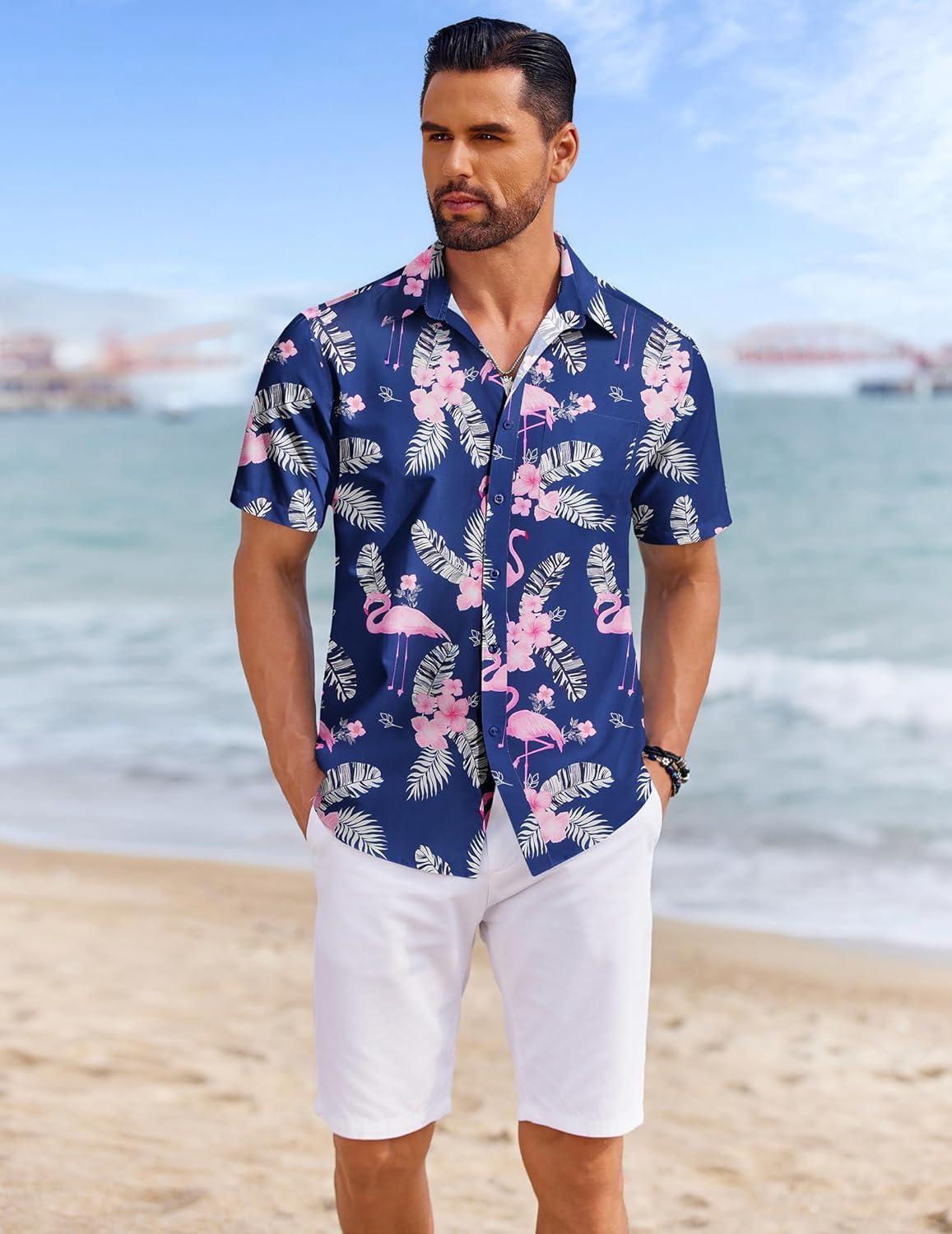 COOFANDY Mens Hawaiian Shirts Short Sleeve Tropical Button Down Shirts Floral Summer Beach Shirt(Navy Blue - Flamingo)