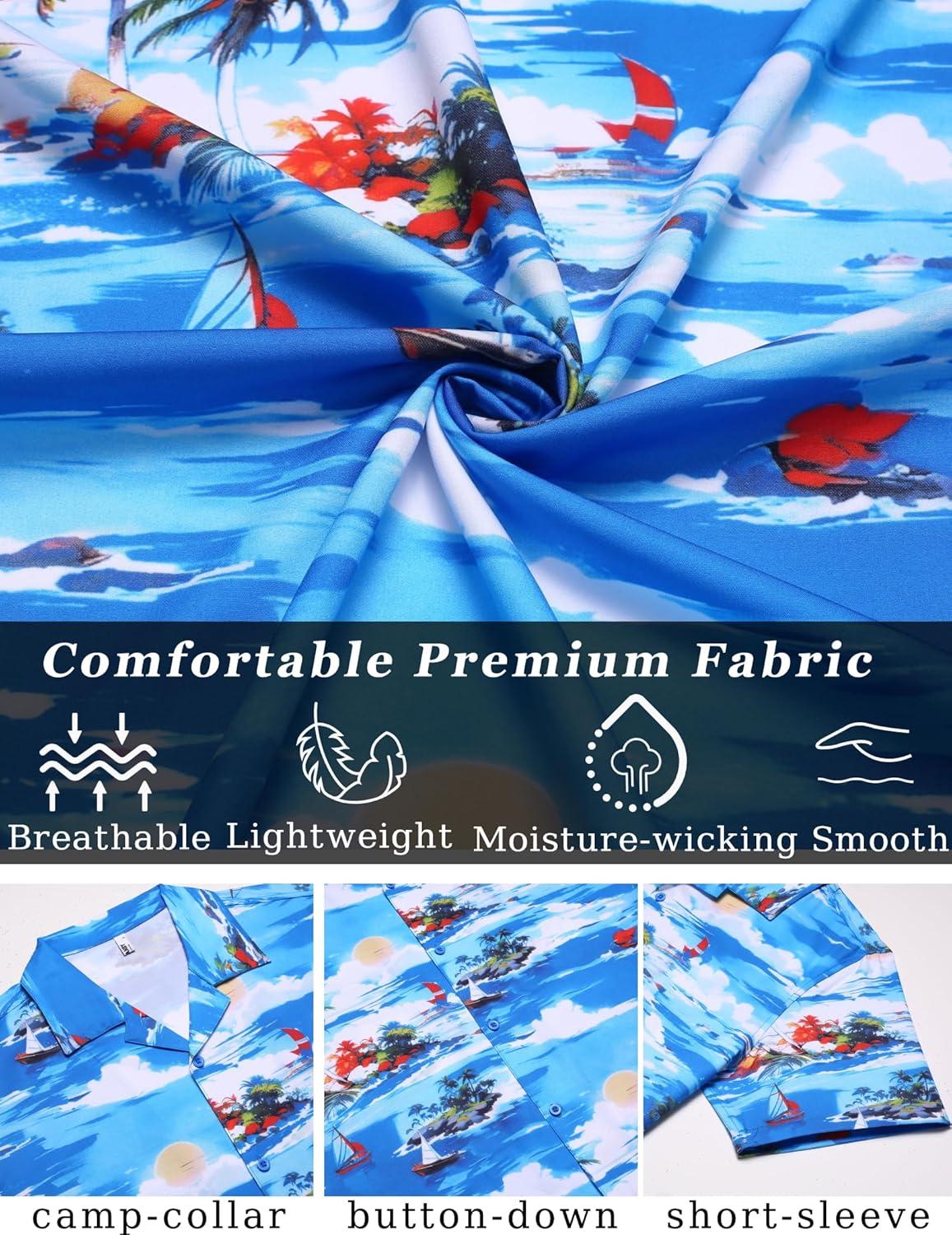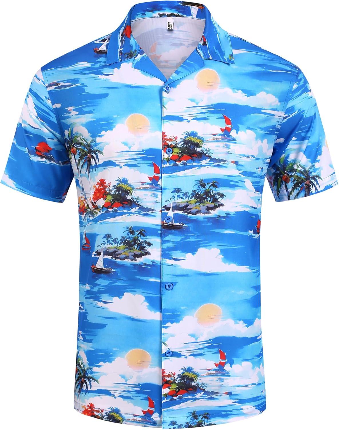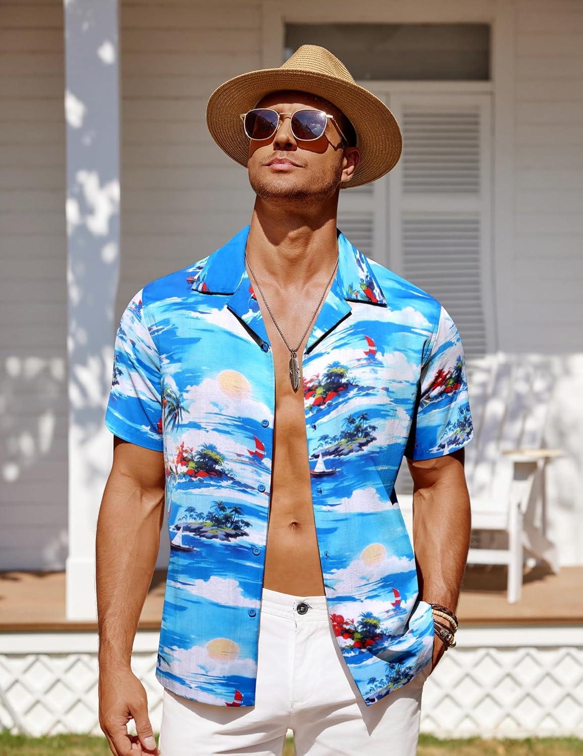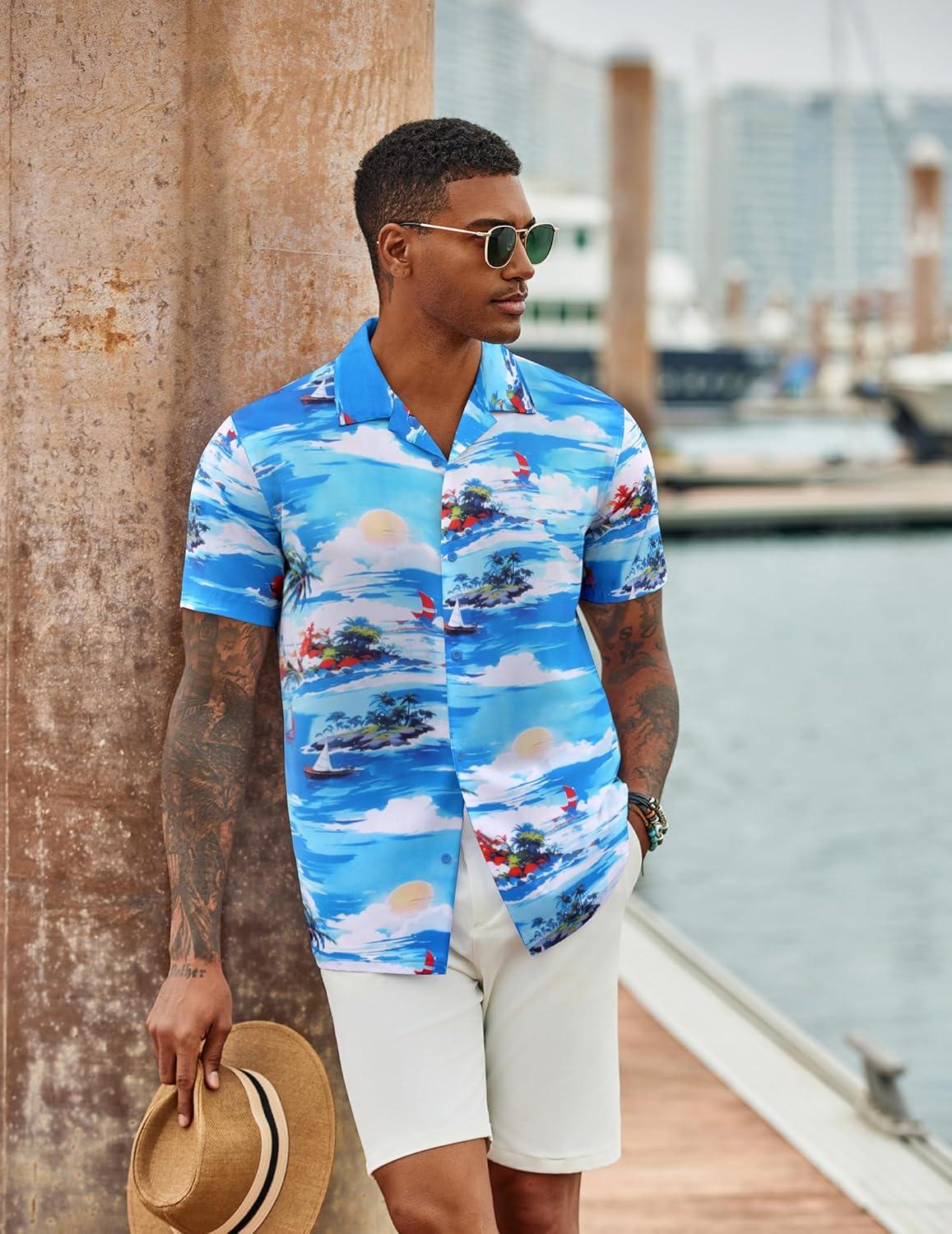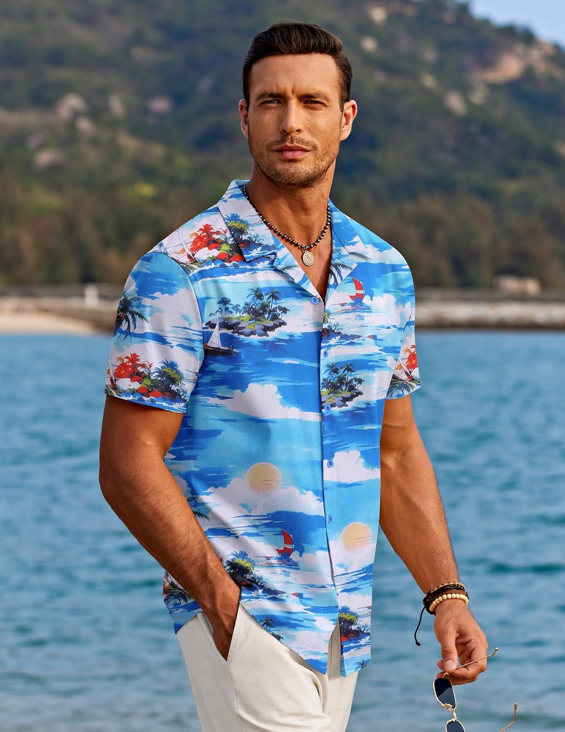 COOFANDY Mens Hawaiian Short Sleeve Shirt Casual Button Down Summer Beach Vacation Shirt Tropical Floral Aloha Shirts(Coconut Tree-blue)