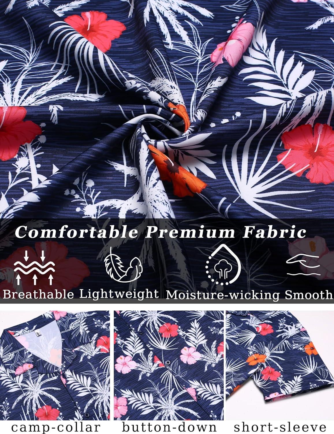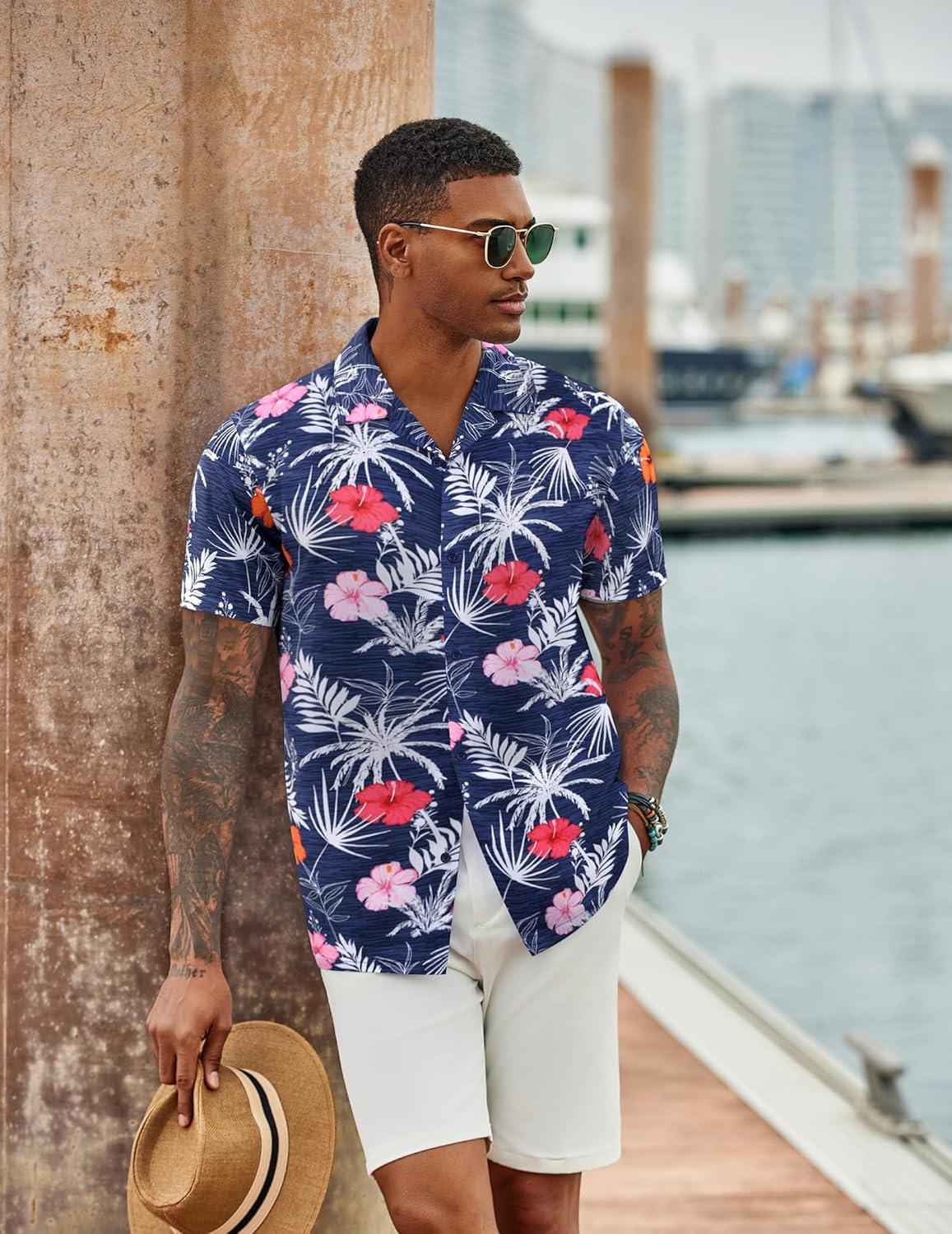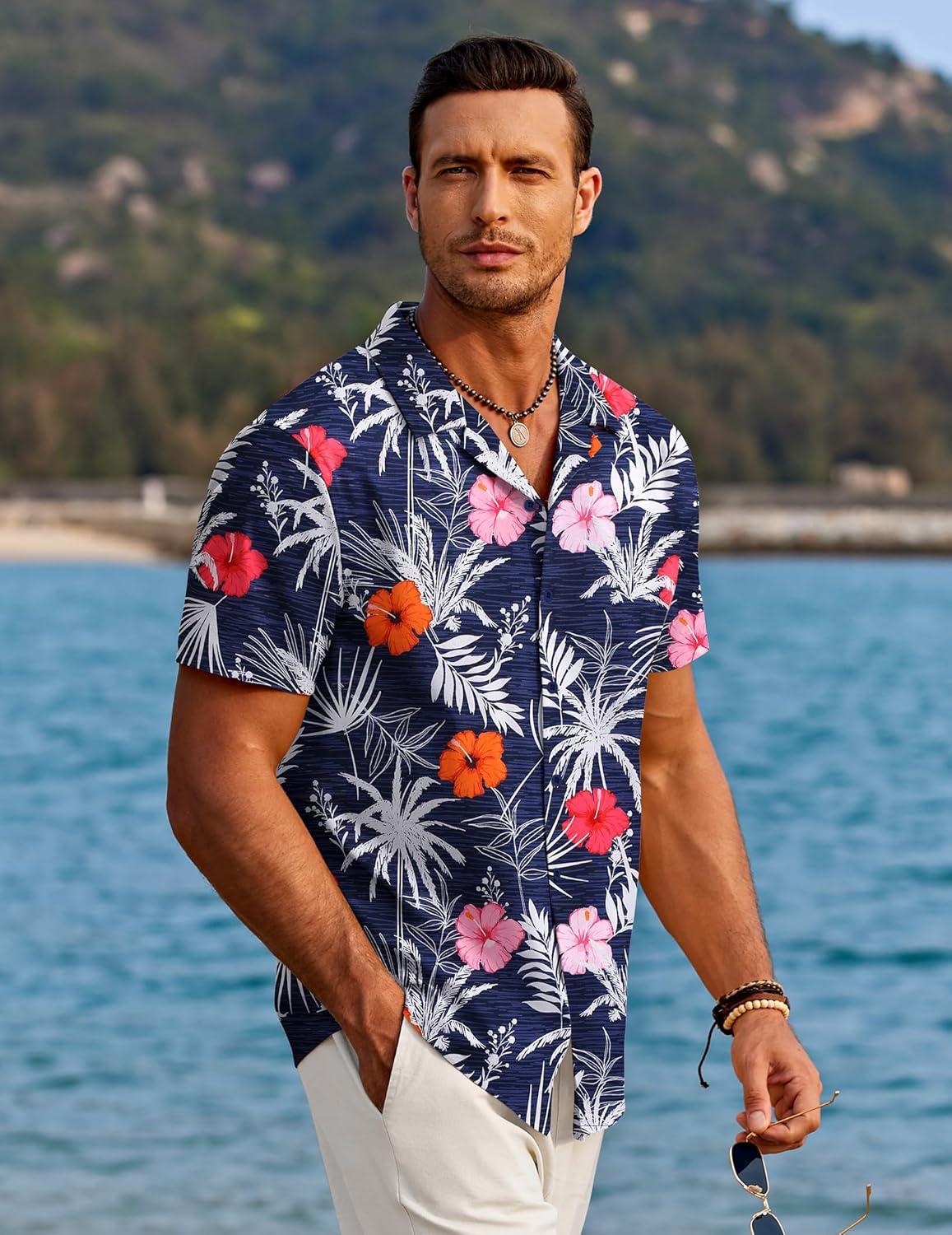 COOFANDY Mens Hawaiian Short Sleeve Shirt Casual Button Down Summer Beach Vacation Shirt Tropical Floral Aloha Shirts(Hibiscus Leaves-blue)