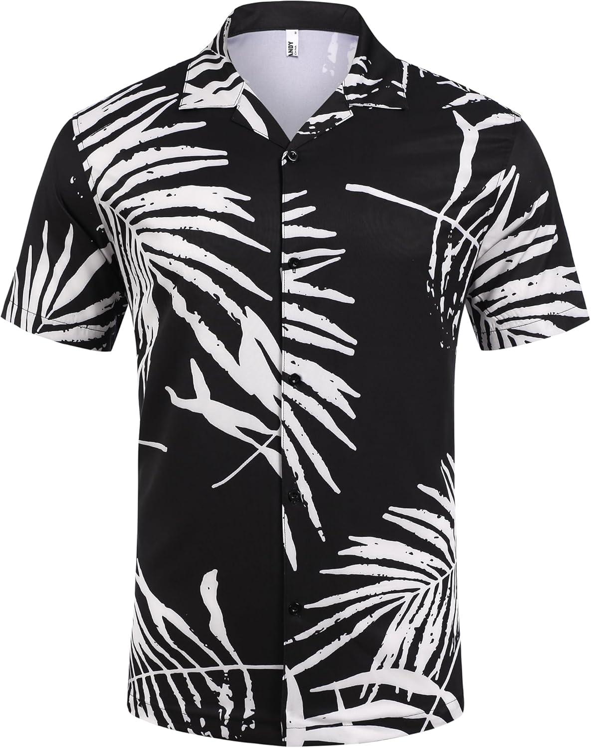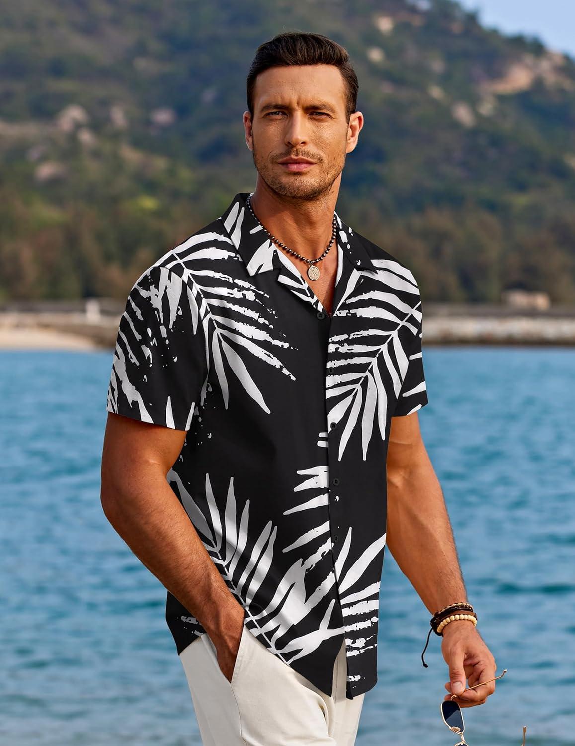 COOFANDY Mens Hawaiian Short Sleeve Shirt Casual Button Down Summer Beach Vacation Shirt Tropical Floral Aloha Shirts(White Leaves-black Print)